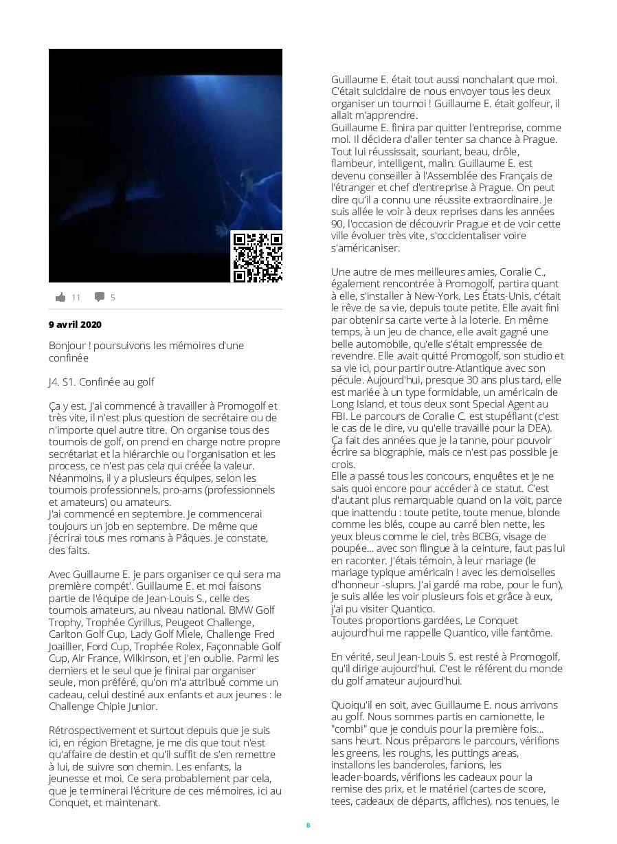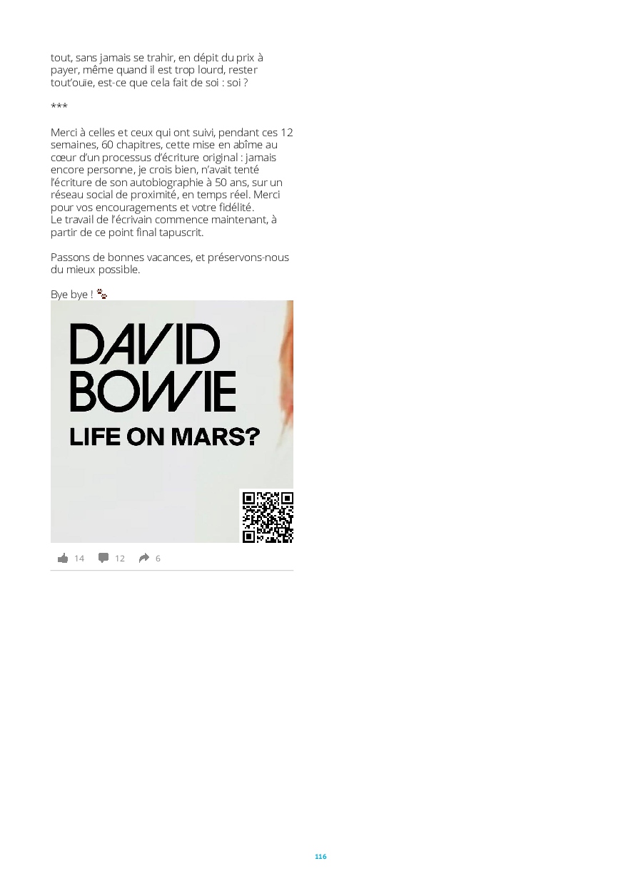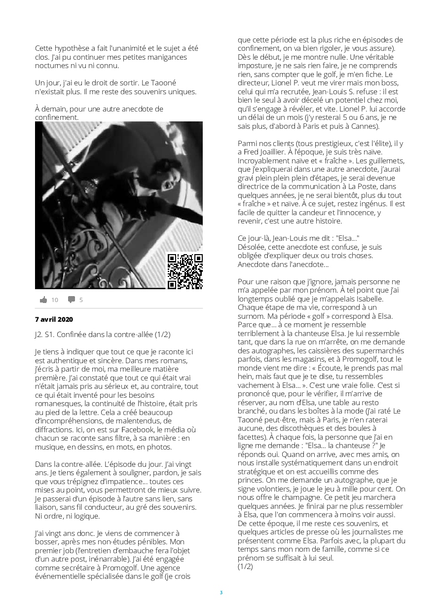 Ce feuilleton Facebook débute le 6 avril ; il dure 12 semaines à raison de un billet par jour, du lundi au vendredi.