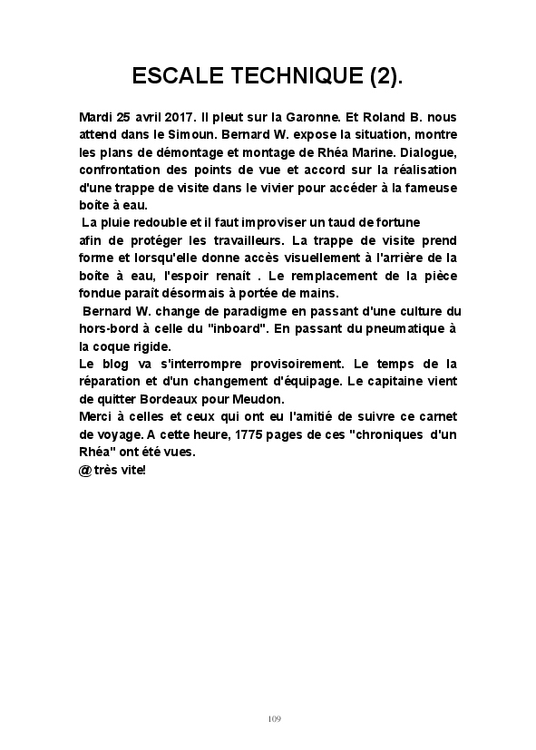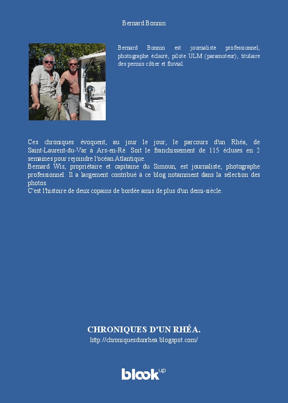 Ces chroniques évoquent, au jour le jour, le parcours d'un Rhéa, de Saint-Laurent-du-Var à Ars-en-Ré. Soit le franchissement de 115 écluses en 2 semaines pour rejoindre l'océan Atlantique.