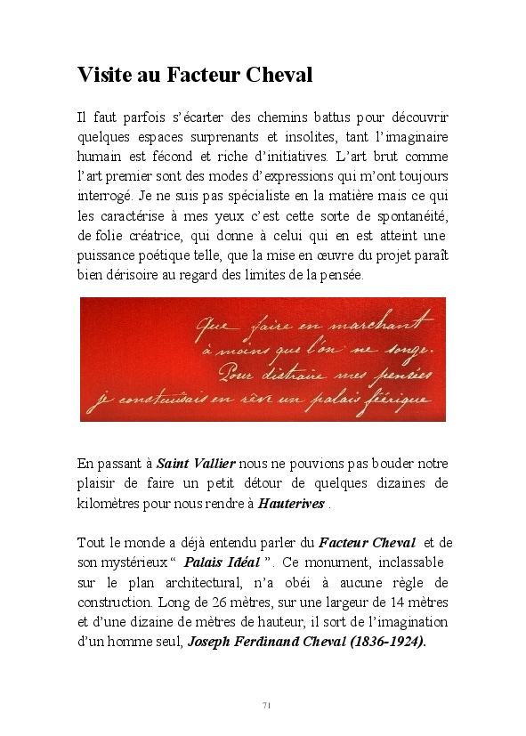 Que ce soit la Nationale 7 ou la Route 66, guidé par l'esprit d'aventure d'un Jack Kerouac ou la lumière des phares de marins, la découverte d'un pays reste pour moi une expérience enrichissante. Ne cherchant pas à collectionner les "on a fait" sur une hypothétique liste de sites touristiques à visiter, un arrêt au bord d'une route, une conversation impromptue avec un habitant, la visite d'un lieu insolite, pour chasser la belle image et avoir le plaisir d'entretenir un carnet de voyage, cela donne un autre sens au mot voyage.