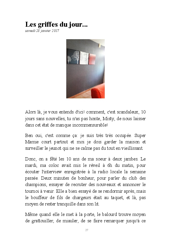 La suite des aventures de Misty, chatte geek et débrouillarde. La minette blogueuse raconte sa vie, et celle de la famille de Super Mamie. Parfois relayée par l'ancêtre Bouboule,et le jeunot Gizmo, elle continue à nous faire le récit de la cohabitation humano-féline.