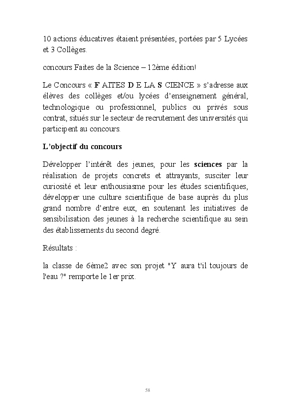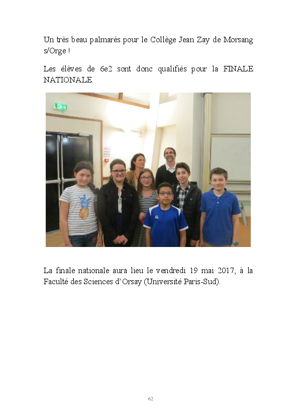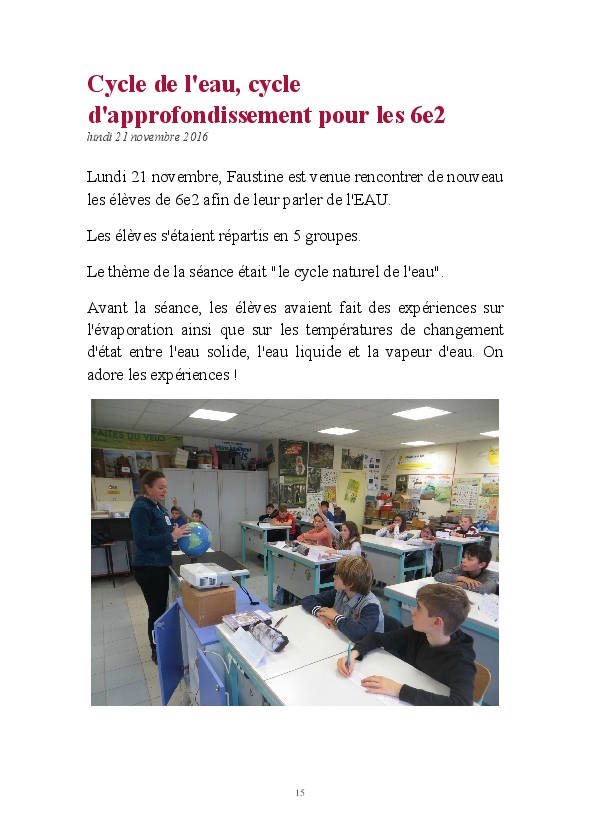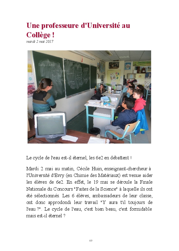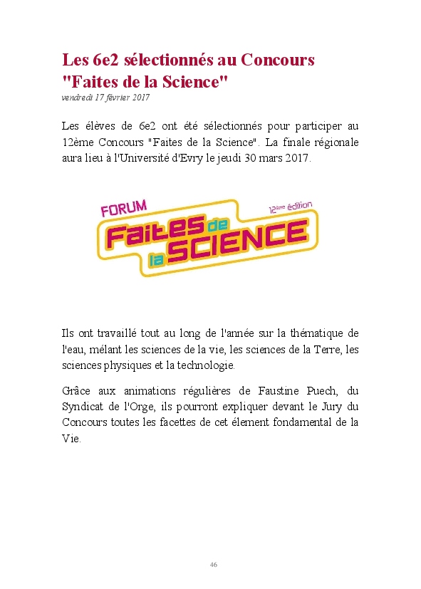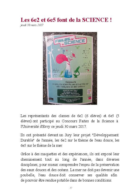 2016/2017 : première année d'une nouvelle réforme du Collège. Au Collège Jean Zay, chaque classe de 6ème a quatre heures de Sciences et un seul professeur. Grâce au dynamisme de Monsieur Chavanne, leur professeur de Sciences, les 6e2 ont pu réaliser tout un tas d'activités de sciences : des expériences, des sorties, des animations, des rencontres avec des intervenants extérieurs, ... . L'année a été riche, variée, distrayante et enrichissante. De plus, les 6e2 ont participé au Concours Faites de la Science avec un projet intitulé "Y aura t-il toujours de l'eau ?". Ils ont obtenu la première place !