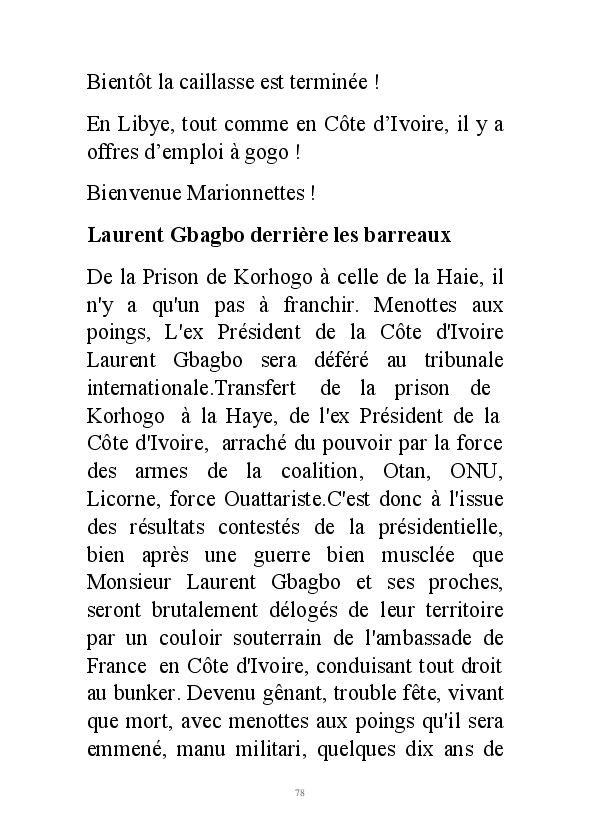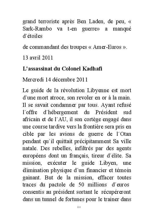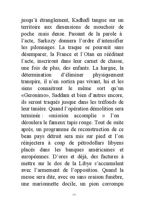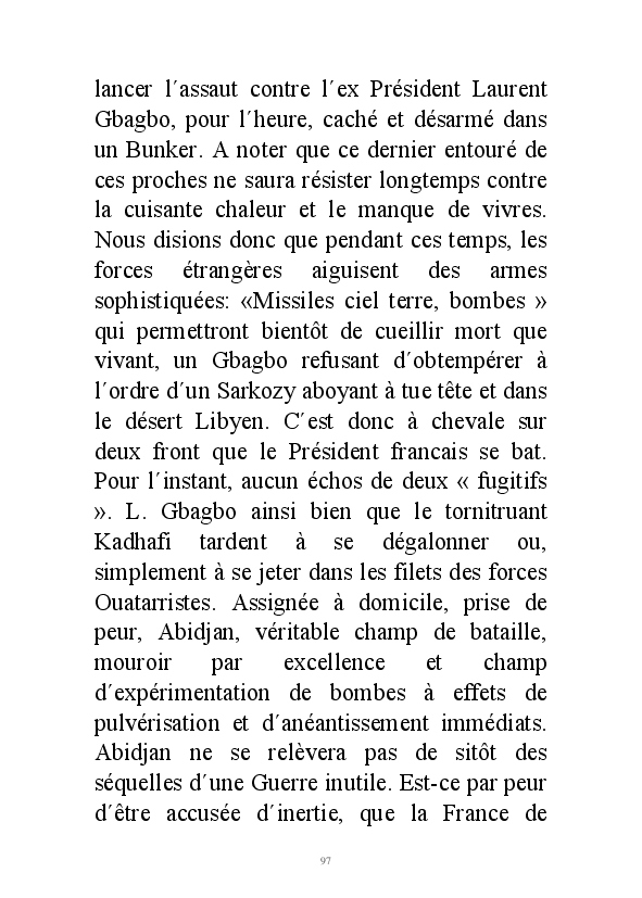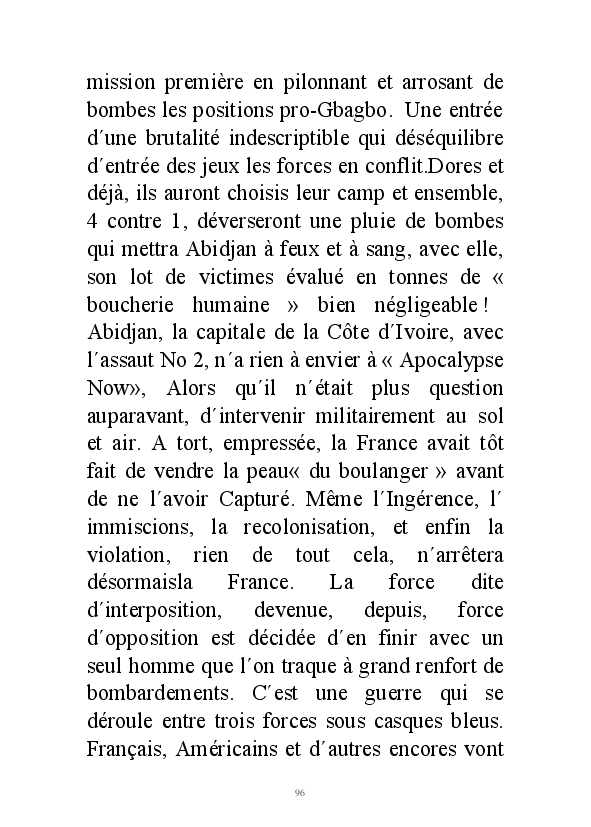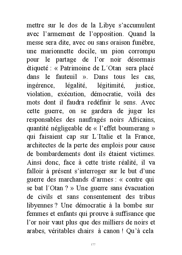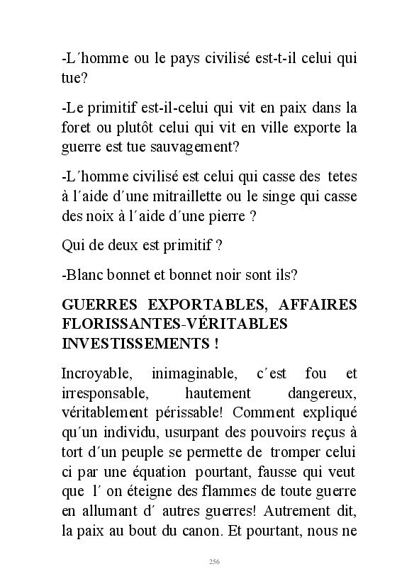Des foyers de tensions se sont allumés ici et là depuis 2003 avec les guerres de Bush, contre Saddam, de Sarko-phage en Côte d'ivoire, Libye contre Kadhafi provoquant des flux migratoires, Organisations de paix, fabricants d'armes plongent dans l'arène des fauves, des armes pleuvent dans le ciel, résurgence du terrorisme Self-made; incendiaires d'hier, aujourd'hui anges de la paix, le tout, dans une dramaturgie démentielle, diabolique.Conséquence du carton de vote dans l'urne pour un bandit d'état, un va-t-en-guerre!
