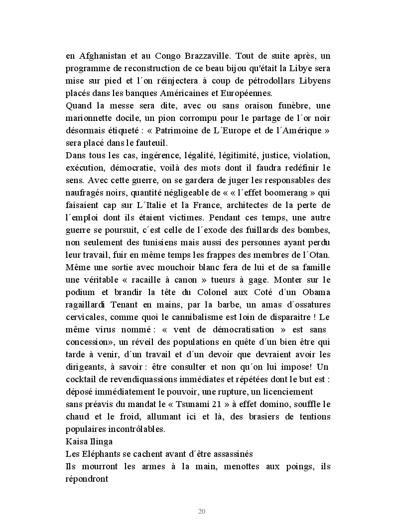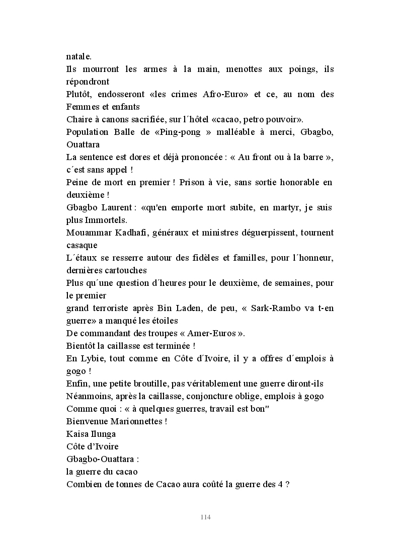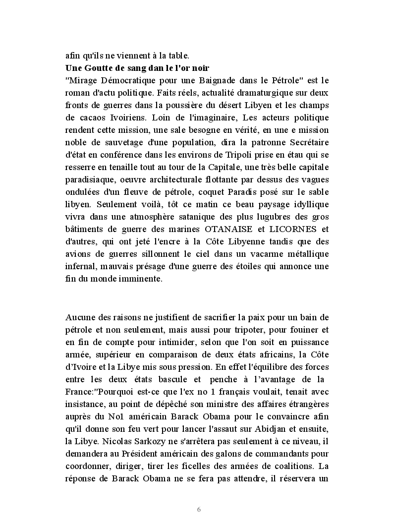 Roman d'actu polit. faits réels, dramaturgiques sur deux fronts Abidjan-Tripoli. Loin de l'imaginaire, les Présidents-commanditaires transforment la sale besogne en sauvetage "Licorne", noble. Sarko s'agite, l'étau se resserre, Bâtiments à canons, chasseurs sillonnent le ciel, déluge, caillasse de Tripoli, assassinat et putsch kadhafi, ingrédients explosifs du Nouveau Désordre Mondial,pour M.r, Obama:"c´était une erreur!",il y a eu overdose de démocratie, trop tard!