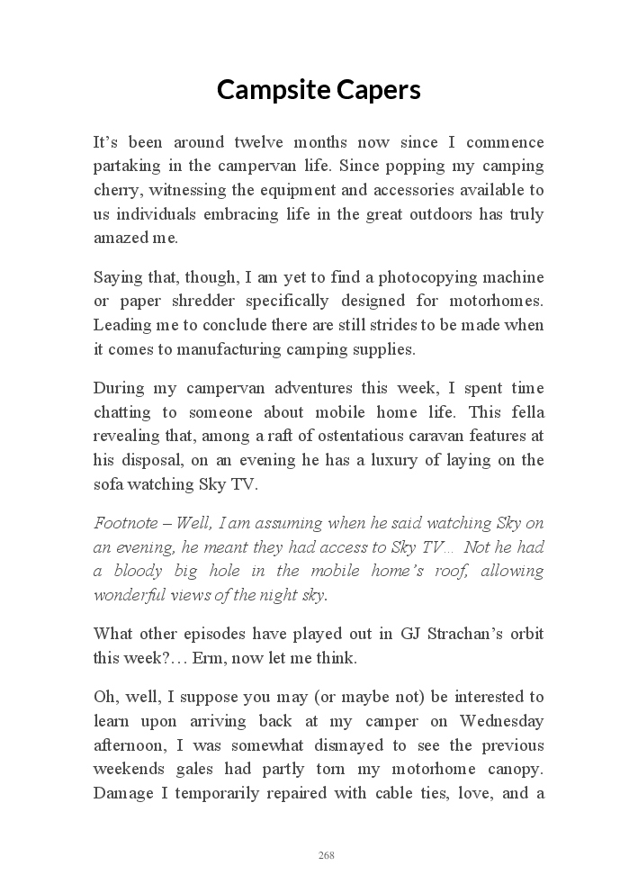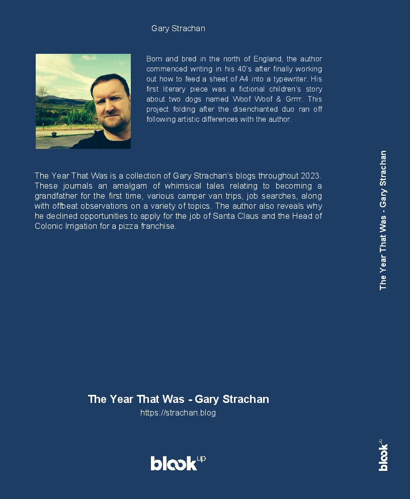 The Year That Was is a collection of Gary Strachan’s blogs throughout 2023. These journals an amalgam of whimsical tales relating to becoming a grandfather for the first time, various camper van trips, job searches, along with offbeat observations on a variety of topics. The author also reveals why he declined opportunities to apply for the job of Santa Claus and the Head of Colonic Irrigation for a pizza franchise.