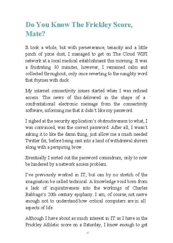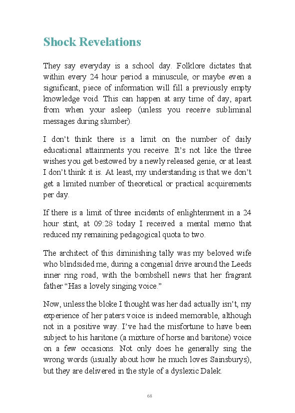 This is the author's inaugural book. Despite enjoying creative writing, the author has never found the discipline or enthusiasm to finish stories and ideas. Putting this down to lack of direction, along with an inability to find the right vehicle to utilise these skills. In this book of the vehicle is a selection of blogs. This vehicle has had one careful owner, has ten months left on its MOT and seven months road tax. As such he hopes it is reliable and gets him to where he wants to be! He hopes you enjoy reading this as much as he did writing it............ After all why should I be the only one to suffer?!