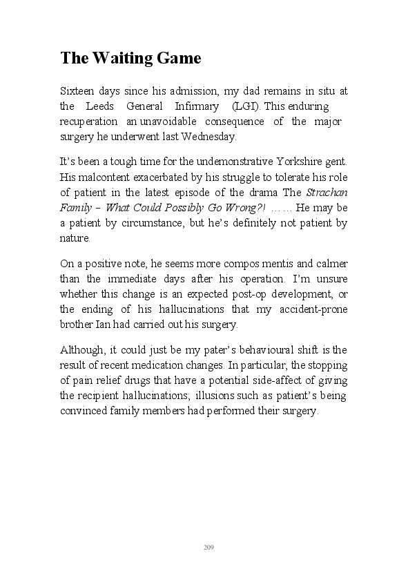 'Prose & Cons' provides excerpts from the author's darkly humorous daily diary blogs in June 2017, in association with a selection of sonnets. Poetry a new literary challenge for Mr Strachan, inspired by his keen eye for the pretentious. Subjects within this tome include his father's hospital admission, a good riddance to the month of June and noticing the Scarbrough pub in Leeds is spelt wrong. Born with only one head, the author is adapting to his 'difference'.