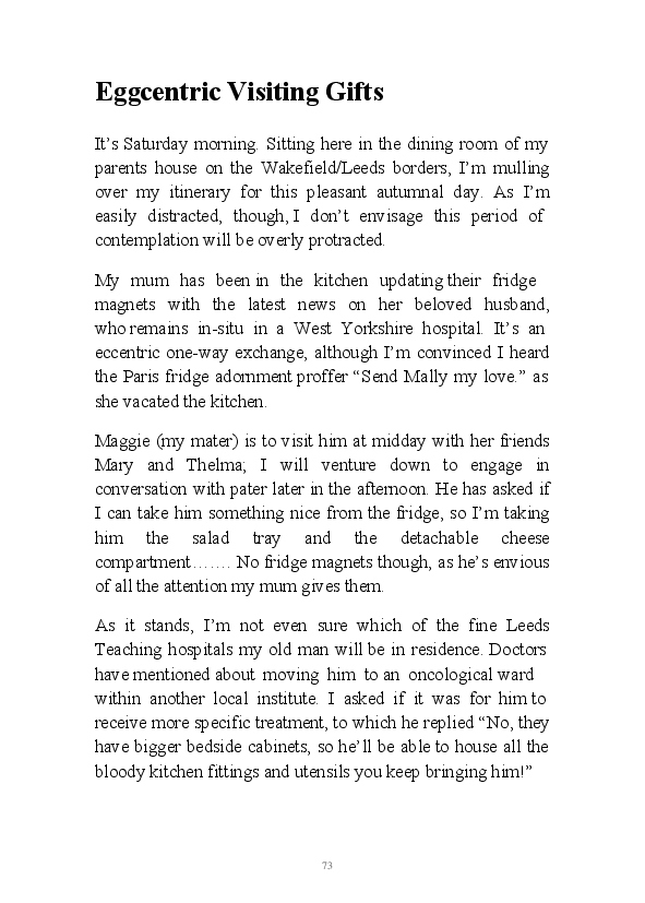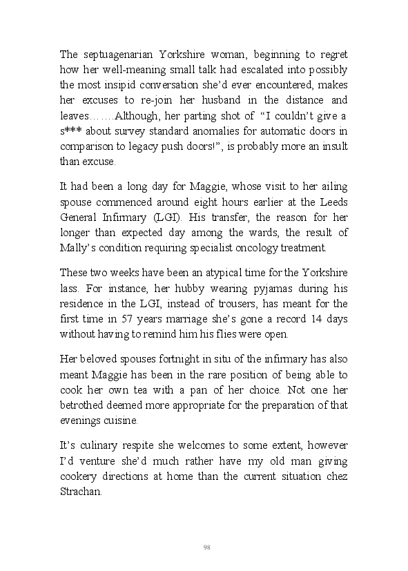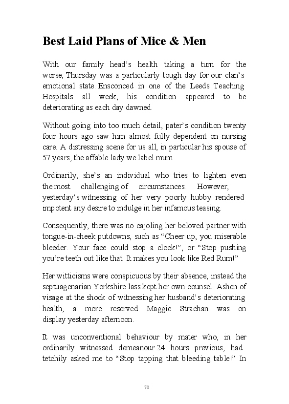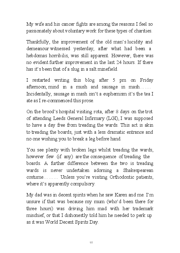 A challenging month for the author and his family, this soupcon of partly fictional monologues regularly touches on his father and his wife's terminal illnesses. This morning his erratic mind randomly picked up the fact that the word hospice sounds like hoss piss.