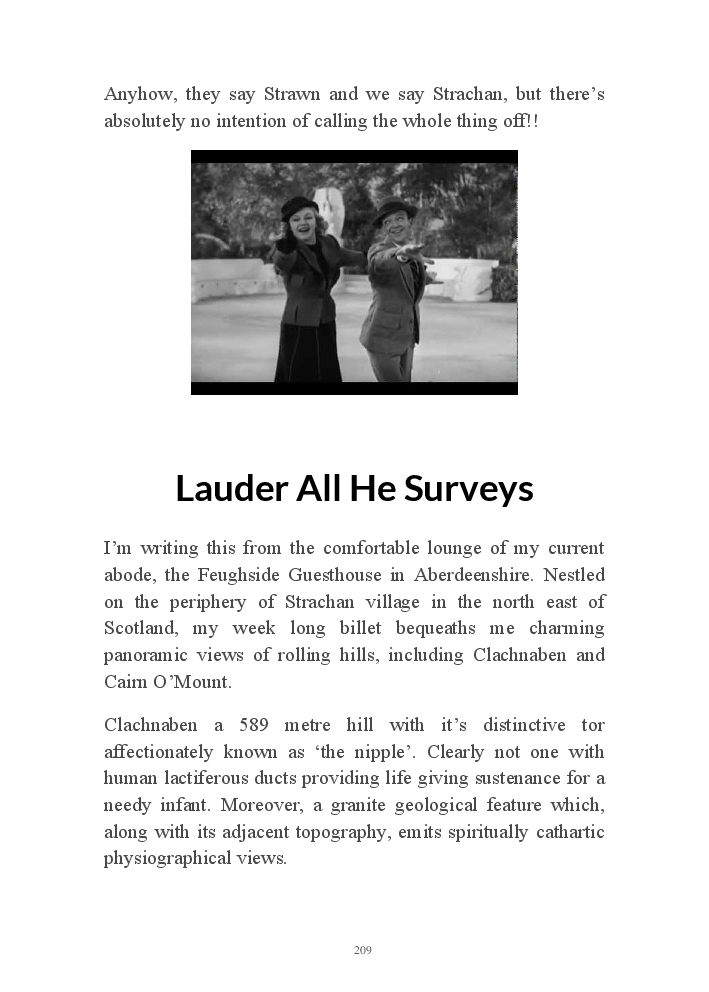 Motherland Meanderings is a selection of the authors musings during the summer of 2019. Amongst them his venture to Aberdeenshire for a Strachan clan gathering, where he stayed in the village of his forefathers. Men and women who through the centuries left their Scottish domicile due to economic hardship and a George Baileyesque desire for travel/adventure. Most of the ex-pats kin not returning until this get together on Monday 29th July 2019. Mr Strachan would like to thank his uncle Archie for explaining what hochmagandy meant prior to his vist north.