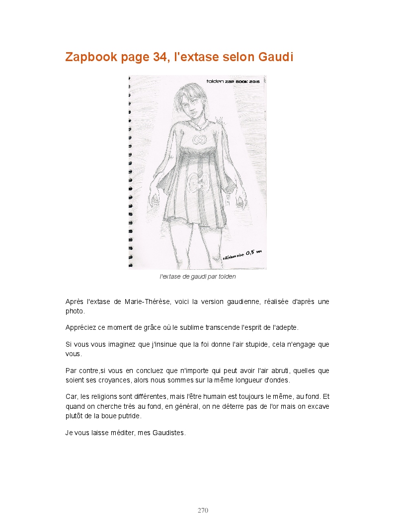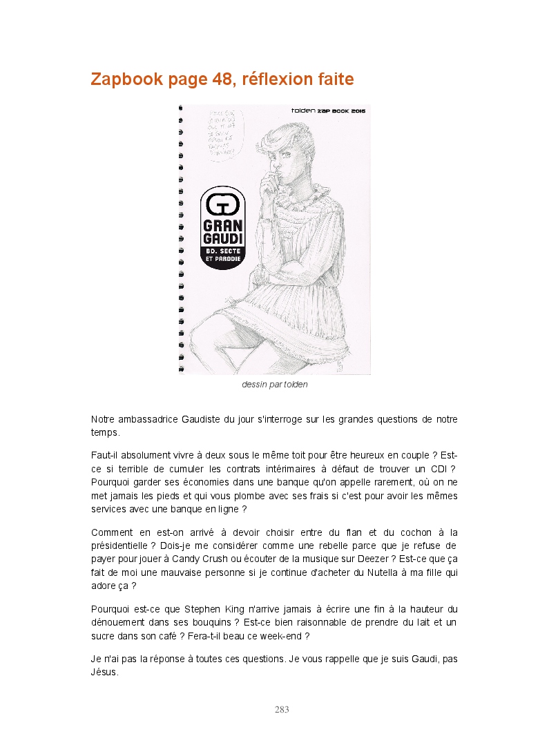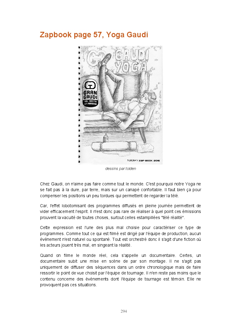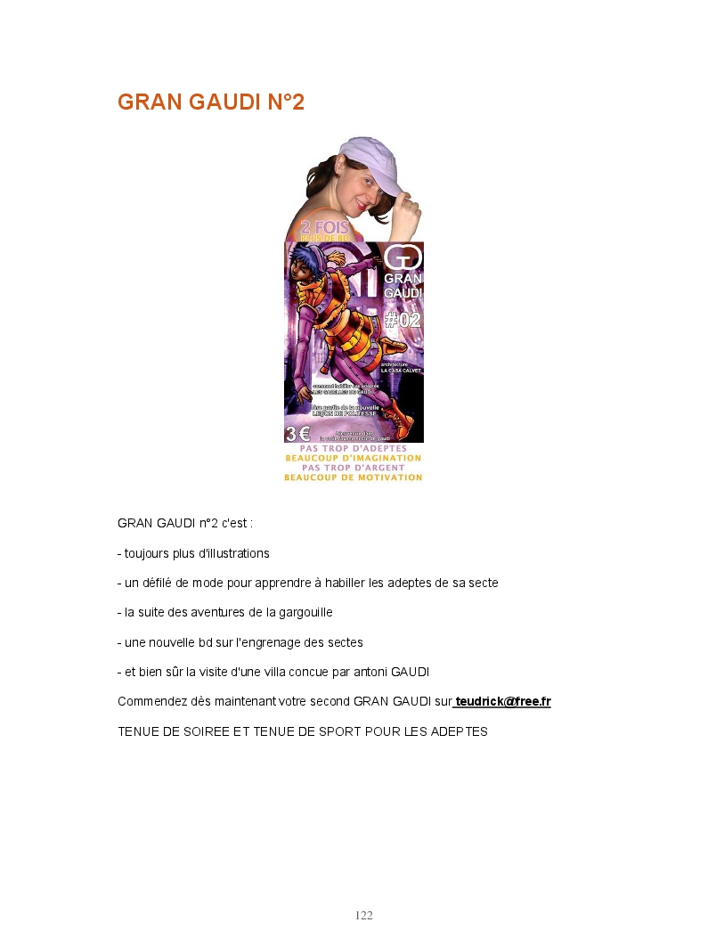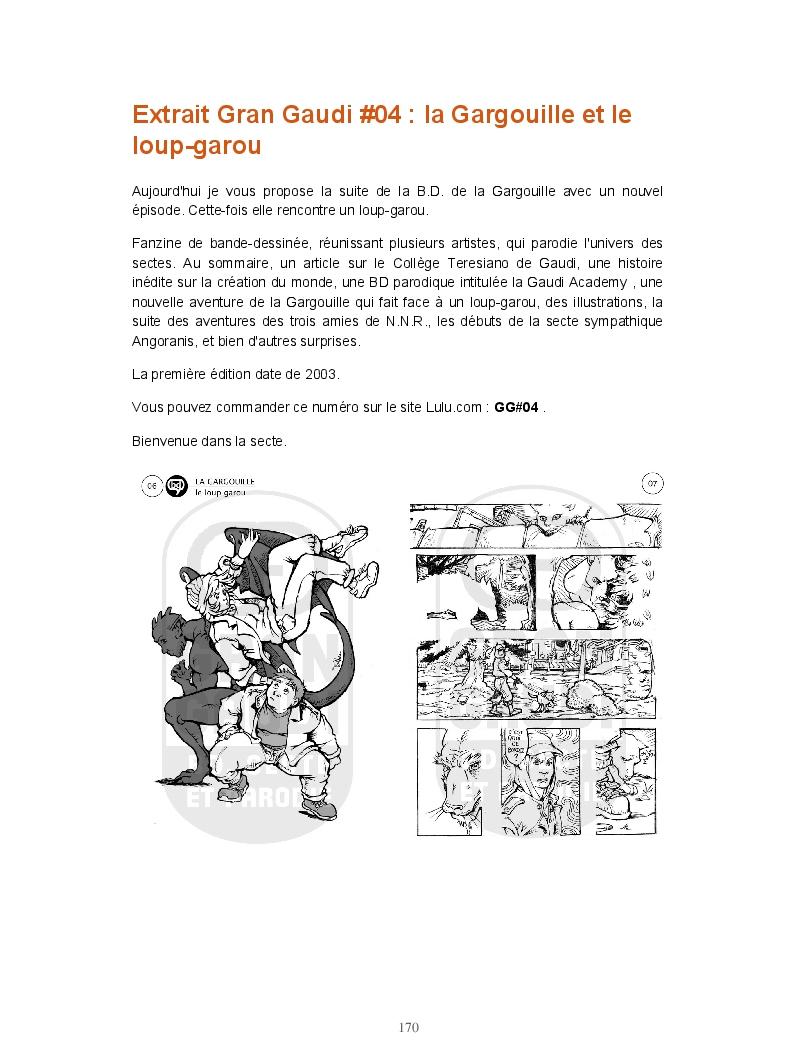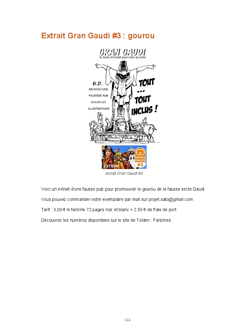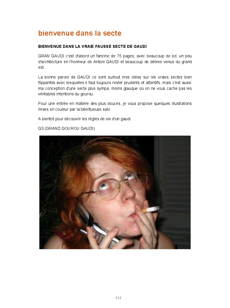 Ce livre réunit les publications du blog Gran Gaudi. Tout comme le fanzine, il parodie l'univers des sectes. Ce sont les dessins qui sont à l'honneur ici.
