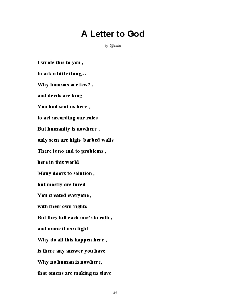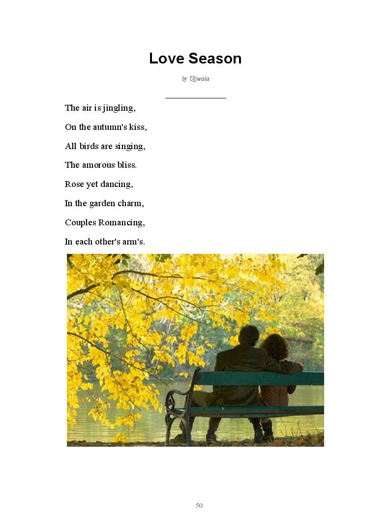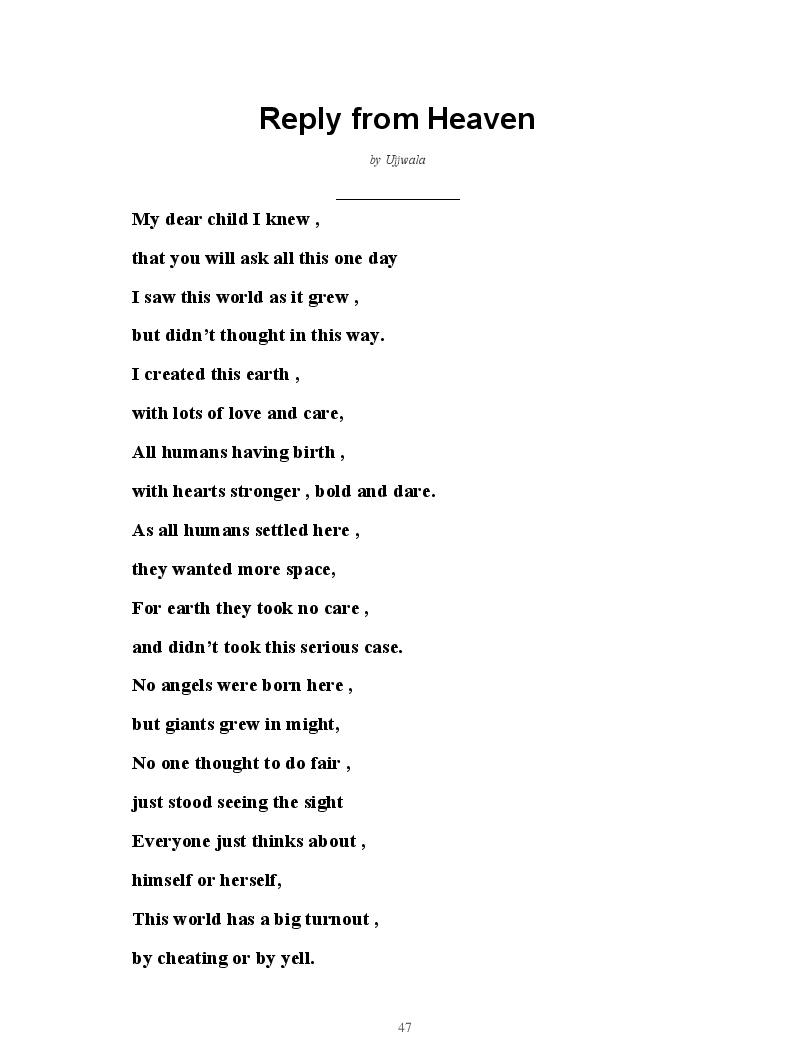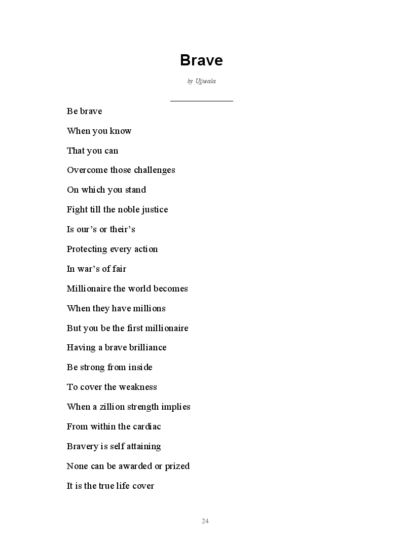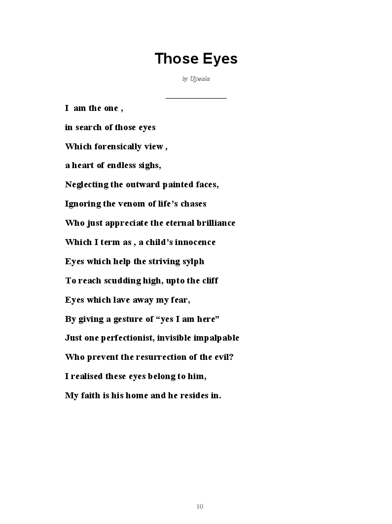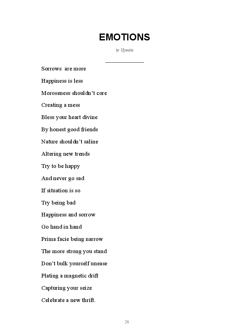 Poetry is one's feelings in a few lines. Some of the poetries in this book depict a normal person's feeling. One can find themselves in such situations and they can feel what goes on in the poem is a real life deal.