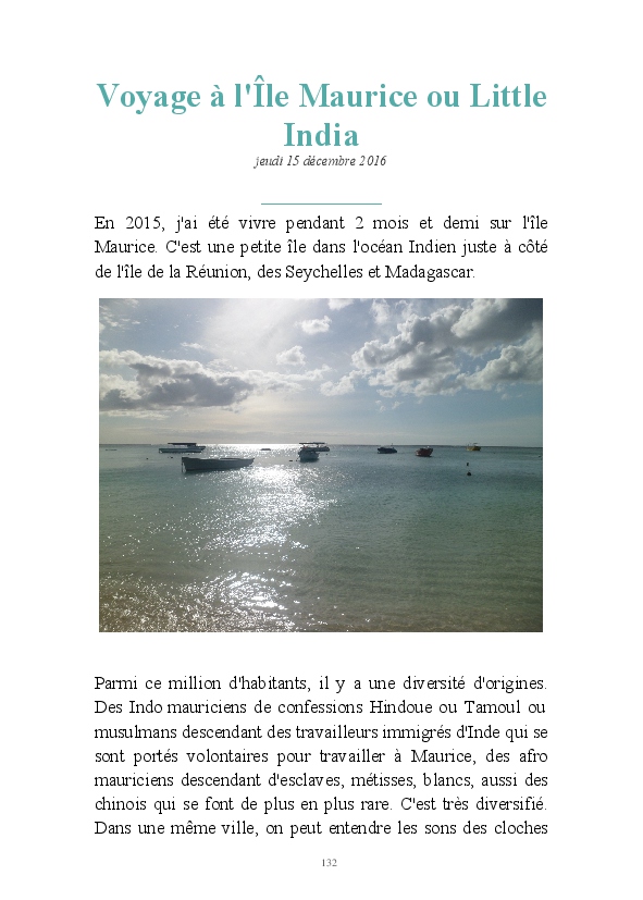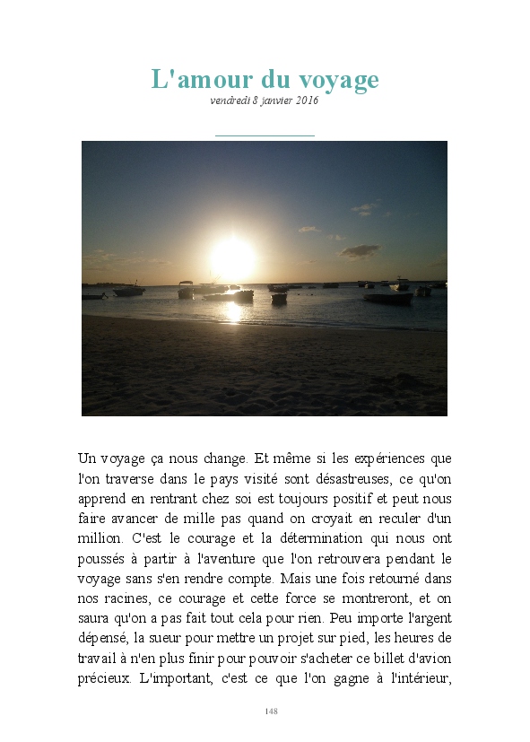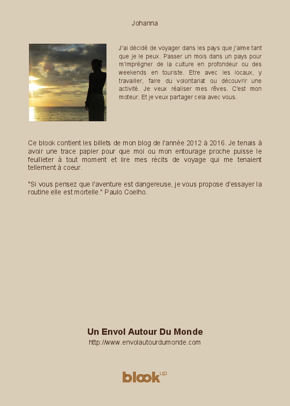 Ce blook contient les billets de mon blog de l'année 2012 à 2016. Je tenais à avoir une trace papier pour que moi ou mon entourage proche puisse le feuilleter à tout moment et lire mes récits de voyage qui me tenaient tellement à coeur.