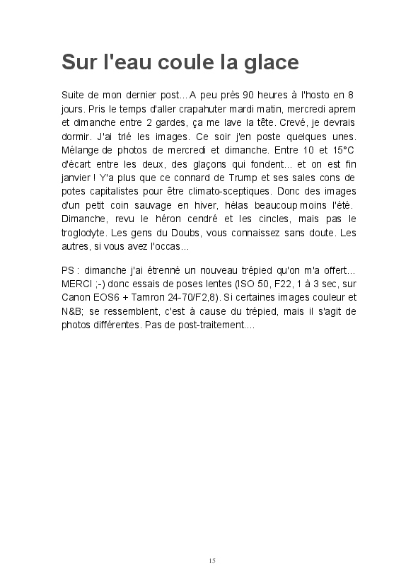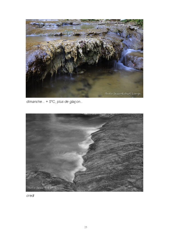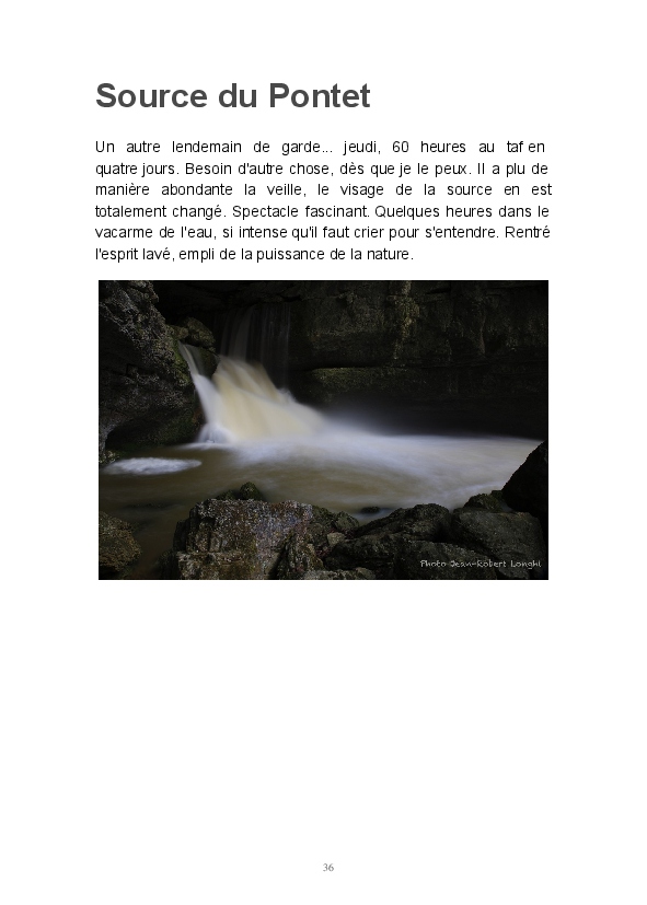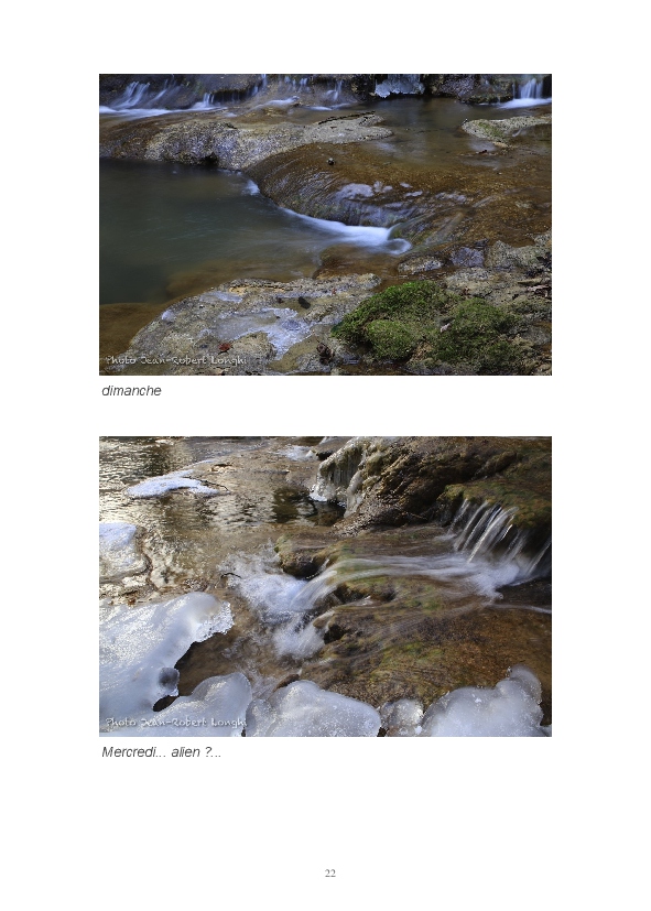 Ce livre est ma première publication sur papier. Il est constitué d'articles postés ces dernières semaines sur mon blog Impressions. J'y partage mon regard sur la Loue en hiver. L'eau, source de vie et de renouveau permanent, est un élément dominant de mon travail. Les photos consacrées aux sources du Pontet et de la Loue sont un hommage à Gustave Courbet et Lucien Clergue, la photographie étant parfois proche de la peinture.