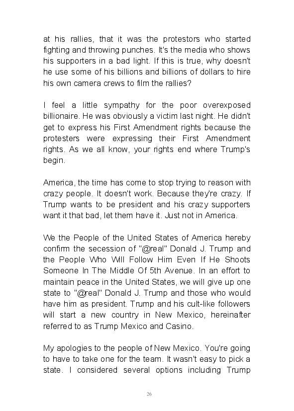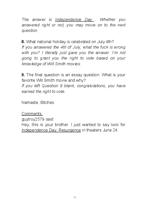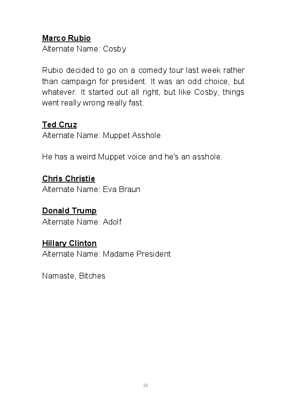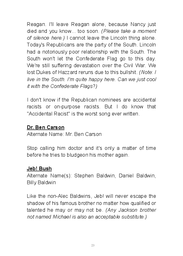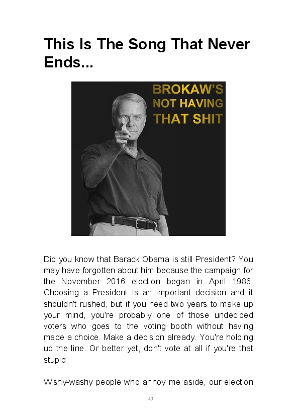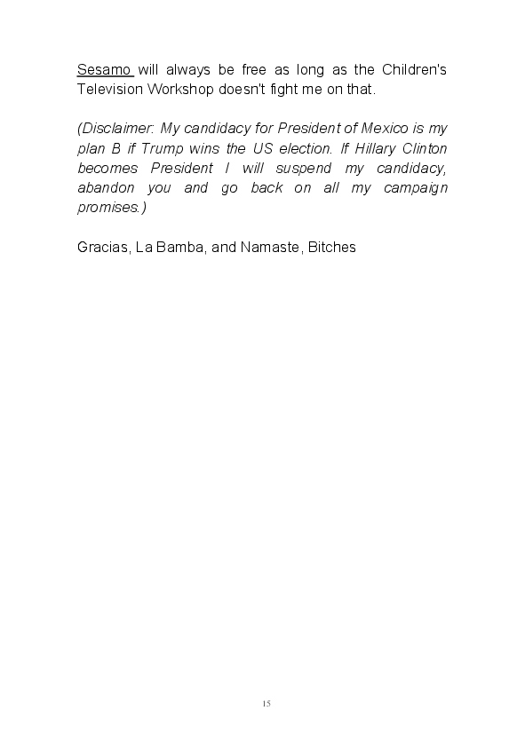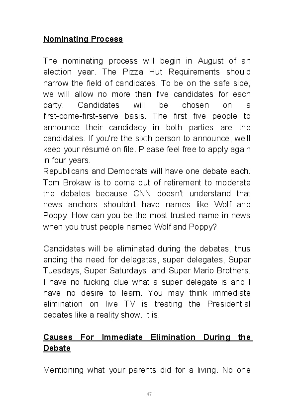 My vote LITERALLY does not count. If you understand anything about the Electoral College I might as well go into the voting booth and write lewd comments all over the walls. [Still an option.] "Third" parties and independent candidates are noble, but so was every redshirt officer aboard the Starship Enterprise. If you don't know what to do, VOTE FOR PEDRO! - Josh