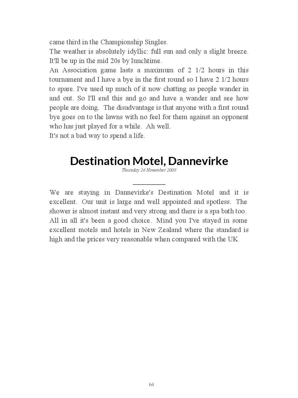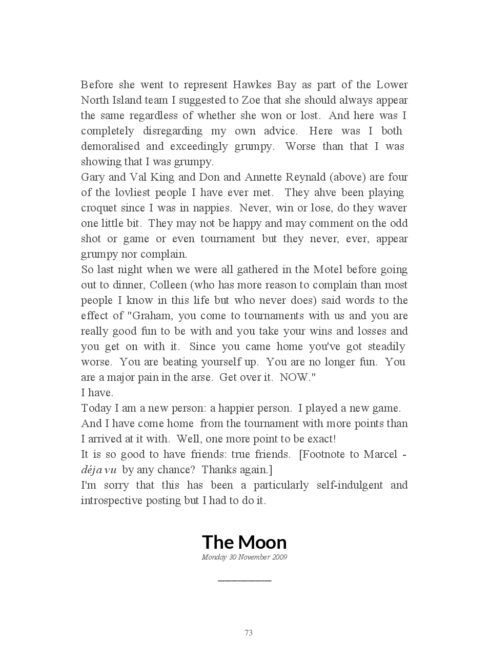 My fourth visit to New Zealand (despite the volumes for the previous visit erroneously making the same claim). My first safari to Northland with Pauline and the start of a long and valued friendship. A good year for croquet titles. Looking back as I write this summary I realise just how wonderful The Family and my life with them was.