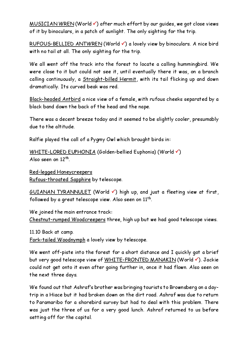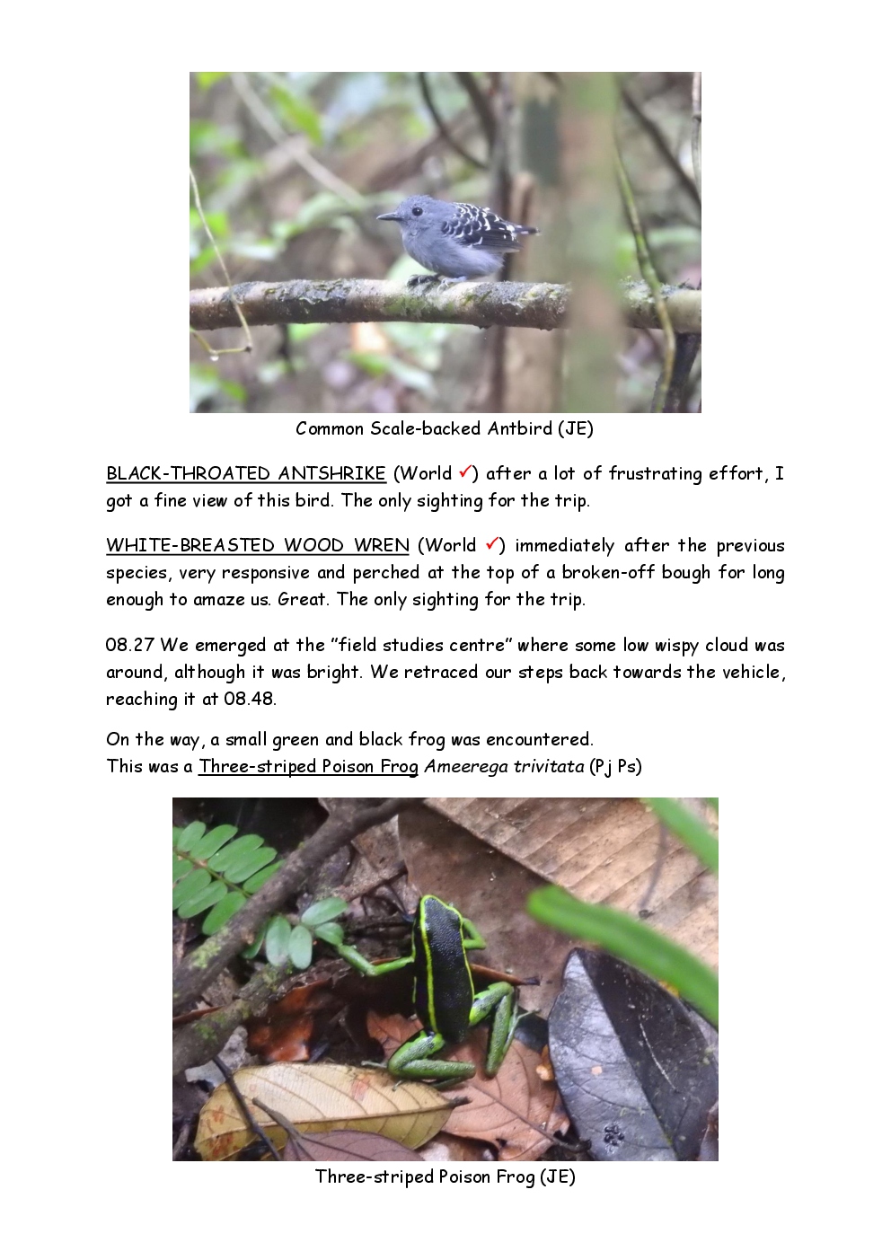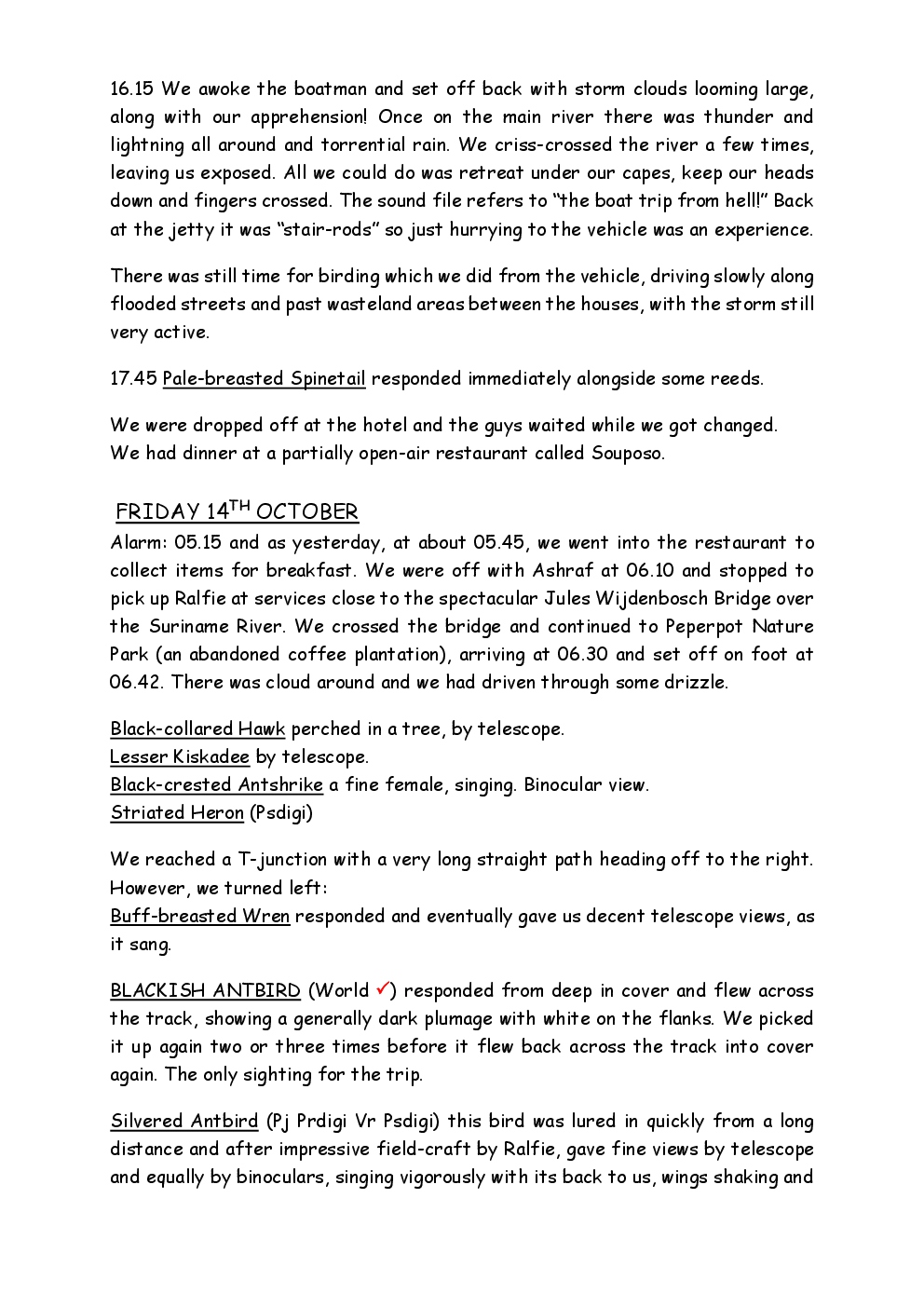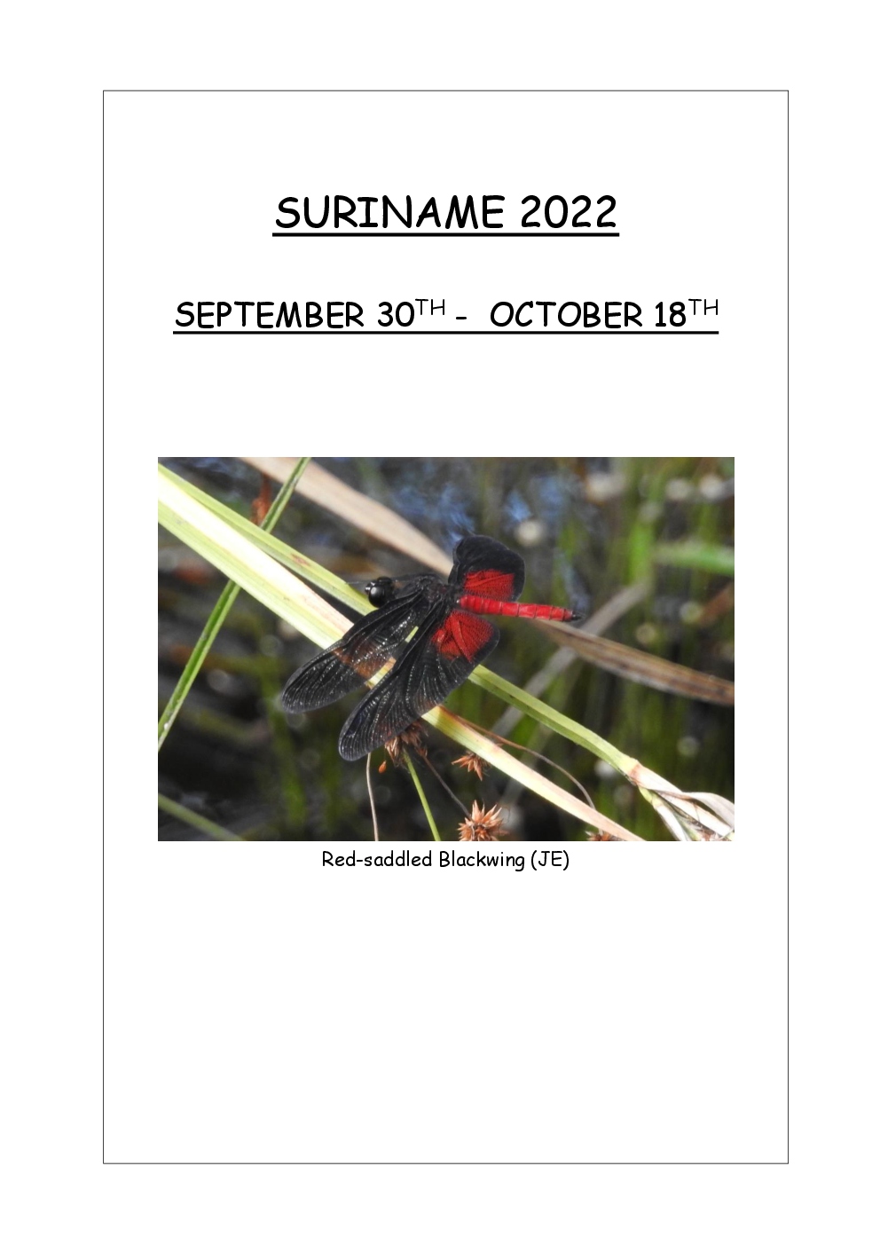 In 2022, Steve and Jackie embarked on a tailor-made birding trip to Suriname, organised by Naturetrek. They hoped to see, amongst many other species of bird, the Grey-winged Trumpeter which they were unfortunate to miss in neighbouring Guyana in 2019. This would complete a long-term project to see species from all of the 108 families of non-passerine birds. They were fortunate enough to have the services of two outstanding bird guides, Ashraf Tilburg and Rasool Boobo Ralfie Aseni both of whom had incredible field-craft and infectious humour, which ensured that a most successful and enjoyable time was had.