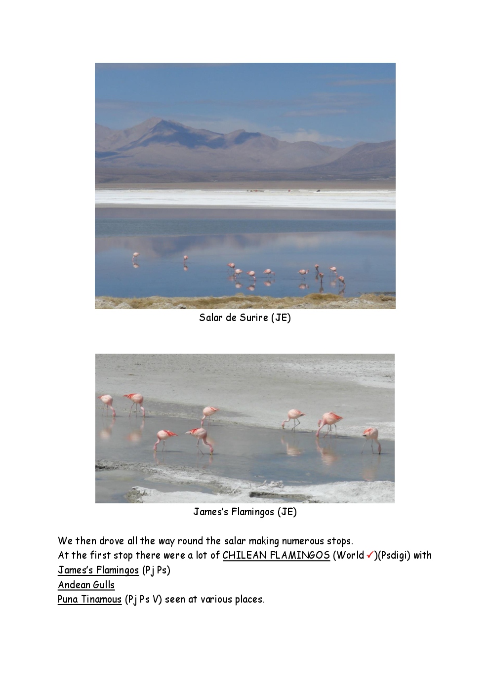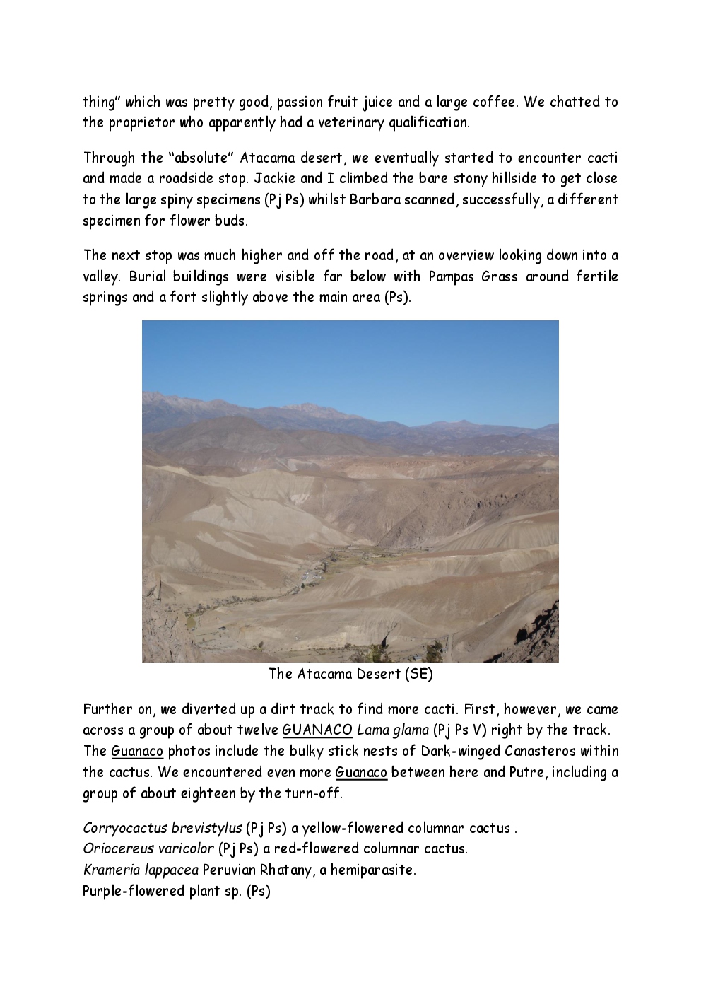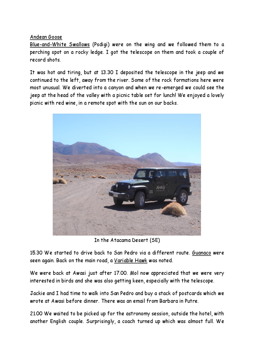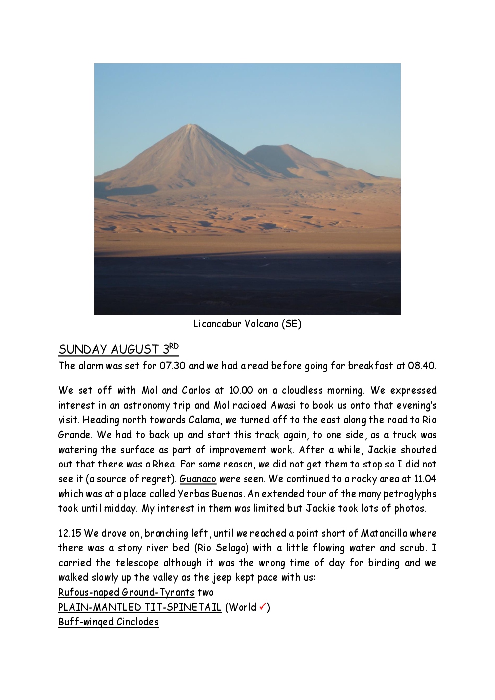 In the summer of 2008, Steve and Jackie travelled to Chile for a 17-day holiday. For the first 10 days they were in the far north of the country with a birding guide, Barbara Knapton, who looked after them as they explored the habitats of the Pacific coast, the Atacama Desert and the Andean Altiplano. For the remainder of the trip, they relocated south to the town of San Pedro de Atacama, based at a boutique hotel, from which they continued to explore the desert and the Altiplano with their guide, Mol and driver, Carlos.