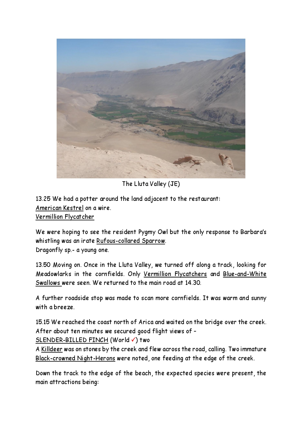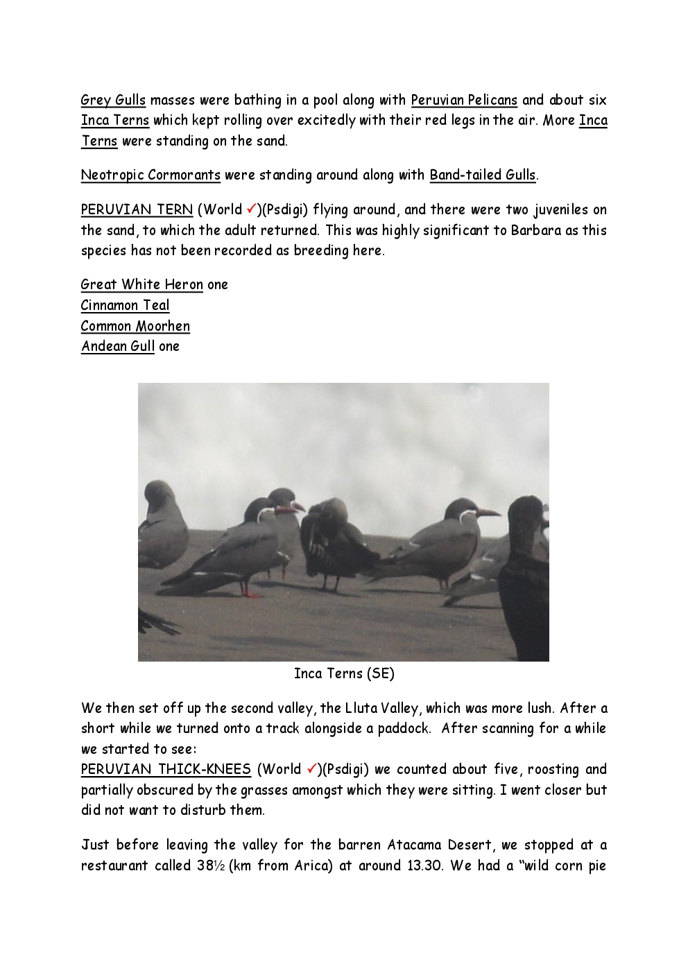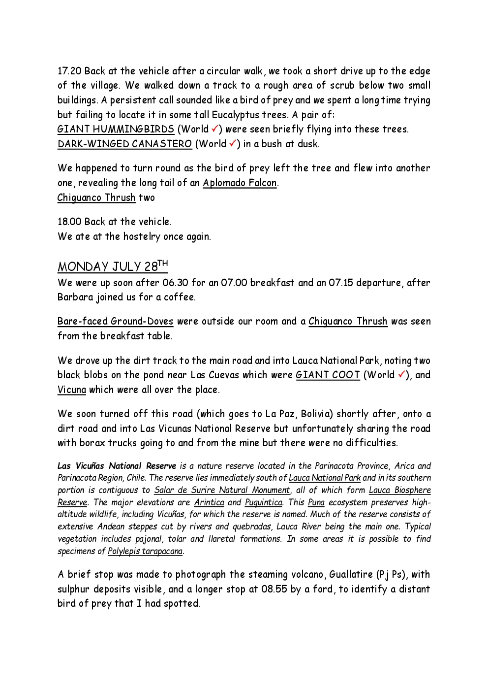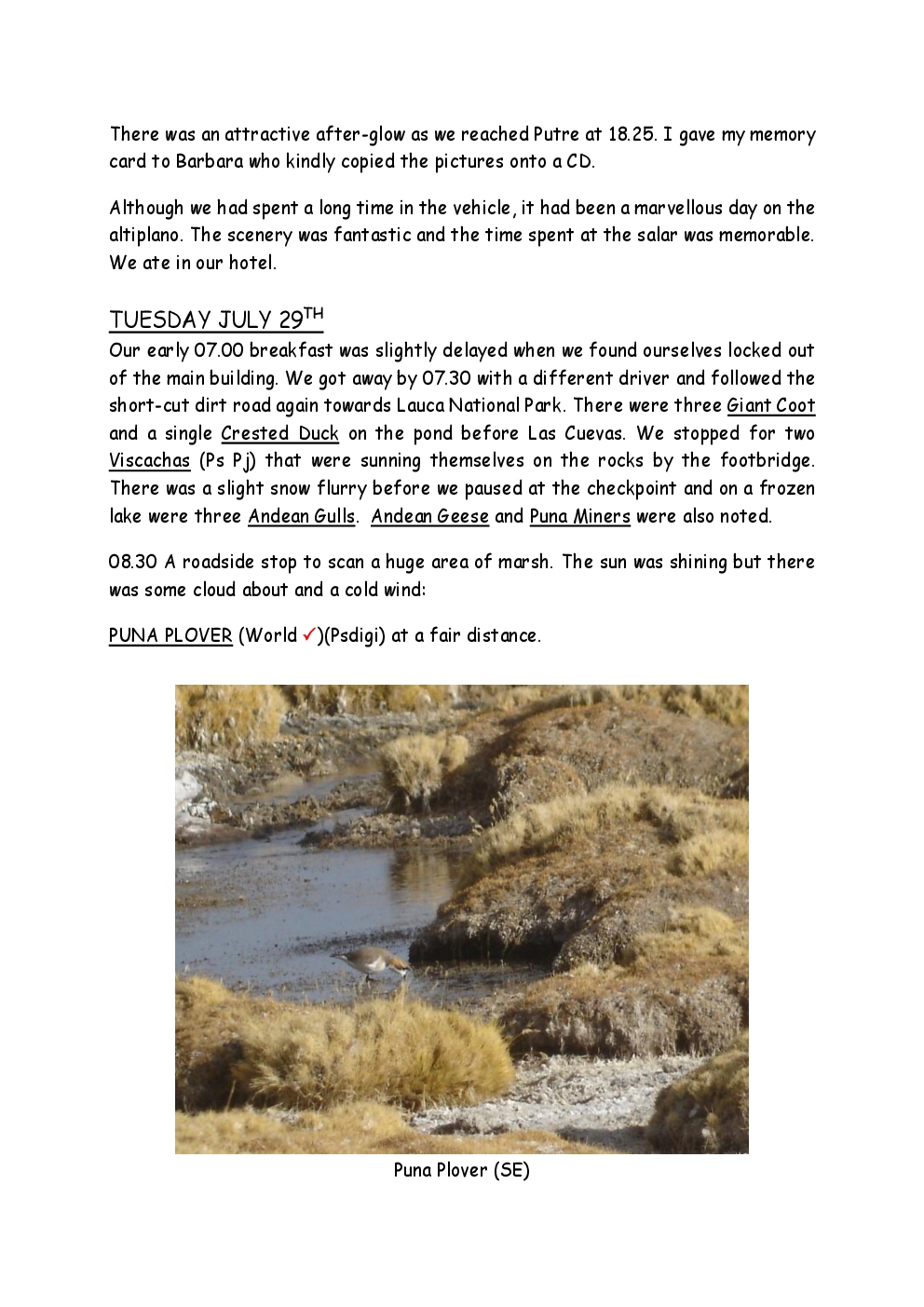 In the summer of 2008, Steve and Jackie travelled to Chile for a 17-day holiday. For the first 10 days they were in the far north of the country with a birding guide, Barbara Knapton, who looked after them as they explored the habitats of the Pacific coast, the Atacama Desert and the Andean Altiplano. For the remainder of the trip, they relocated south to the town of San Pedro de Atacama, based at a boutique hotel, from which they continued to explore the desert and the Altiplano with their guide, Mol and driver, Carlos.