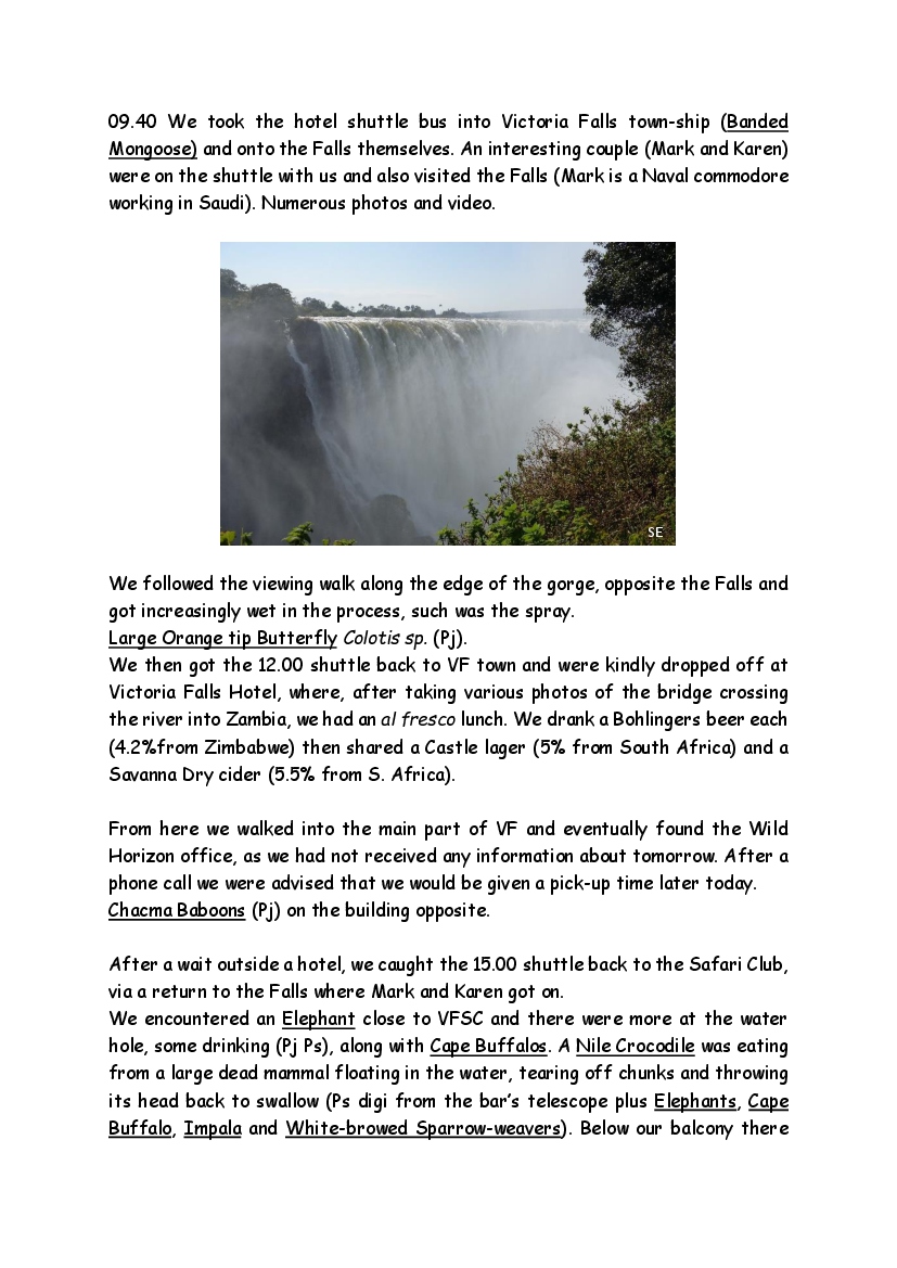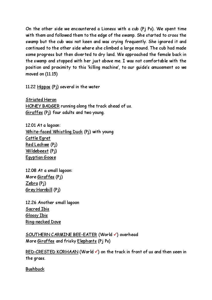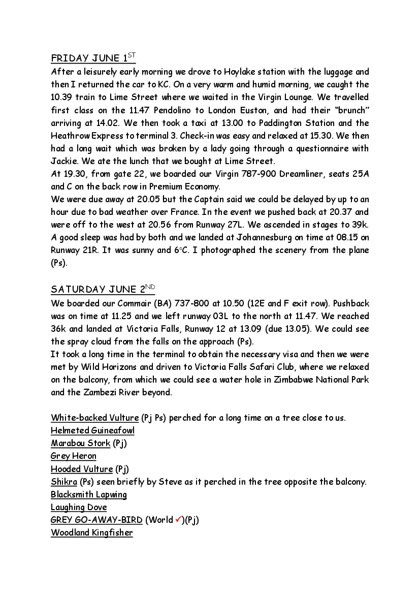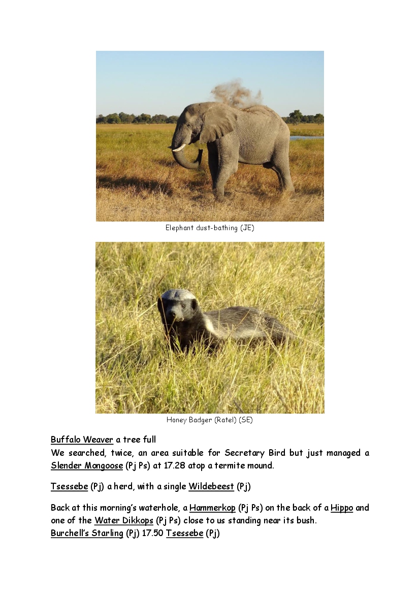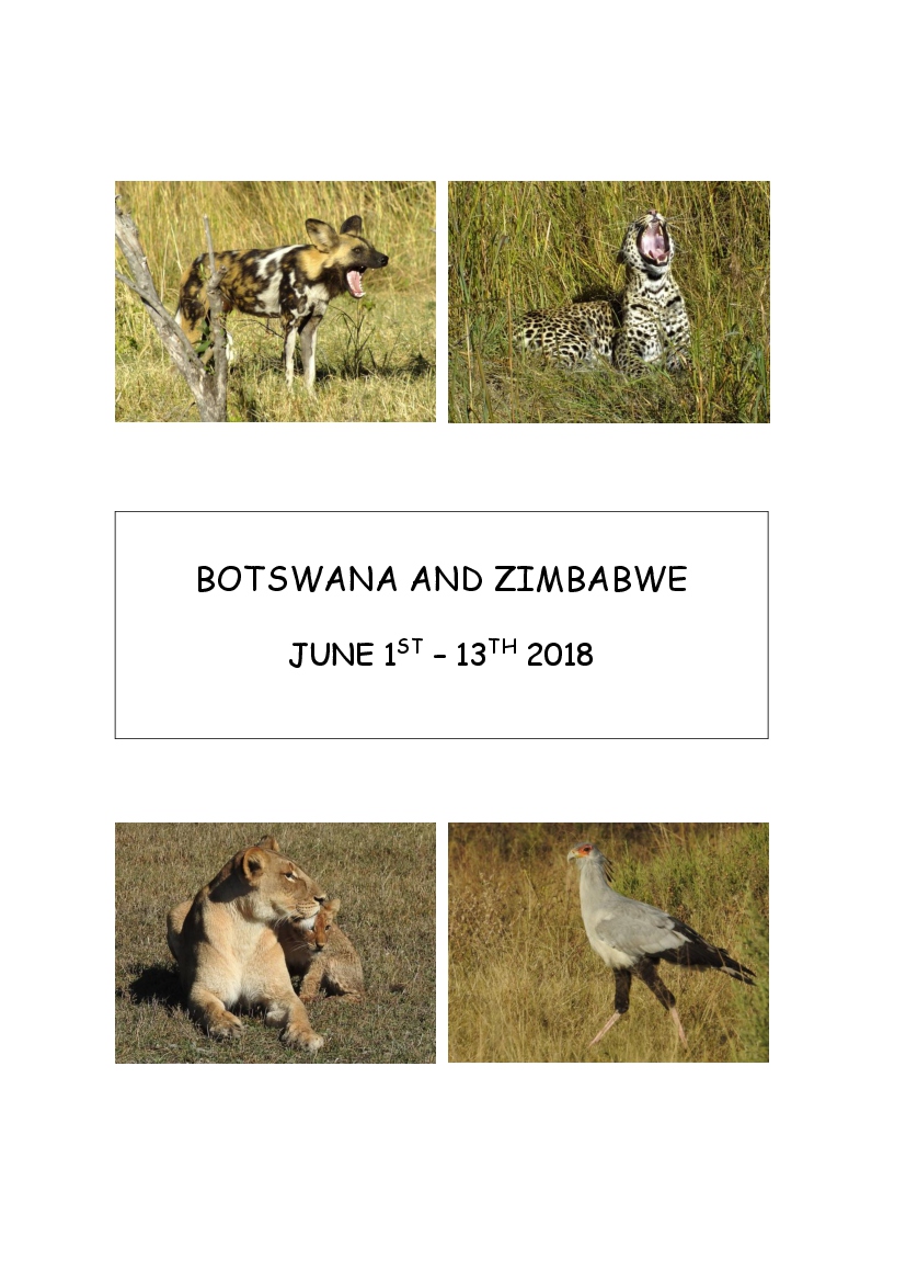 In June 2018, Steve and Jackie returned to Africa. After a visit to Victoria Falls and Zimbabwe National Park, they crossed into northern Botswana and spent time at three tented camps. The first two were close to the border with Namibia and the third was further south, in the Okavango Delta. Transport between the camps was by chartered light aircraft. Two of their most sought-after species were the Painted Wolf (aka African Hunting Dog) and the Secretary Bird. After fifteen game drives and one boat trip, these hopes had been well and truly fulfilled but they did, of course, see much more besides. This is an illustrated account of the trip.