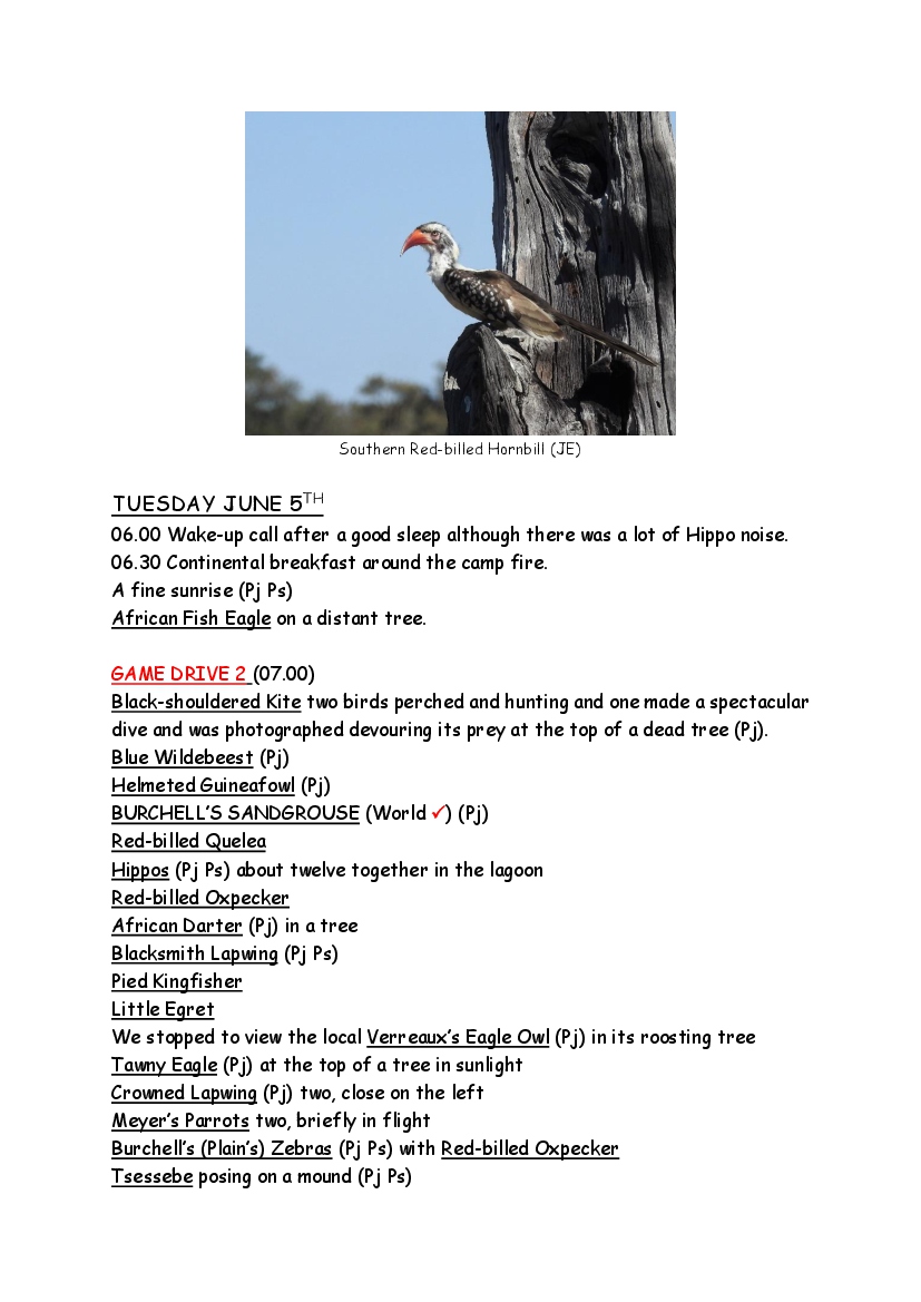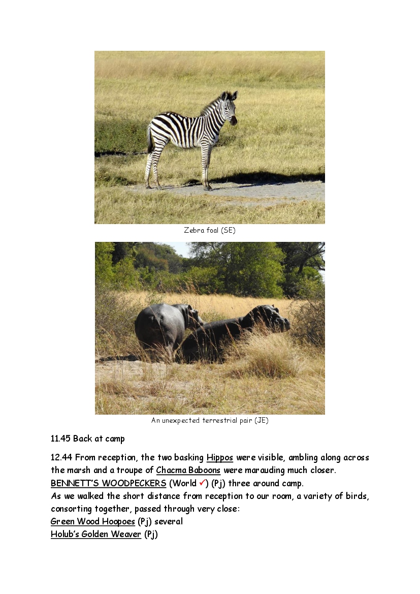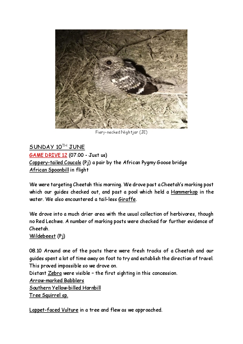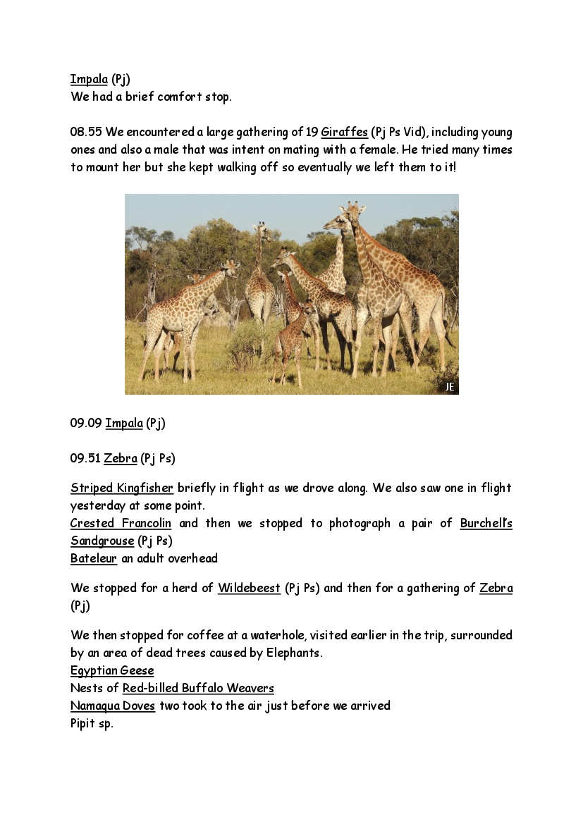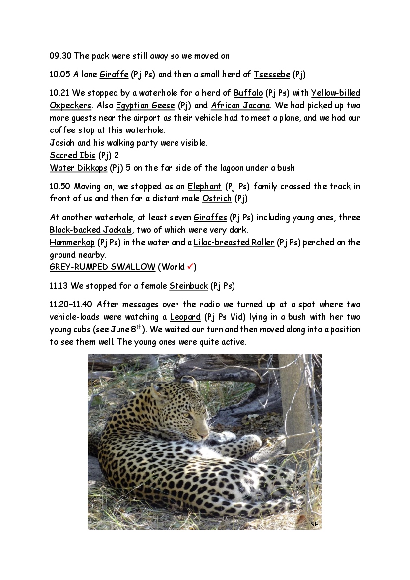 In June 2018, Steve and Jackie returned to Africa. After a visit to Victoria Falls and Zimbabwe National Park, they crossed into northern Botswana and spent time at three tented camps. The first two were close to the border with Namibia and the third was further south, in the Okavango Delta. Transport between the camps was by chartered light aircraft. Two of their most sought-after species were the Painted Wolf (aka African Hunting Dog) and the Secretary Bird. After fifteen game drives and one boat trip, these hopes had been well and truly fulfilled but they did, of course, see much more besides. This is an illustrated account of the trip.