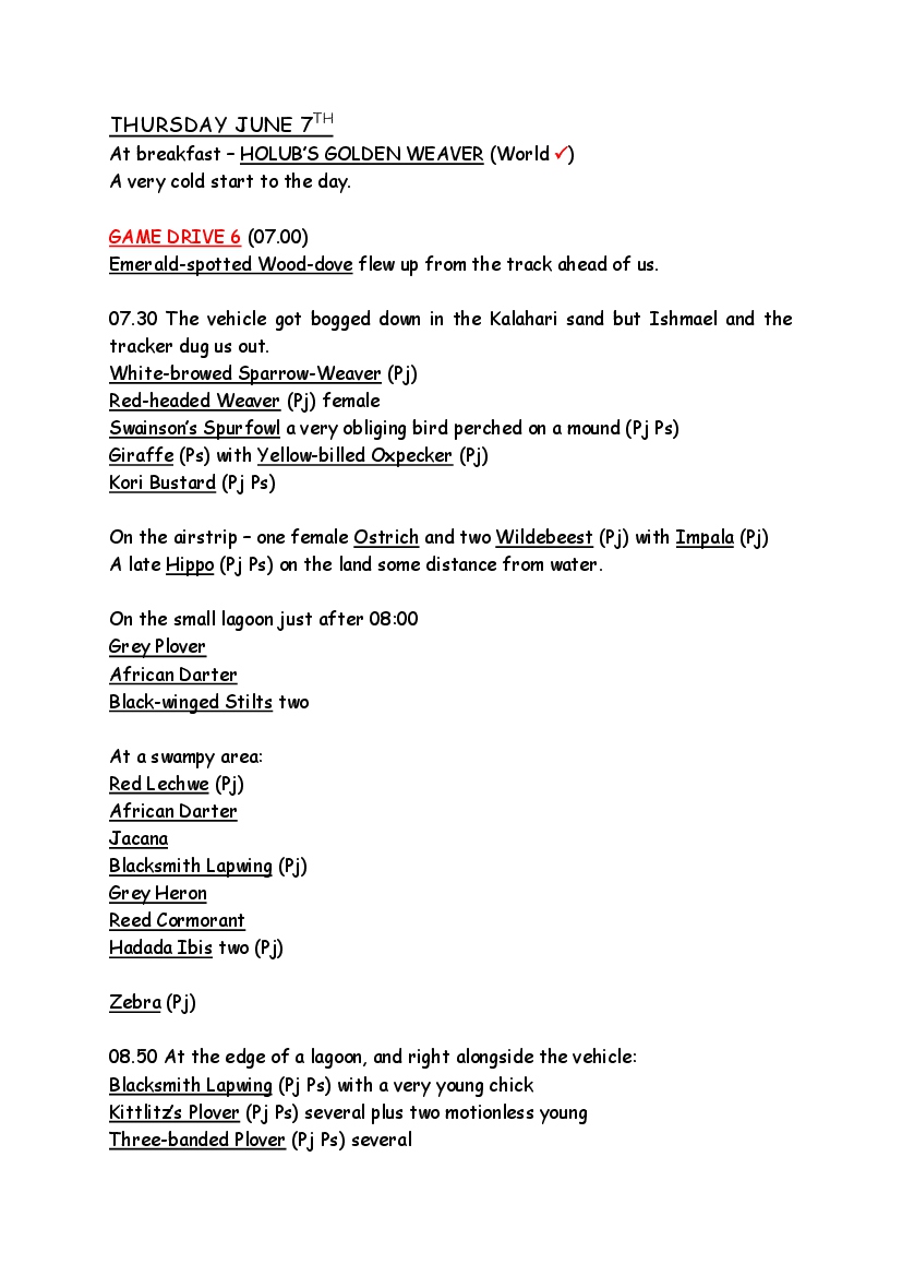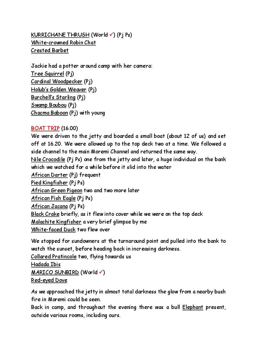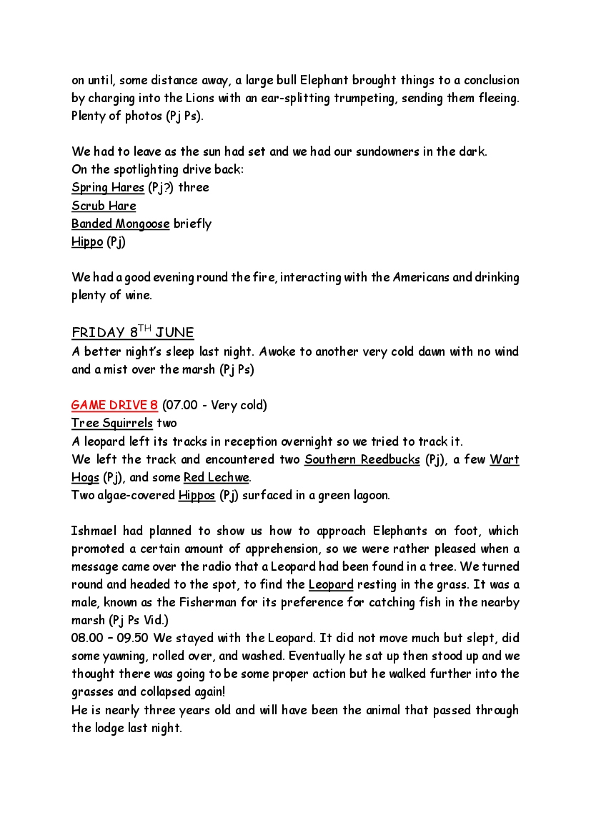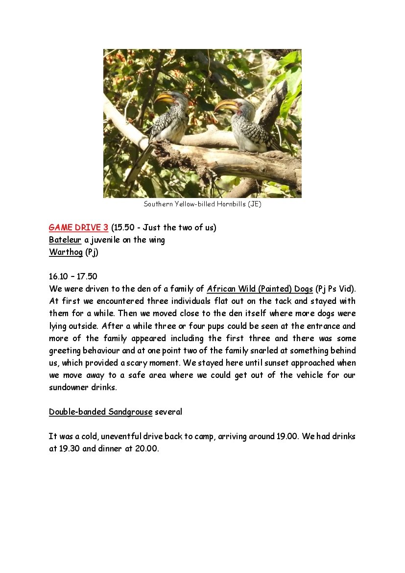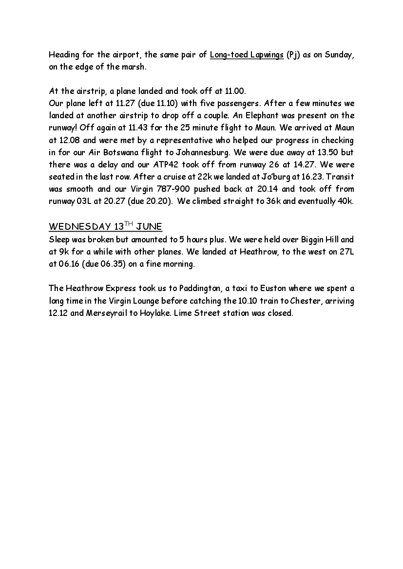 In June 2018, Steve and Jackie returned to Africa. After a visit to Victoria Falls and Zimbabwe National Park, they crossed into northern Botswana and spent time at three tented camps. The first two were close to the border with Namibia and the third was further south, in the Okavango Delta. Transport between the camps was by chartered light aircraft. Two of their most sought-after species were the Painted Wolf (aka African Hunting Dog) and the Secretary Bird. After fifteen game drives and one boat trip, these hopes had been well and truly fulfilled but they did, of course, see much more besides. This is an illustrated account of the trip.
