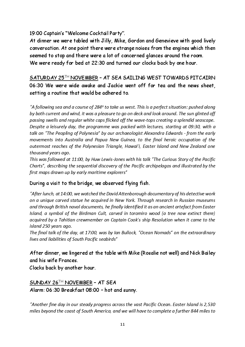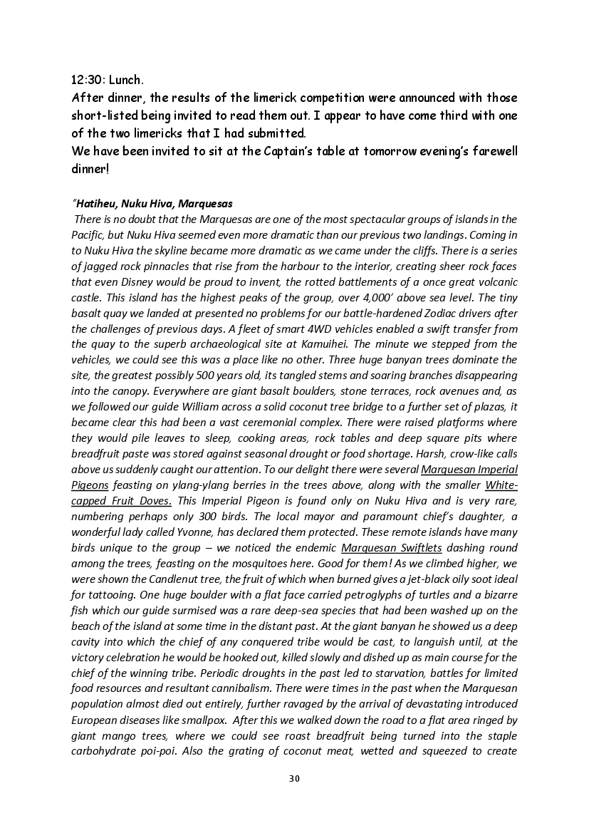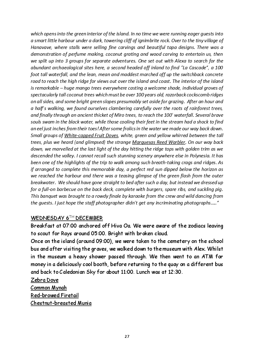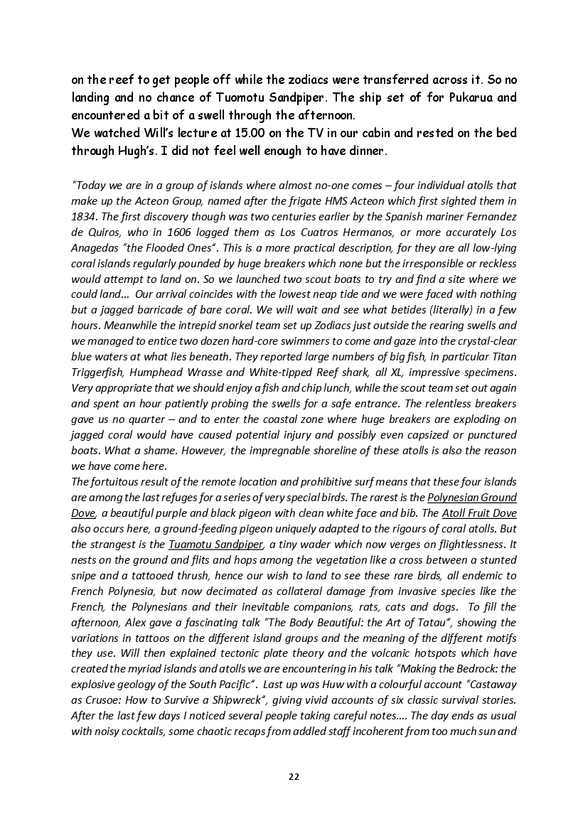 Steve and Jackie first flew to Santiago, Chile, and after a couple of days there, continued to Easter Island where they joined an expedition cruise, run by Nobel Caledonia. Over the next three weeks, they crossed the South Pacific to Tahiti, via the Pitcairns and various islands of French Polynesia. After saying goodbye to their fellow travellers, they continued to South Australia, spending time on Kangaroo Island, at Victor Harbour and at a Bird and Bushland Retreat. After a week with friends on the Sunshine Coast of Queensland, they then visited their much-loved bolt-hole of Bird Island in the Seychelles, for a week, before returning to the UK to complete the circle.