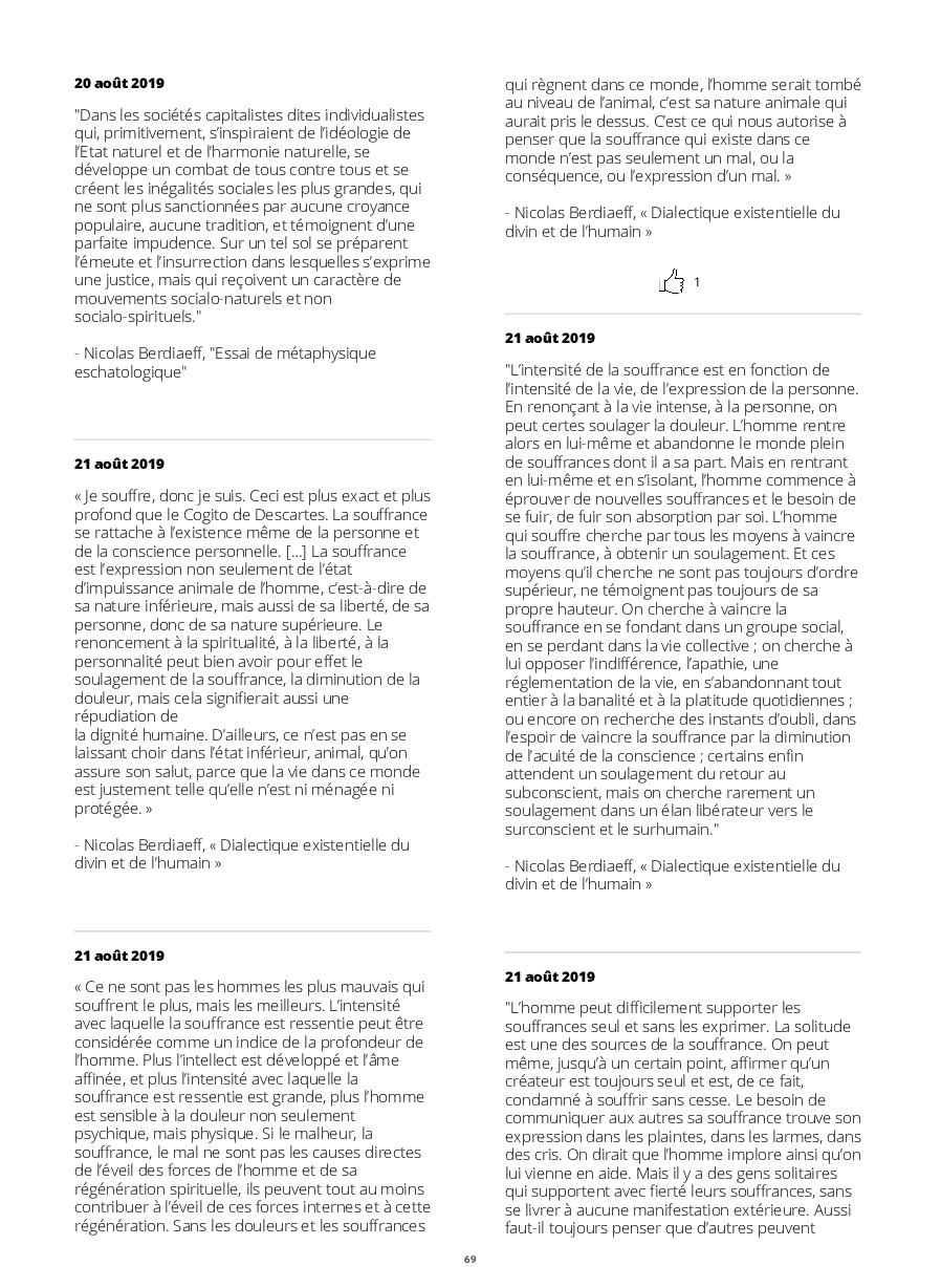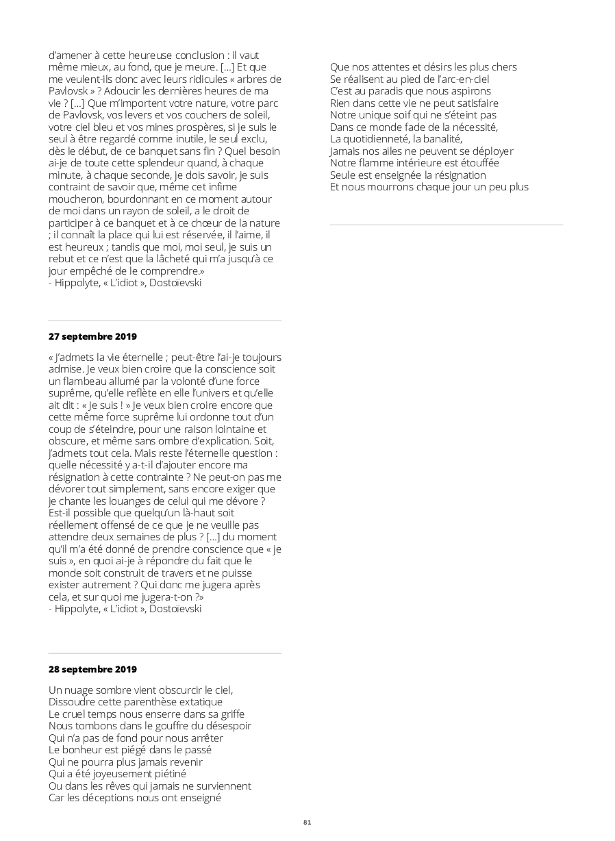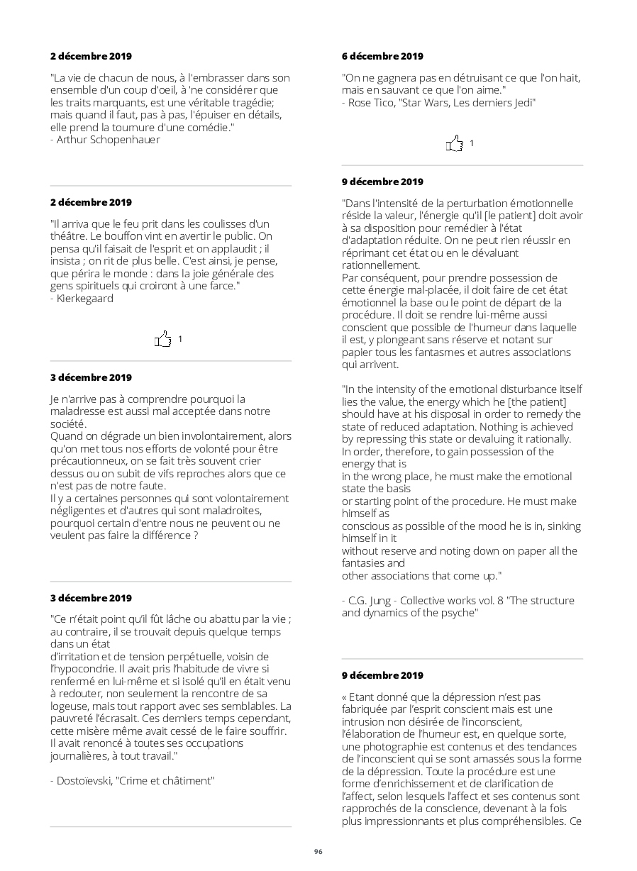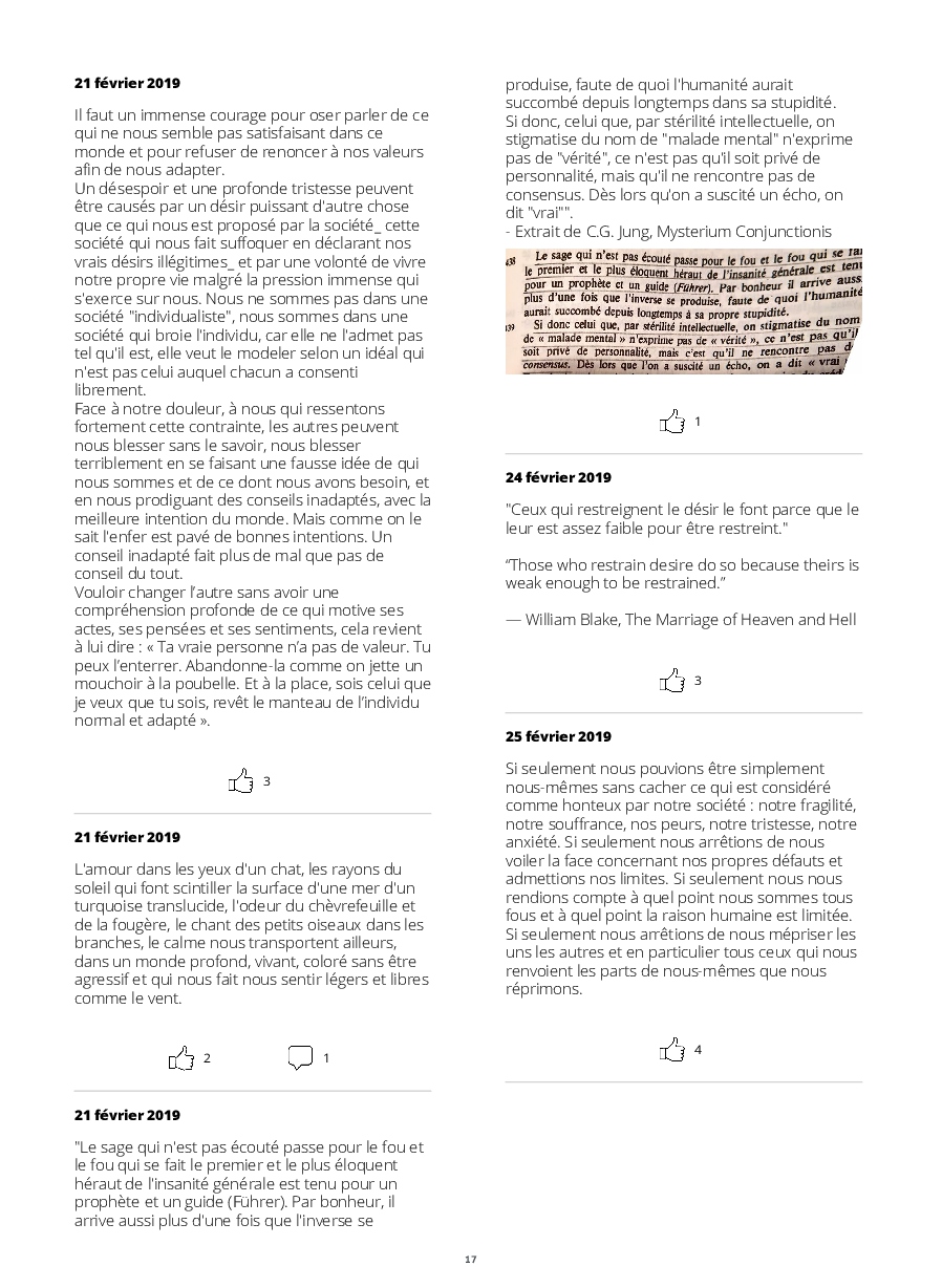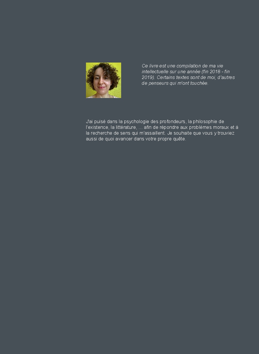 J'ai puisé dans la psychologie des profondeurs, la philosophie de l'existence, la littérature, ... afin de répondre aux problèmes moraux et à la recherche de sens qui m'assaillent. Je souhaite que vous y trouviez aussi de quoi avancer dans votre propre quête.