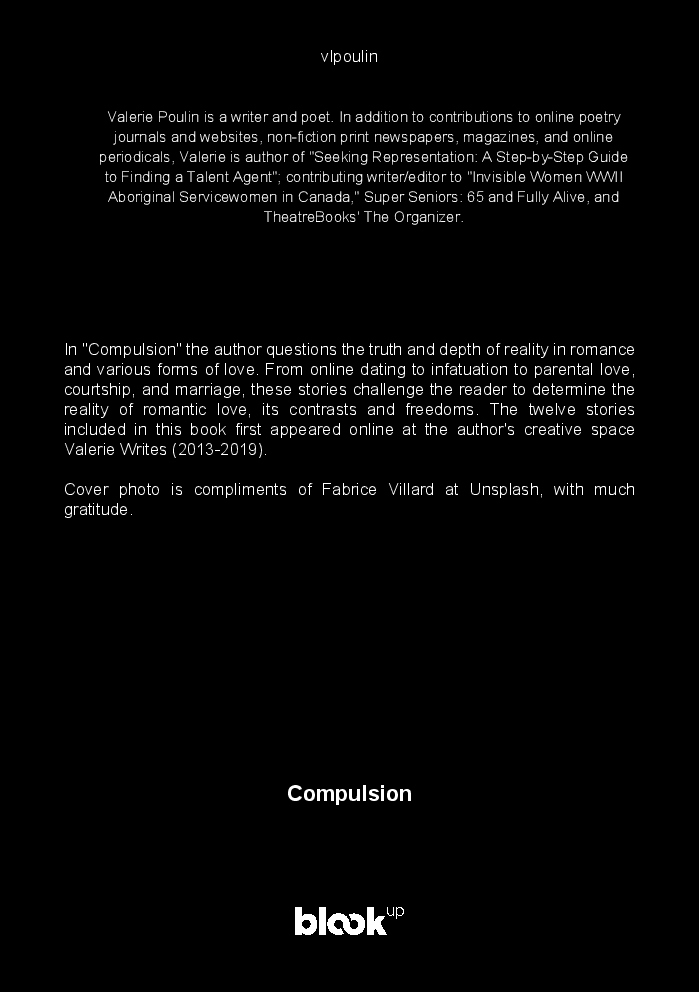In "Compulsion" the author questions the truth and depth of reality in romance and various forms of love. From online dating to infatuation to parental love, courtship, and marriage, these stories challenge the reader to determine the reality of romantic love, its contrasts and freedoms. The twelve stories included in this book first appeared online at the author's creative space Valerie Writes (2013-2019).