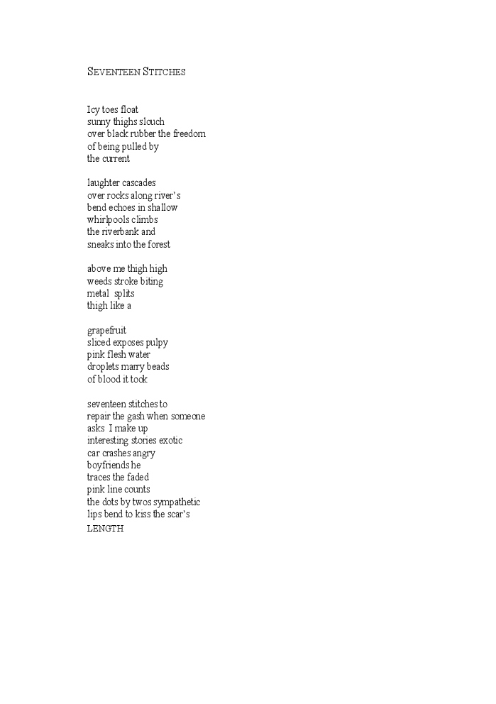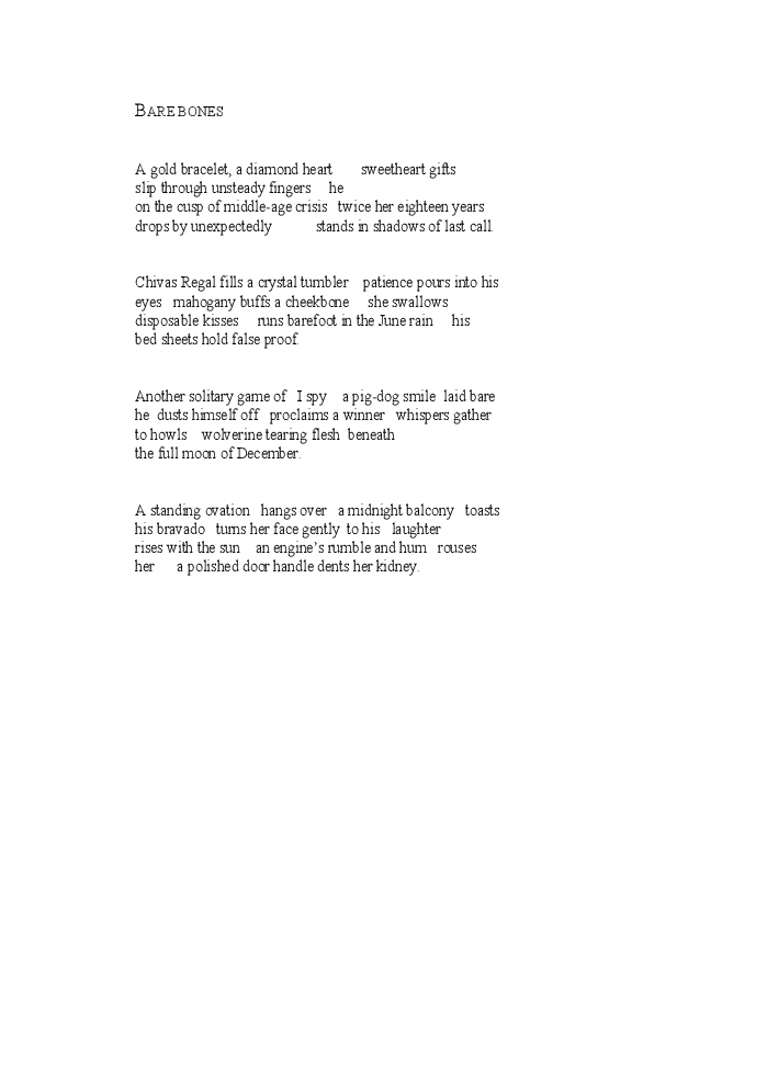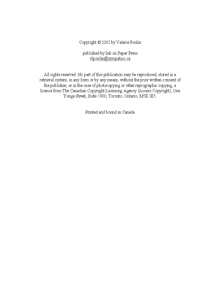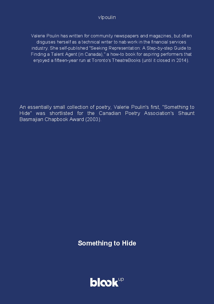 An essentially small collection of poetry, Valerie Poulin's first, "Something to Hide" was shortlisted for the Canadian Poetry Association's Shaunt Basmajian Chapbook Award (2003).