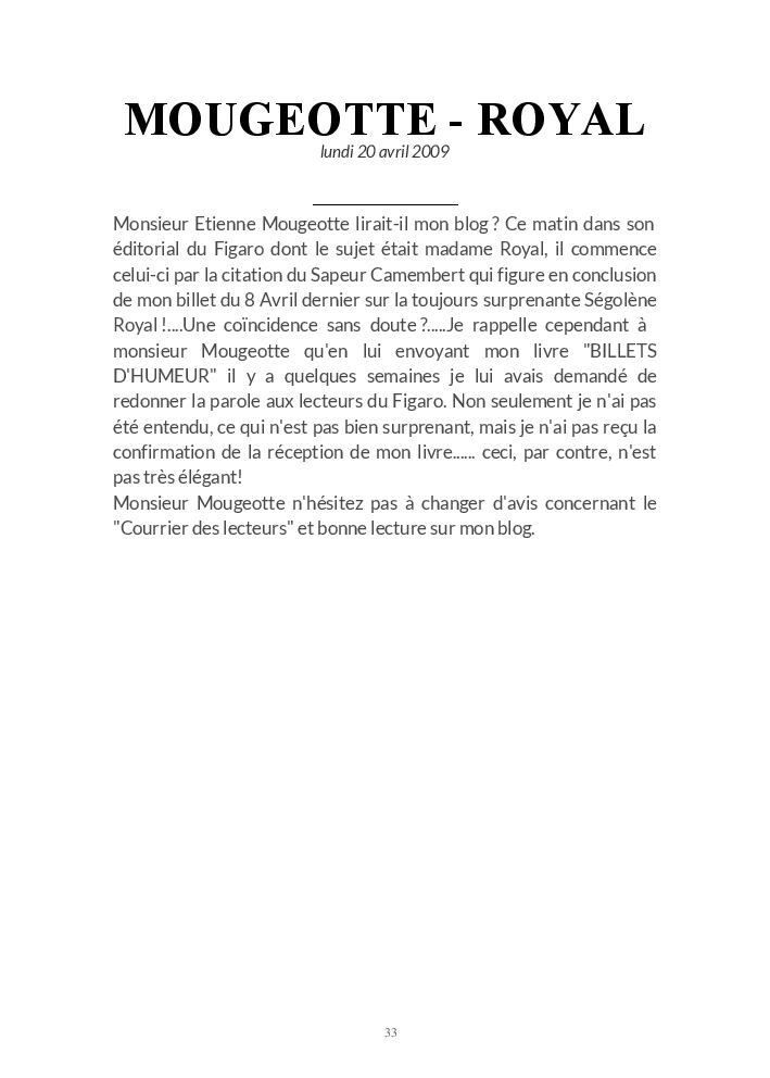 UN BILLET D'HUMEUR EST UNE RÉACTION À DES ÉVÉNEMENTS DE L'ACTUALITÉ FRANÇAISE OU INTERNATIONALE, MAJEURS OU ANECDOTIQUES, SÉRIEUX OU DRÔLES, POLITIQUES, ÉCONOMIQUES, CULTURELS OU SPORTIFS.