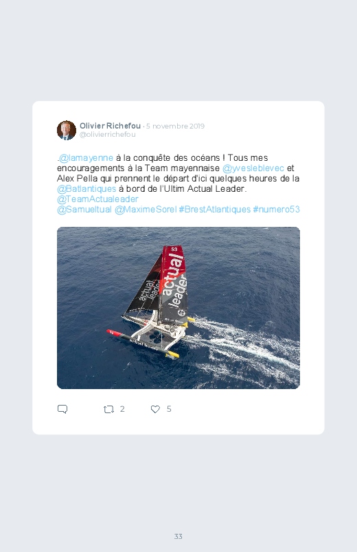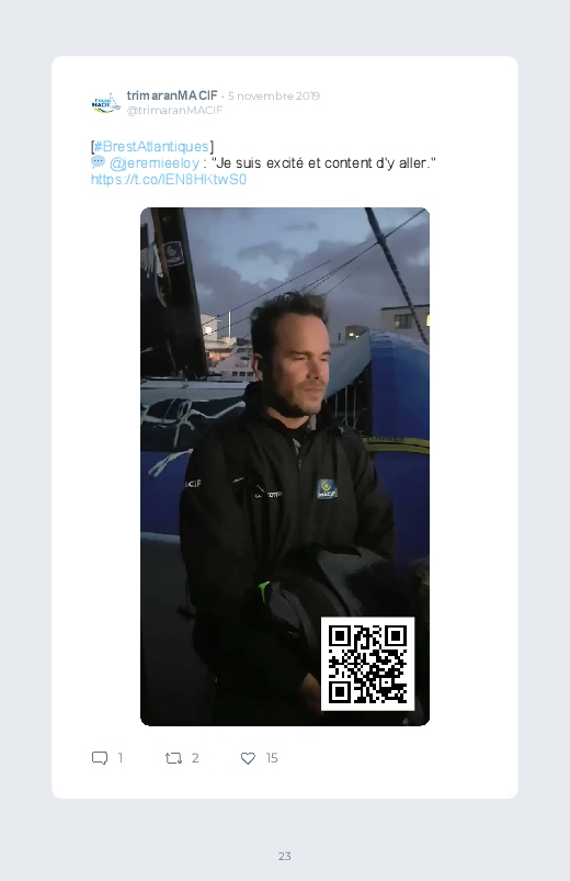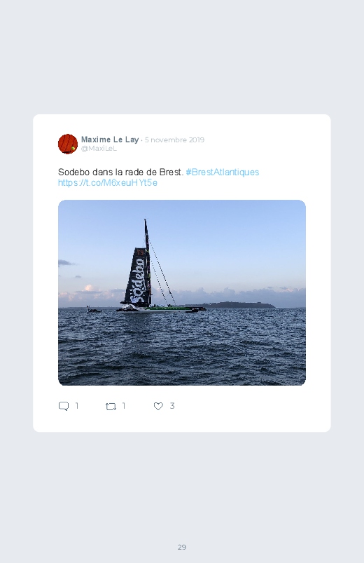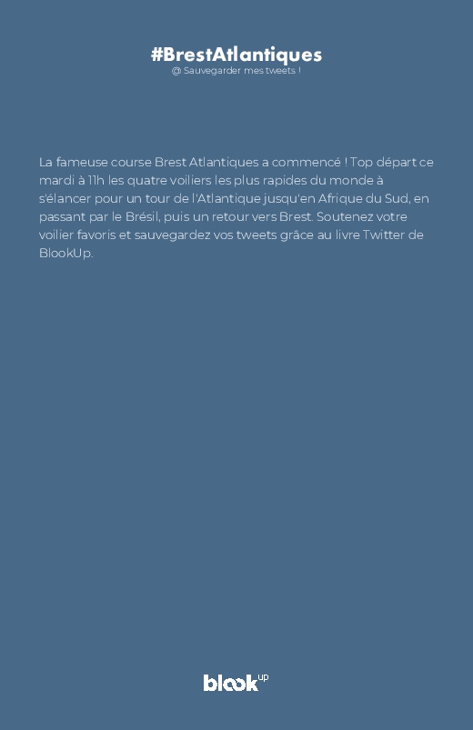 La fameuse course Brest Atlantiques a commencé ! Top départ ce mardi à 11h les quatre voiliers les plus rapides du monde à s’élancer pour un tour de l’Atlantique jusqu’en Afrique du Sud, en passant par le Brésil, puis un retour vers Brest. Soutenez votre voilier favoris et sauvegardez vos tweets grâce au livre Twitter de BlookUp.
