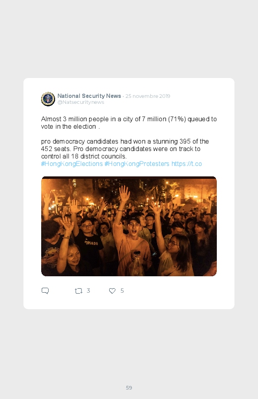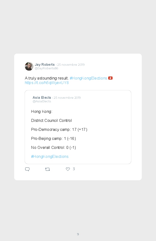 Victoire écrasante des pro- démocratie aux élections locales d'Hong-Kong. Ils remportent trois quarts des 452 sièges en jeu dans les 18 conseils de district. Un résultat qui n'a fait que rappeler le conflit entre Pékin et Hong Kong, un climat de tension présent depuis plus de 6 mois.