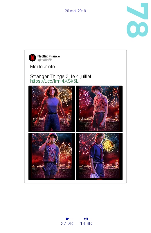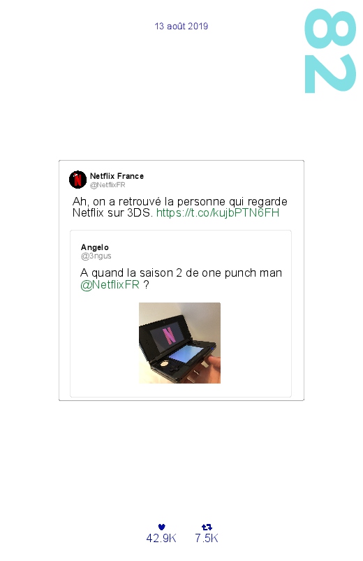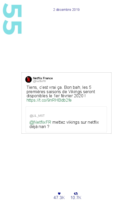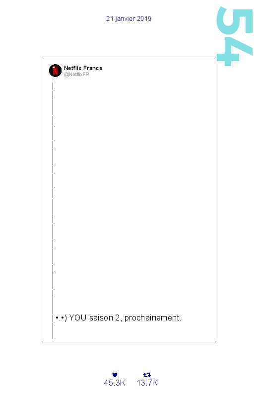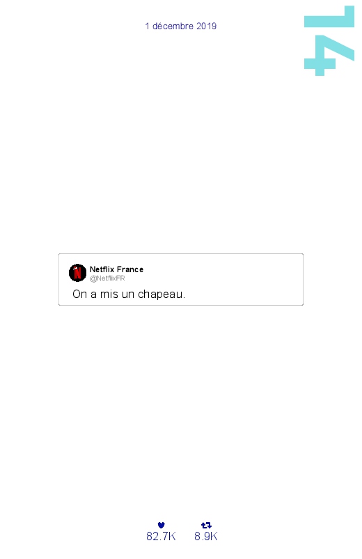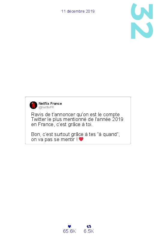 Netflix France a récemment été promu le compte Twitter le plus mentionné de France de l'année 2019 ! On les félicite (avec un peu de jalousie aussi 🤫) et on leur offre le fameux livre de leur Top 100 tweets de l'année 2019 ! TOU DOUM !
