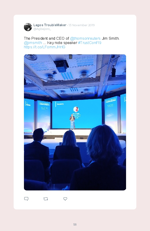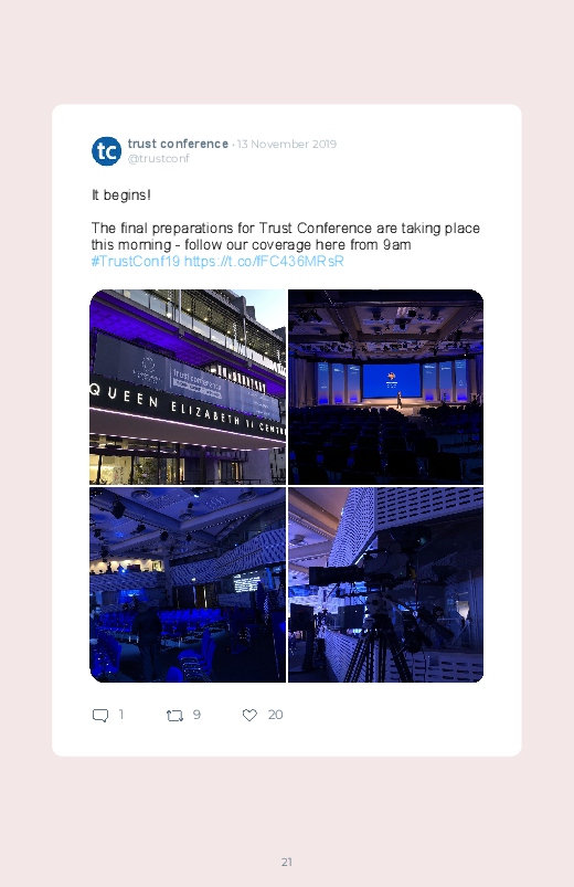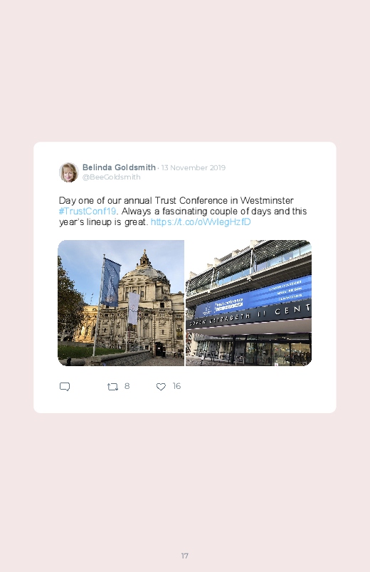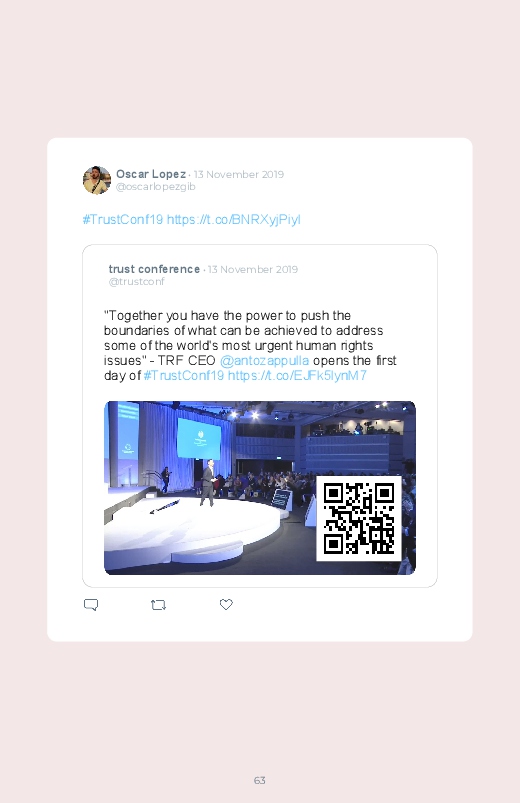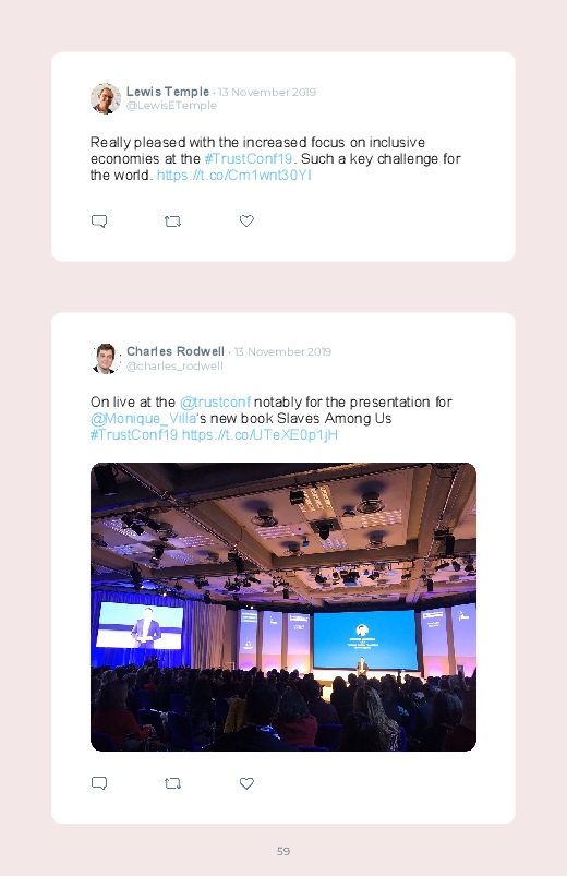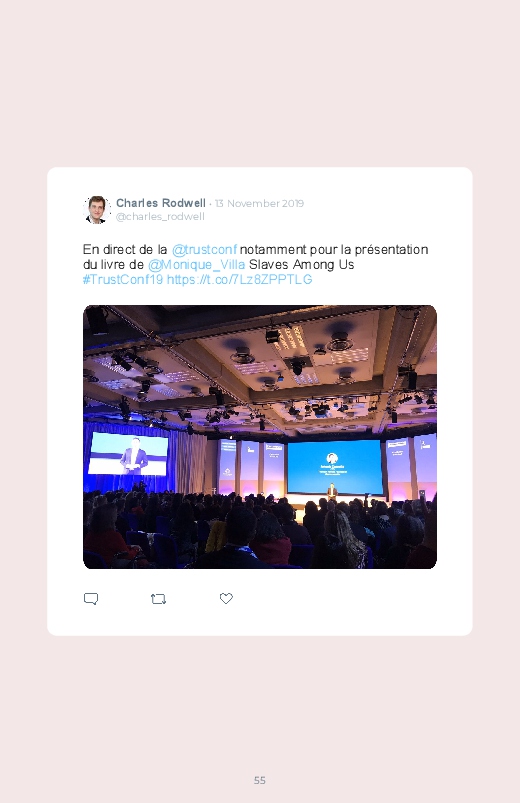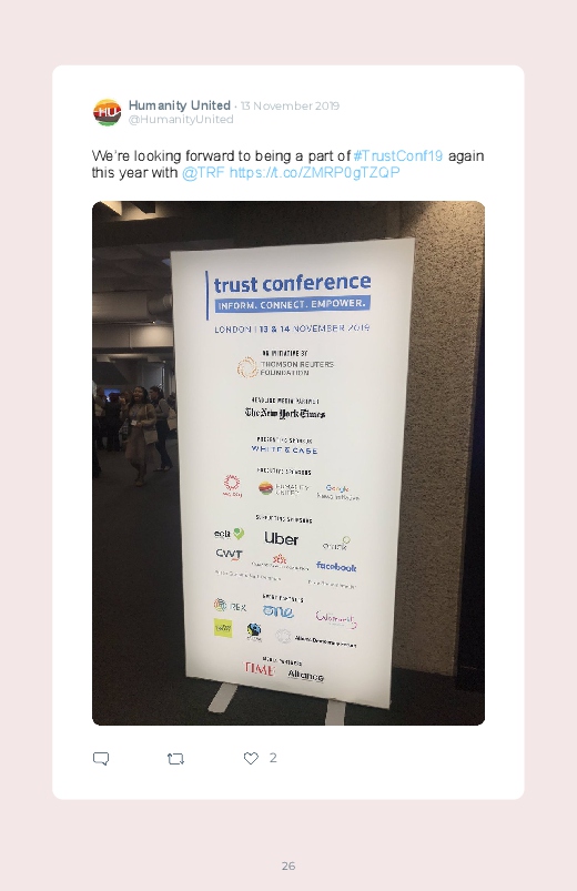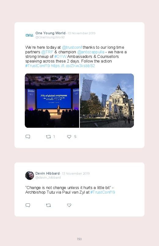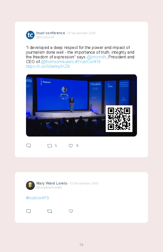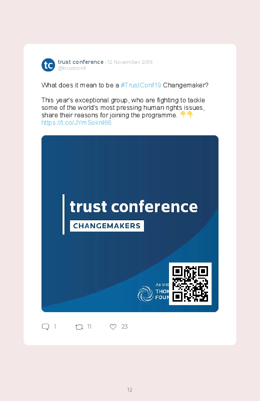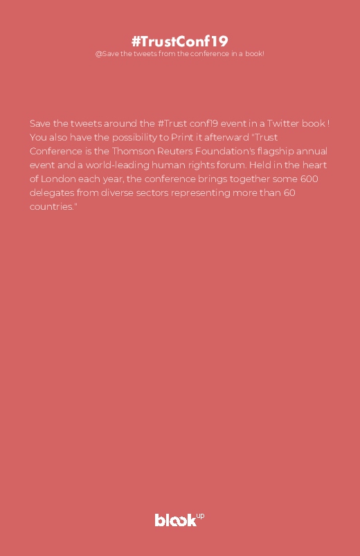Save the tweets around the #Trust conf19 event in a Twitter book ! You also have the possibility to Print it afterward "Trust Conference is the Thomson Reuters Foundation’s flagship annual event and a world-leading human rights forum. Held in the heart of London each year, the conference brings together some 600 delegates from diverse sectors representing more than 60 countries."