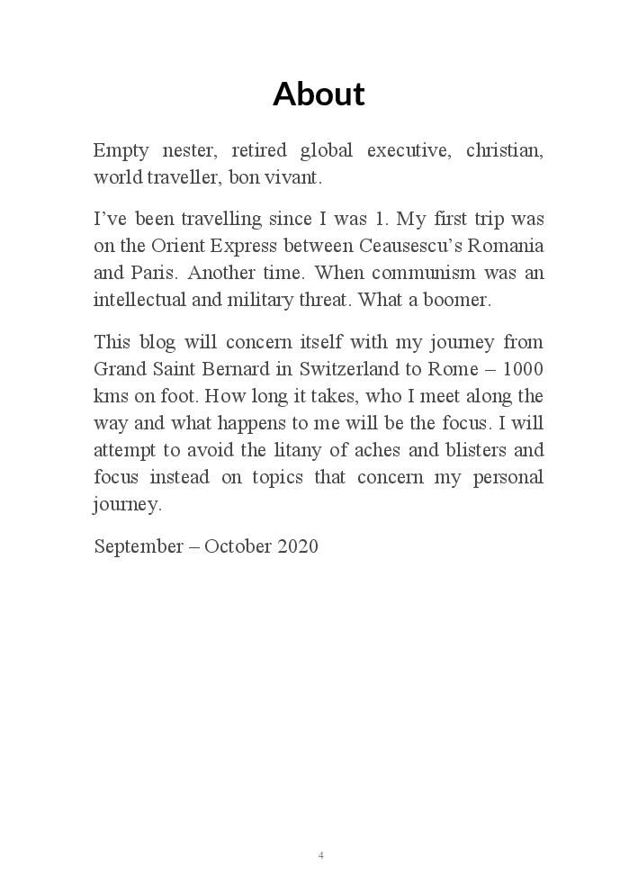 This is the story of my 1000 kms pilgrimage from Switzerland to Rome : the people I meet, things I learn about myself, Italy and life! October 2020