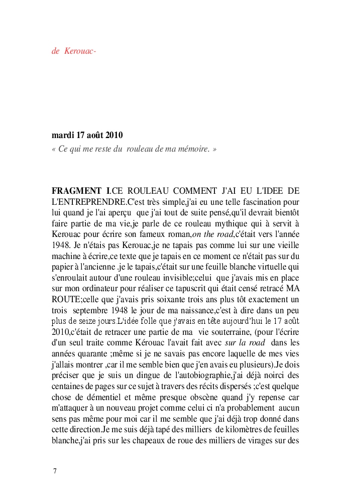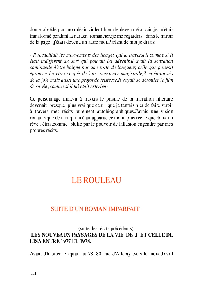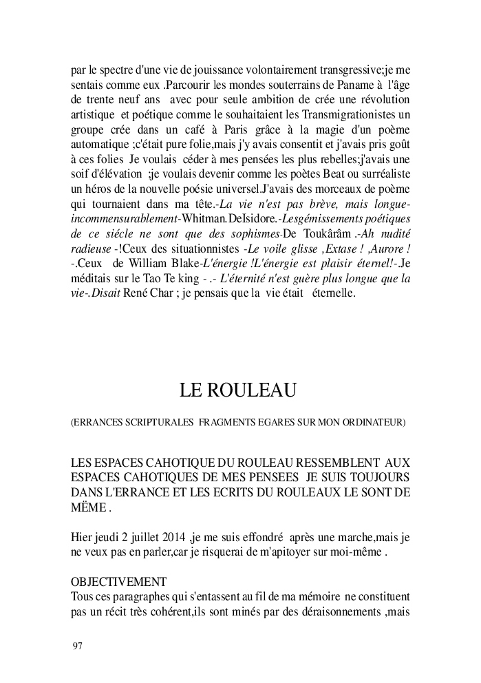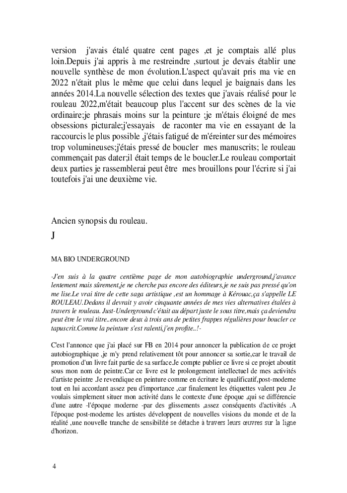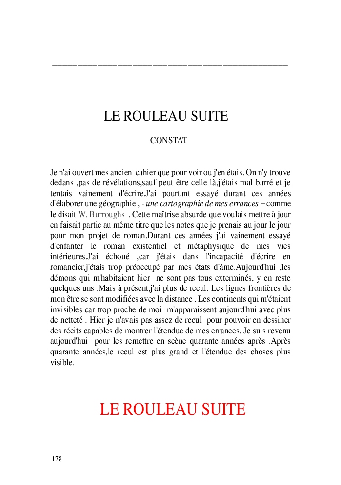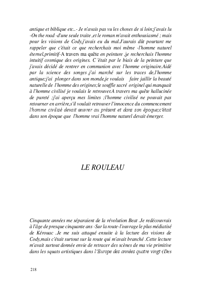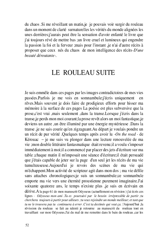 Cette nouvelle version du rouleau n'est nouvelle que pour moi qui connait les anciennes.J'ai écris différentes versions du rouleau durant vingt ans.Très récemment j'ai opéré des coupes et des transformation dans mon manuscrit et cela a donné un nouveau regard.Au départ le rouleau était une suite de récits qui étaient destinés a retracer mes vies alternatives avec un clin d'oeil prononcé en direction de Kérouac et de son fameux rouleau (on the road) . Mes récits ont bifurqués et ont pris un tour nouveau ma route c'est élargie;entre temps j'avais fait la rencontre d'Odysseus,et ma vie avait pris une autre direction