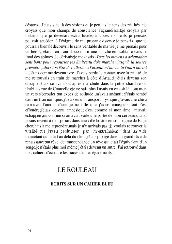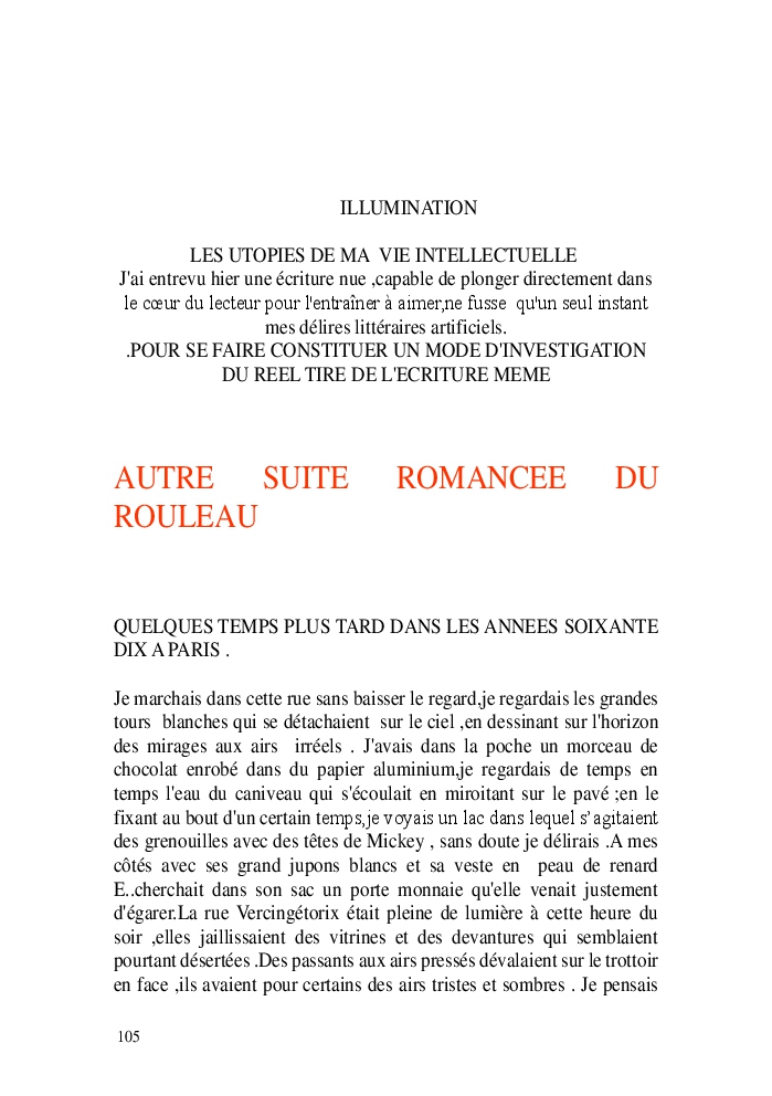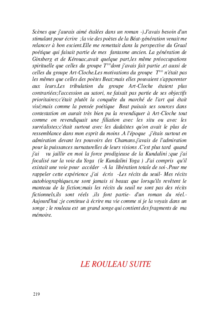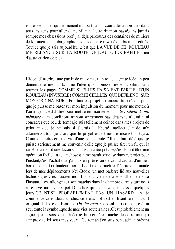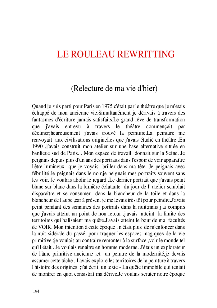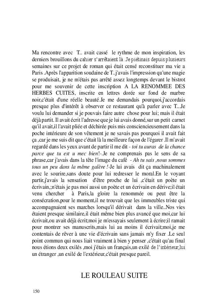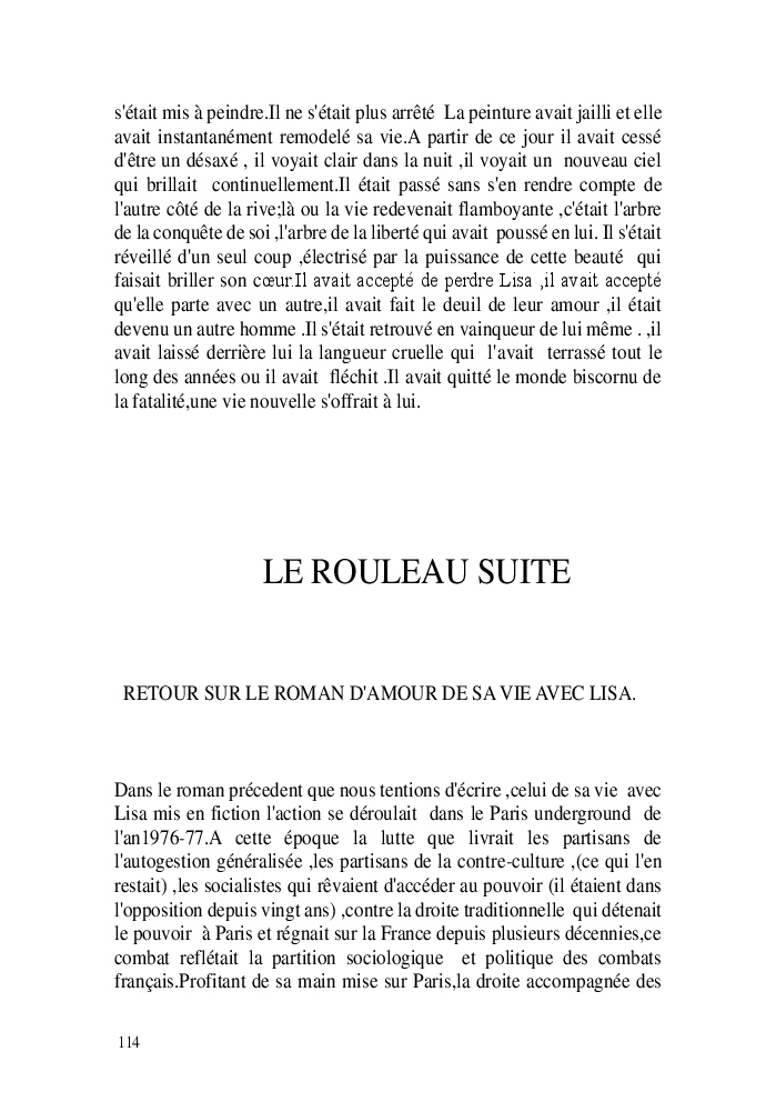 Cette nouvelle version du rouleau n'est nouvelle que pour moi qui connait les anciennes.J'ai écris différentes versions du rouleau durant vingt ans.Très récemment j'ai opéré des coupes et des transformation dans mon manuscrit et cela a donné un nouveau regard.Au départ le rouleau était une suite de récits qui étaient destinés a retracer mes vies alternatives avec un clin d'oeil prononcé en direction de Kérouac et de son fameux rouleau (on the road) . Mes récits ont bifurqués et ont pris un tour nouveau ma route c'est élargie;entre temps j'avais fait la rencontre d'Odysseus,et ma vie avait pris une autre direction