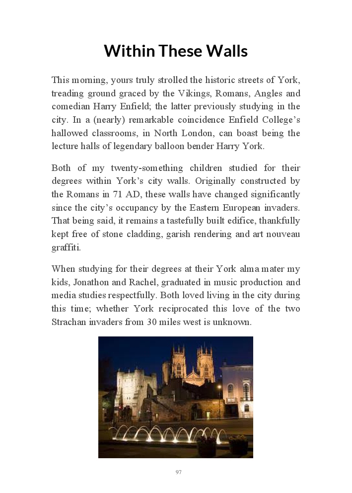 Within These Walls contains excerpts of Gary Strachan's late winter narratives at the dawn of a new decade. The author would like to make clear this tome has absolutely nothing to do with the 1970's drama of the same moniker starring the splendidly named Googie Withers. These chronicles include quality time with his son and daughter, a break in Whitby, along with a multitude of other fictional anecdotes based on fact.