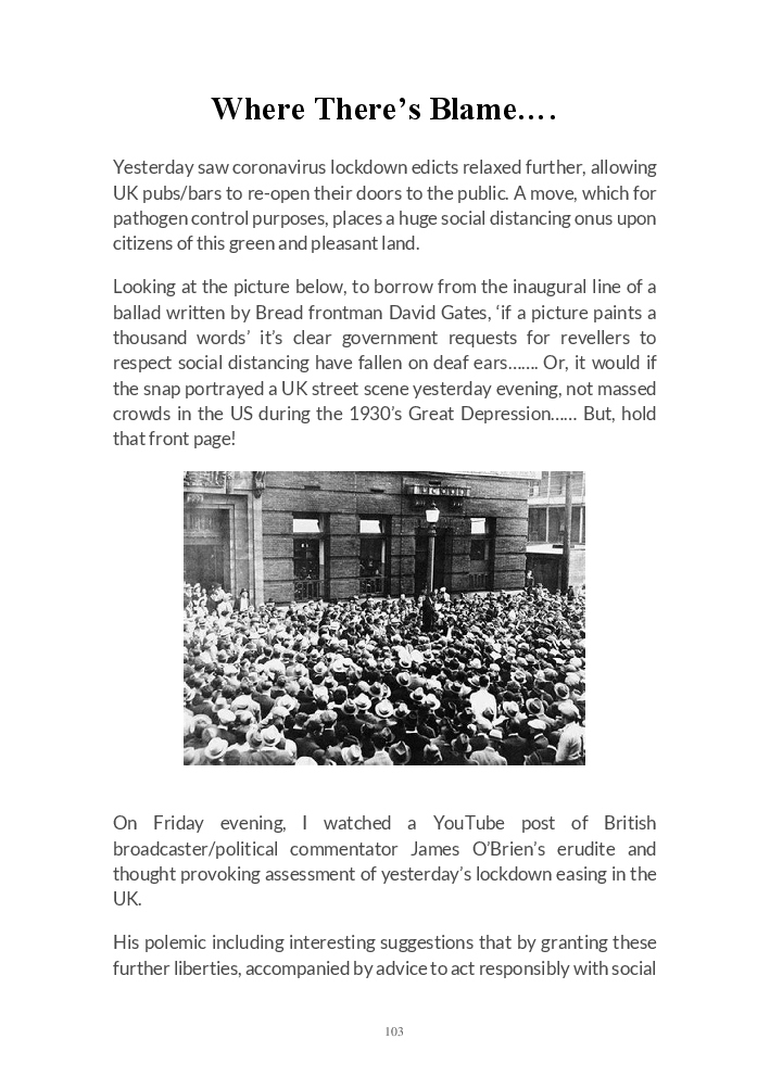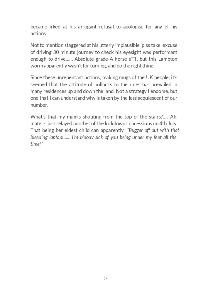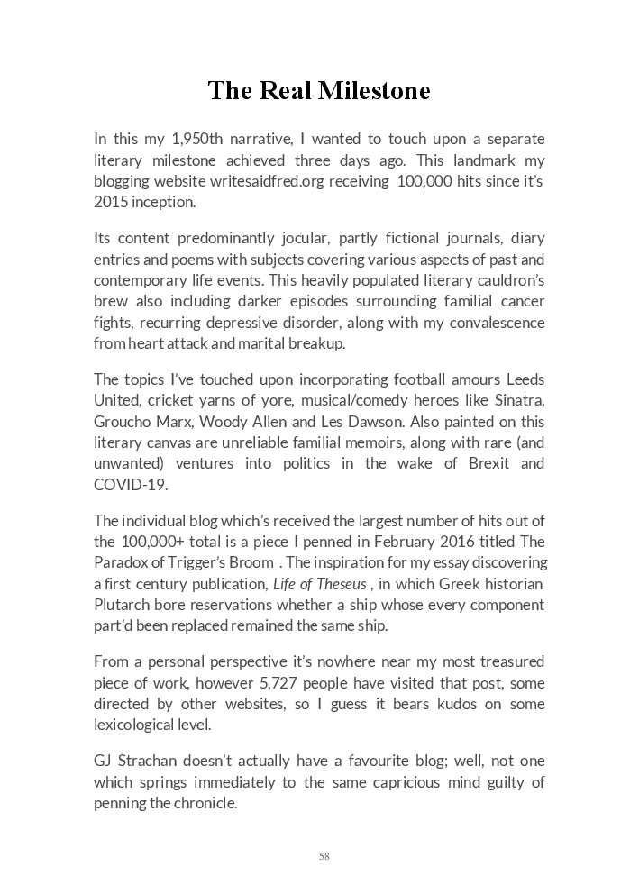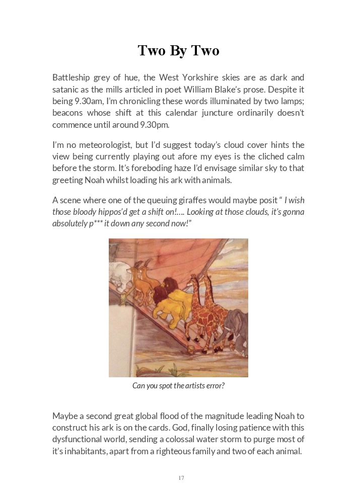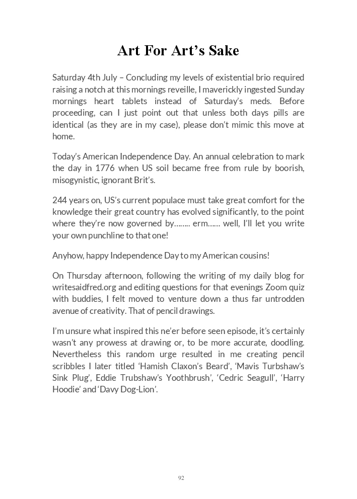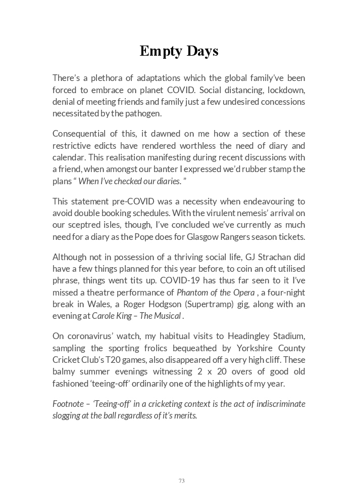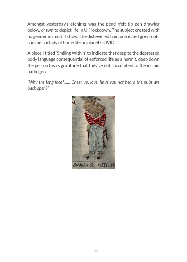 Art For Art’s Sake is Gary Strachan’s third instalment of his Corona Chronicles. These daily diaries his journals during June and July 2020, describing life on planet COVID19. These weeks saw the advent of the author’s creative amble down etching avenue, some of which are incorporated within the book. Tales of existence as lockdown edicts eased, include anecdotes of sojourns to Lancashire, buying a new pair of specs, along with lots of weather related whimsy. No animals were harmed during the writing of this tome.