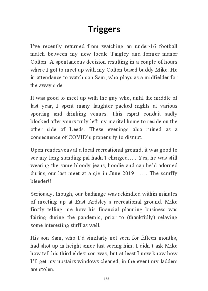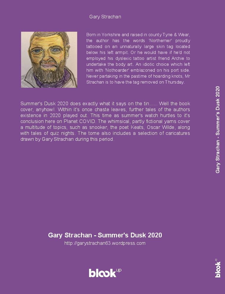 Summer's Dusk 2020 does exactly what it says on the tin...... Well the book cover, anyhow!. Within it's once chaste leaves, further tales of the authors existence in 2020 played out. This time as summer's watch hurtles to it's conclusion here on Planet COVID. The whimsical, partly fictional yarns cover a multitude of topics, such as snooker, the poet Keats, Oscar Wilde, along with tales of quiz nights. The tome also includes a selection of caricatures drawn by Gary Strachan during this period.