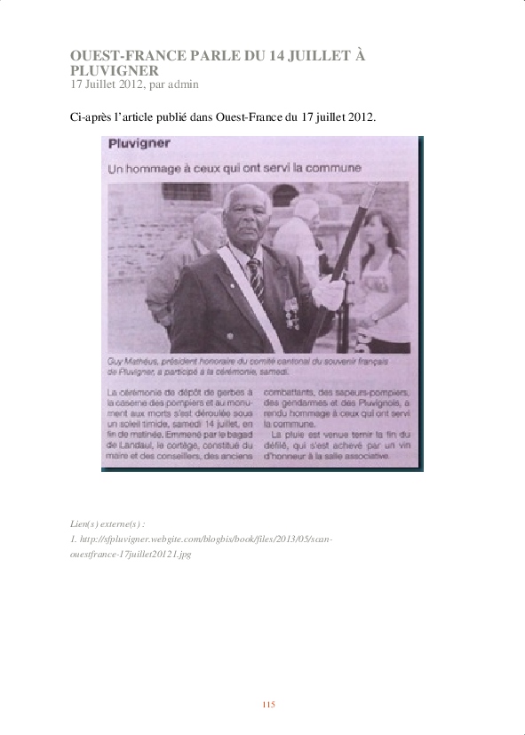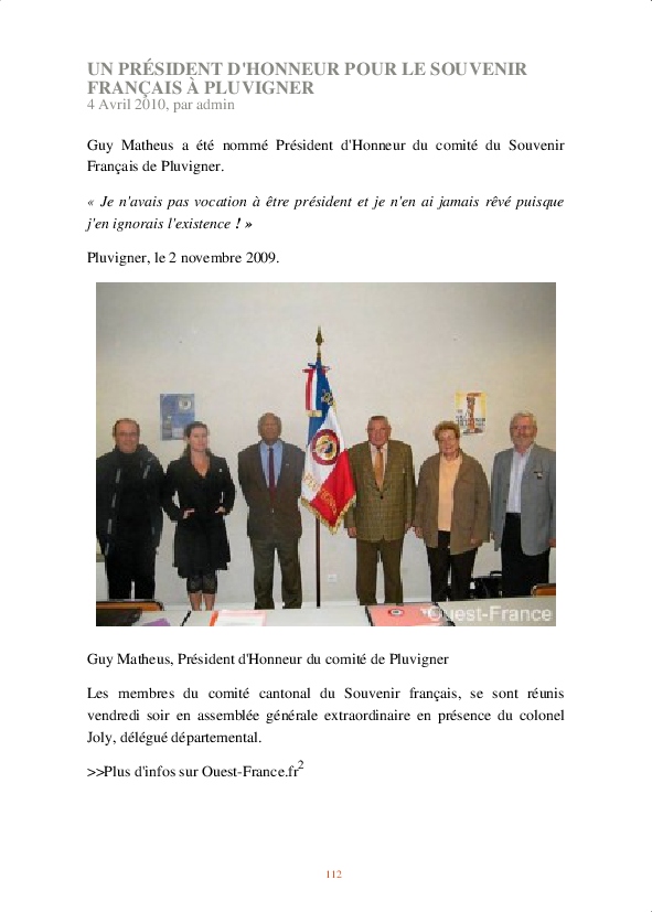 C’est par hasard qu’il a rencontré le général Roux en 1991, Délégué Général du Souvenir Français du Morbihan. Le général ayant été son instructeur en Algérie et son chef de corps en Allemagne, Guy Matheus a adhéré à la triple mission de l’association et accepté d’accéder à sa demande pressante.
