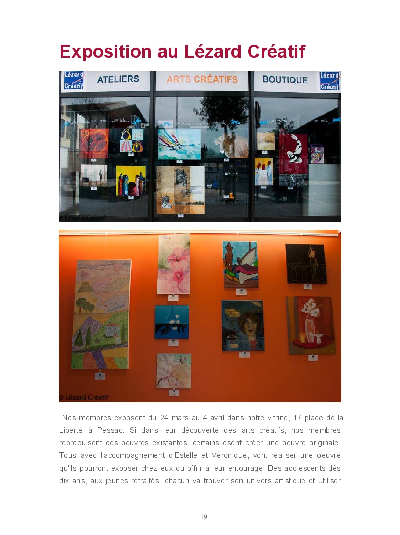 Chaque année après des moments de convivialité et de création, nos membres exposent. En 2015, 43 oeuvres ont été exposées au cinéma Jean Eustache, à la brasserie du Carré et au Lézard Créatif. Le public est venu nombreux pour voter. Vous trouverez dans ce livre toutes les oeuvres exposées, les résultats du vote du public et tous nos moments d'amitiés. Trois artistes : Claire POINTUD, Richerd FAIVRE MONZO, Philippe LAMBERT nous ont accompagnés et ont témoignés de la qualité de l'exposition et des oeuvres réalisées. Un grand merci à tous.