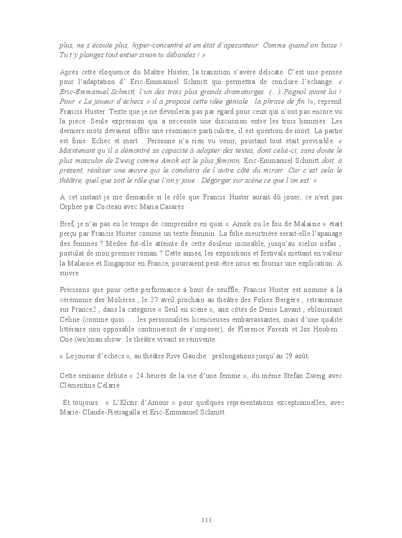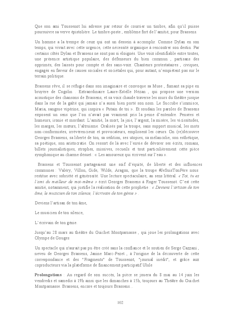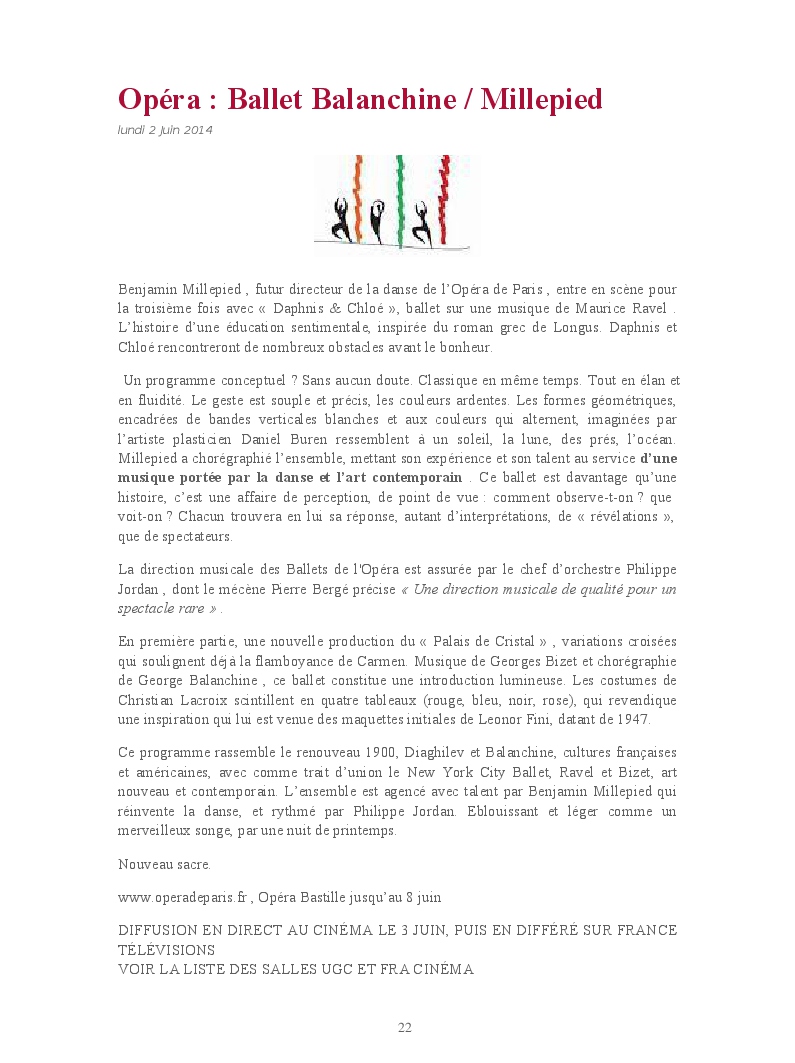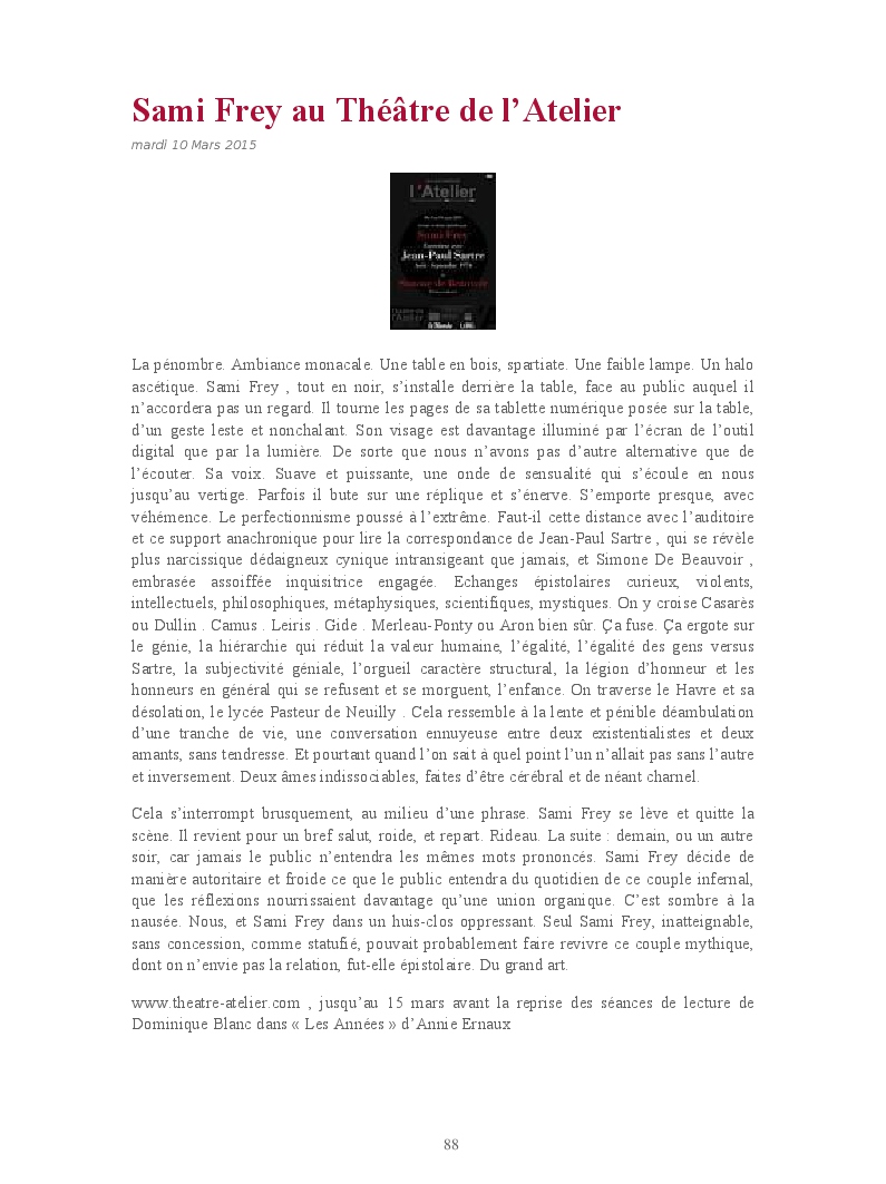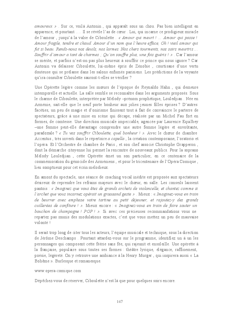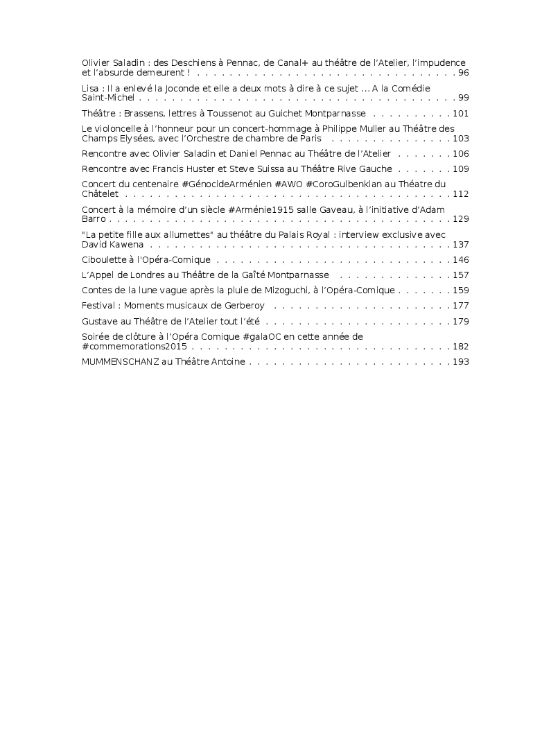 Cet ouvrage reprend les chroniques dédiées au théâtre, à la musique, aux spectacles, à l'opéra et l'opérette, aux ballets et à la danse.