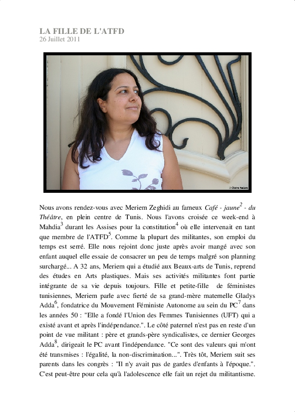 La Révolution tunisienne a eu un immense impact dans le monde. Les grands médias ont couvert les événements, notamment les plus spectaculaires ou les plus violents... Mais quel est le quotidien de celles et ceux qui ont participé activement à la révolution et qui continuent la lutte chaque jour à l’ombre des médias ? C‘est ce que je tente d’appréhender à travers mon travail, en tant que photographe, en tant que journaliste, mais aussi en tant que femme en privilégiant les rencontres avec celles qui ont activement agi durant cette révolution et ne laisseront pas piétiner leurs droits.