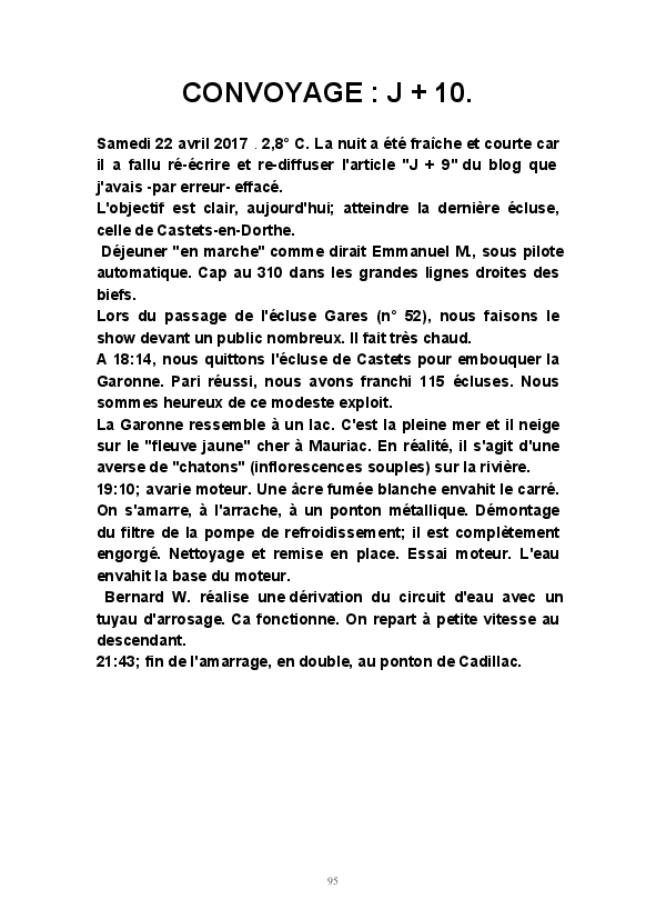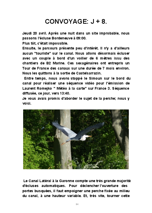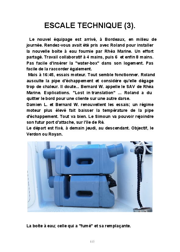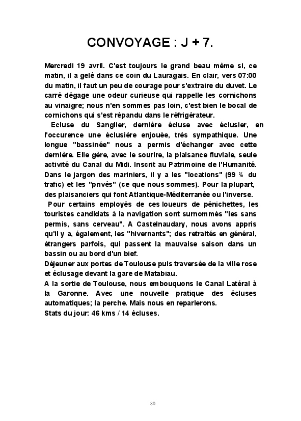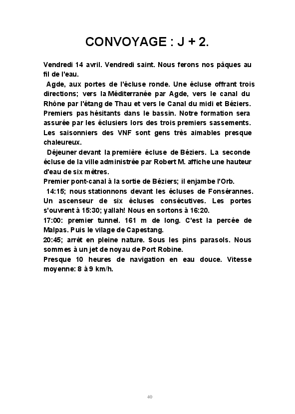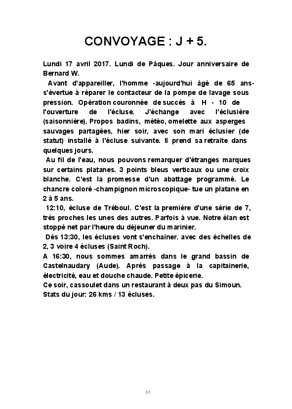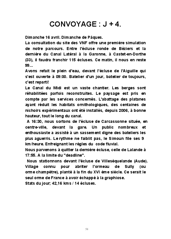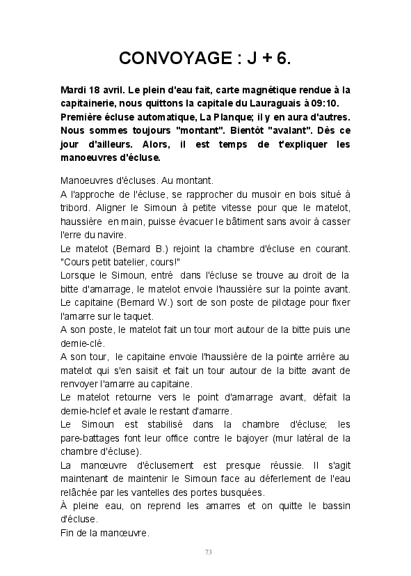 Ces chroniques évoquent, au jour le jour, le parcours d'un Rhéa, de Saint-Laurent-du-Var à Ars-en-Ré. Soit le franchissement de 115 écluses en 2 semaines pour rejoindre l'océan Atlantique.
