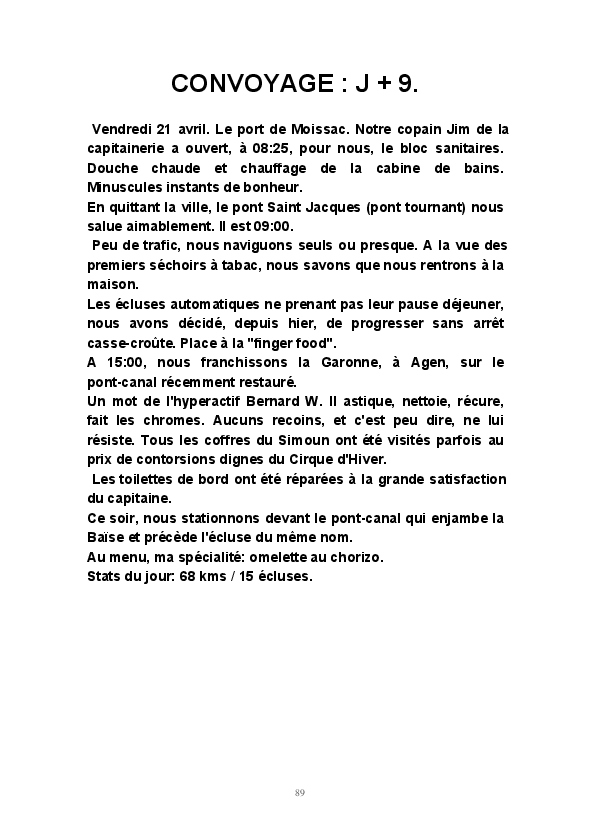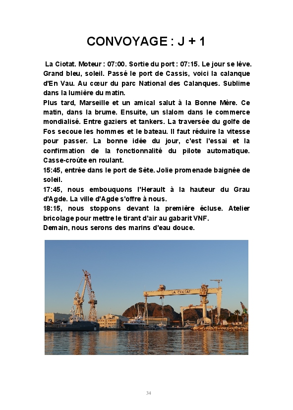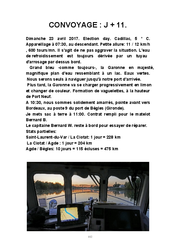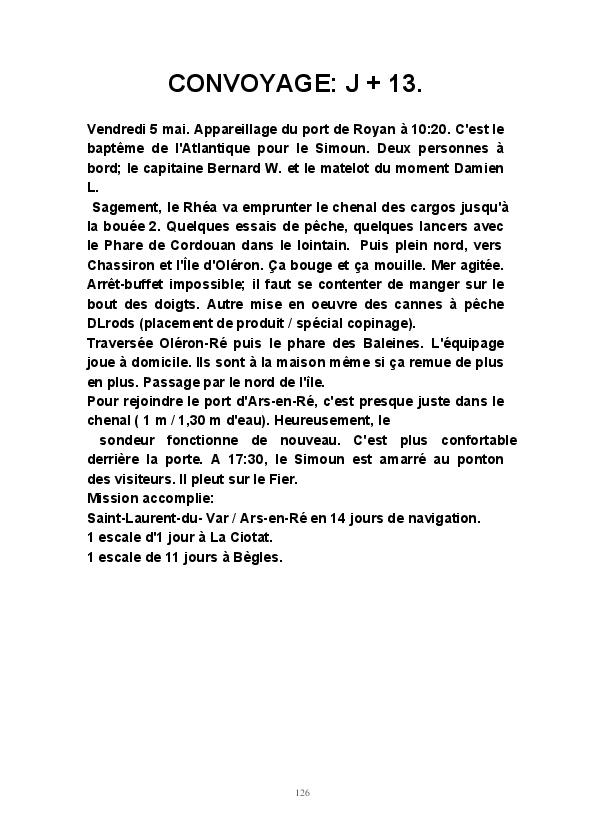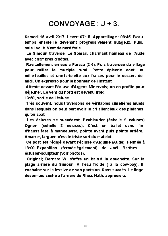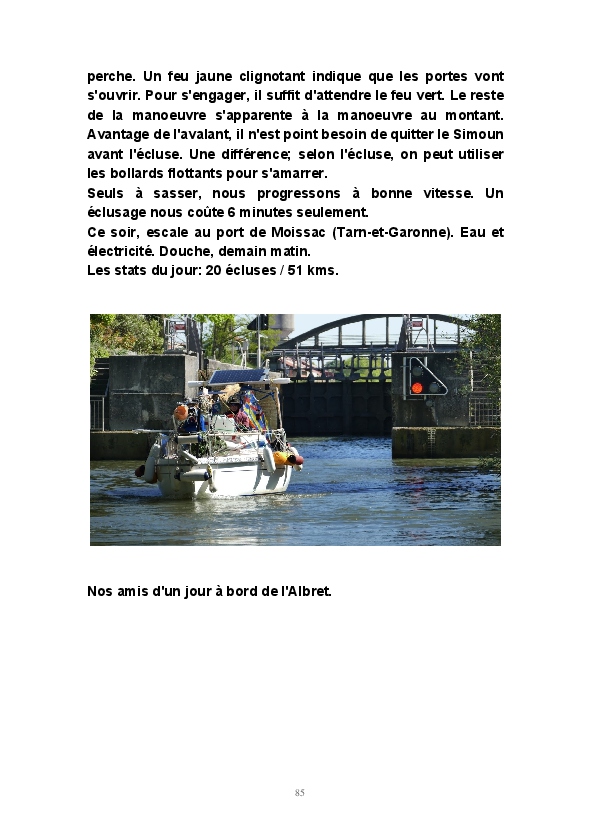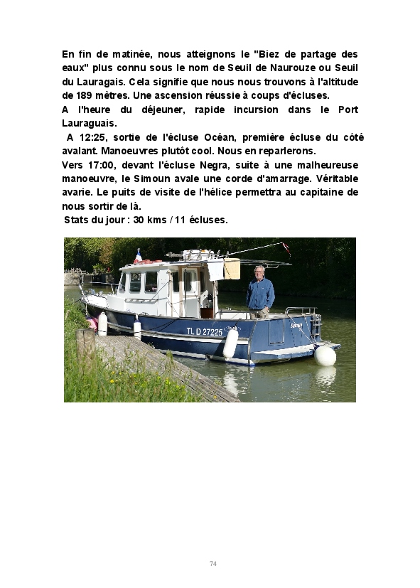 Ces chroniques évoquent, au jour le jour, le parcours d'un Rhéa, de Saint-Laurent-du-Var à Ars-en-Ré. Soit le franchissement de 115 écluses en 2 semaines pour rejoindre l'océan Atlantique.