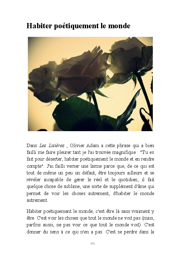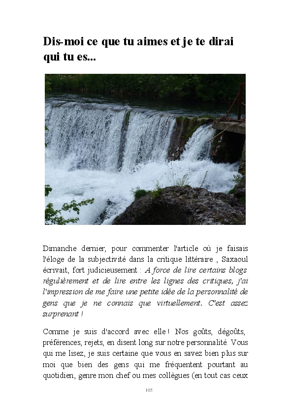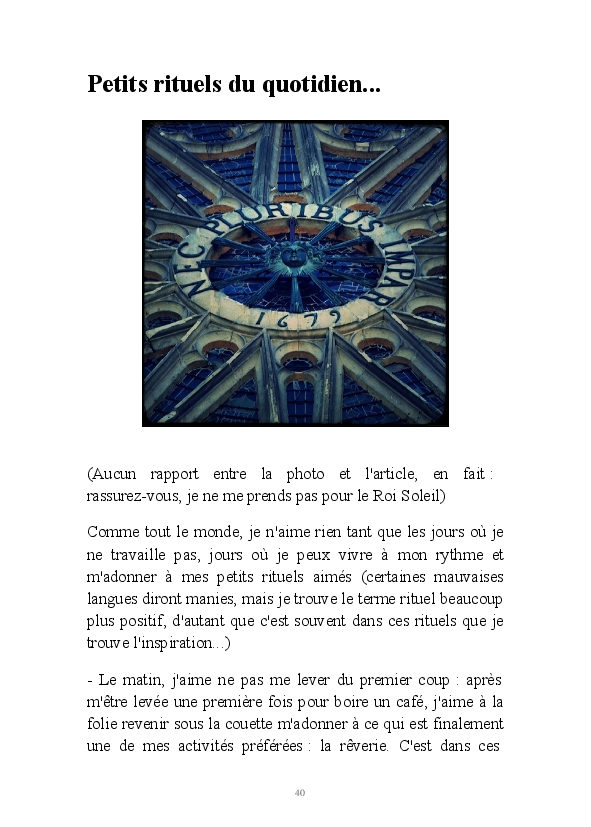 Ici, un aperçu de la catégorie "elle se réfléchit dans le miroir" de mon blog "Cultur'elle" : des textes, des photos, des petits mouvements d'humeur, des instantanés de la vie quotidienne, des citations qui me touchent... Tout ce qui rend la vie inimitable !
