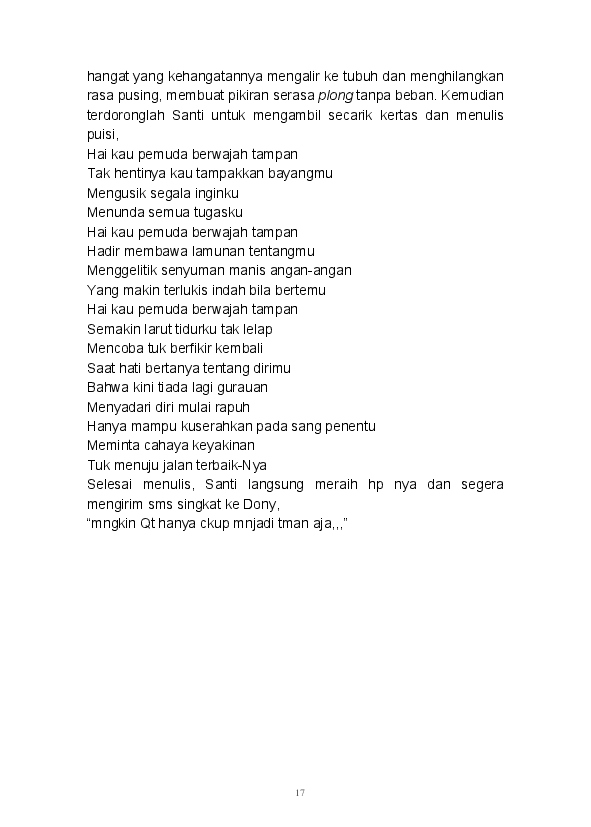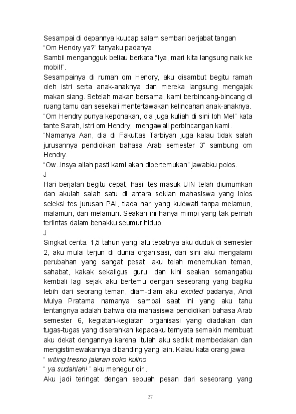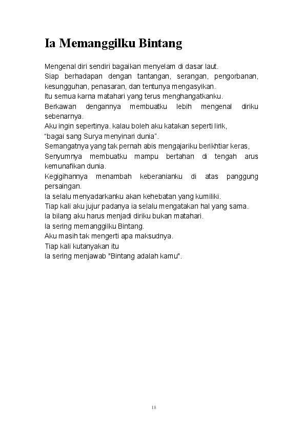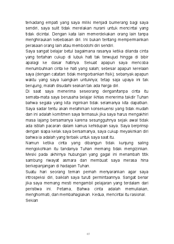 Tidak ada yang lebih istimewa selain mampu menuangkan seluruh ide dan pikiran dalam tulisan. Begitu pula tulisan-tulisan yang ada dalam buku ini merupakan rangkaian dari kata seorang pembelajar. Buku ini merupakan kumpulan dari beberapa kategori yang ada di blog mulai dari Sastra, Analisa, Filsafat, Gender, Refleksi, hingga Tokoh tertuang di sini.