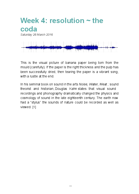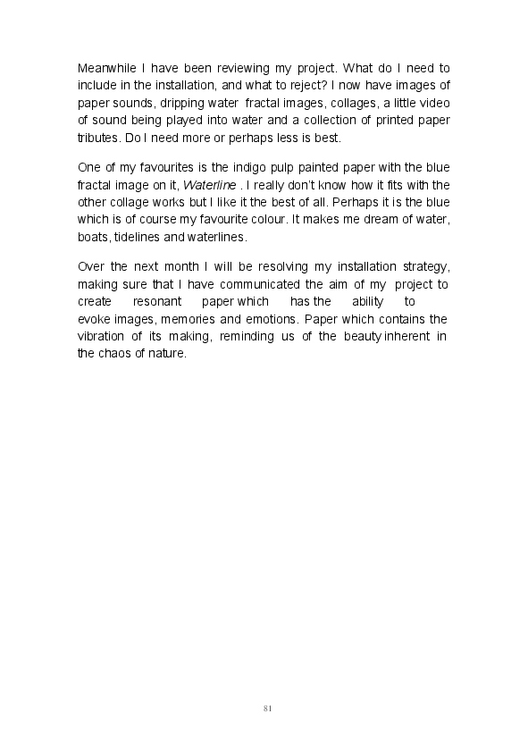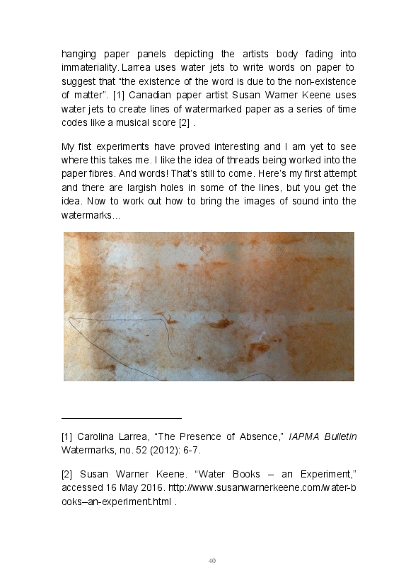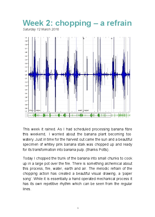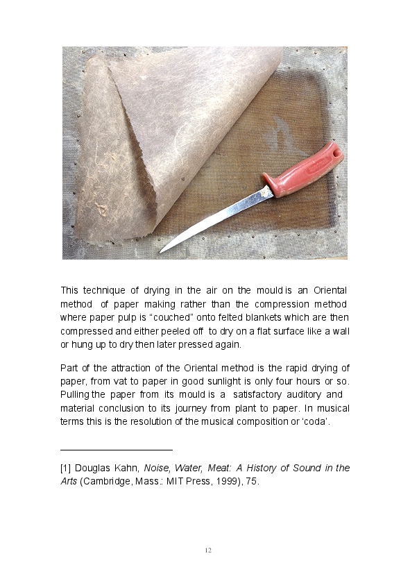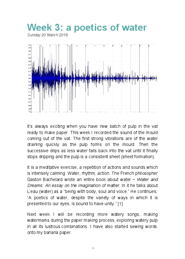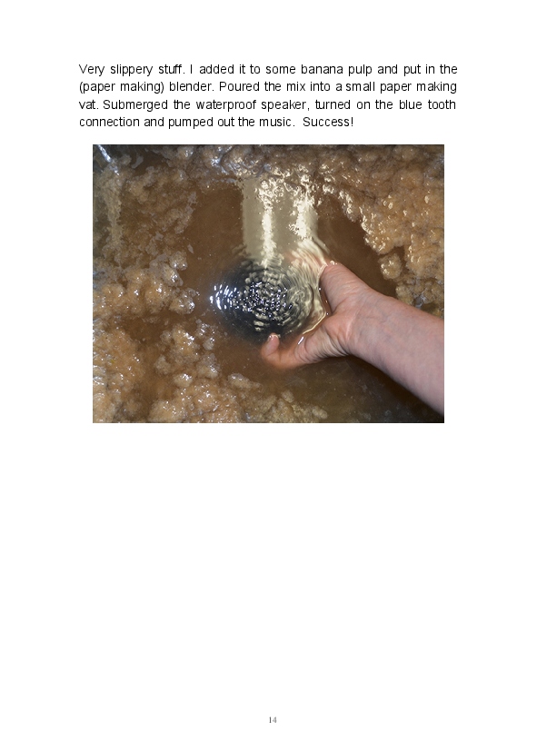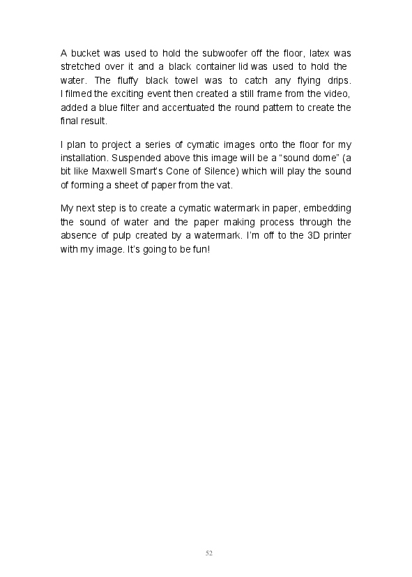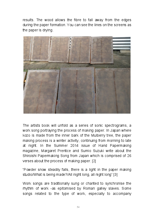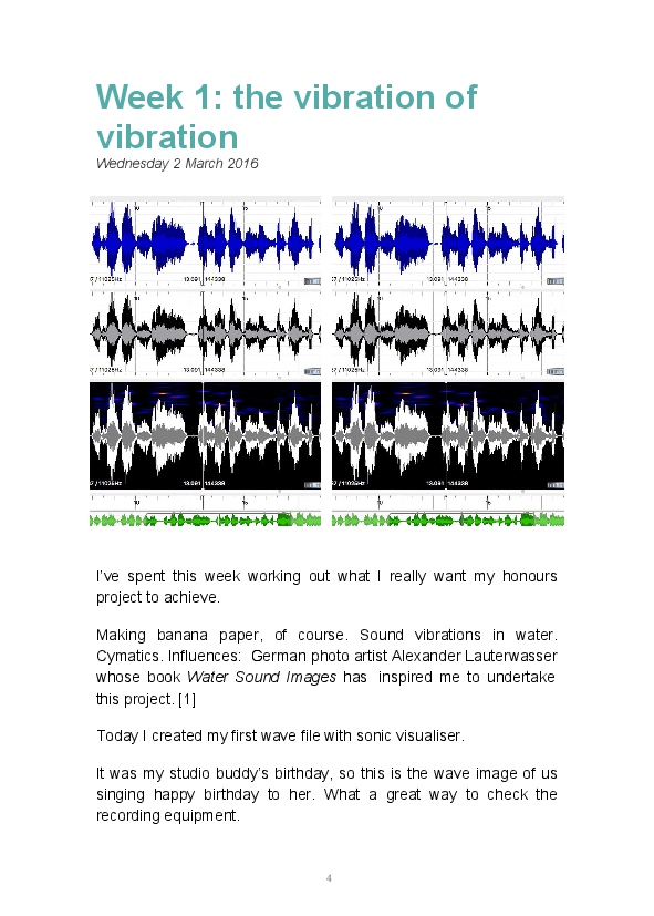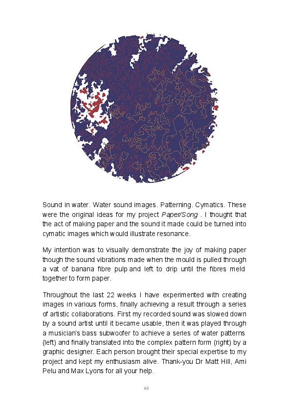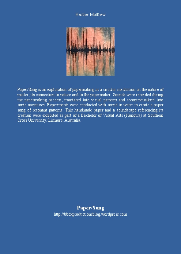 Paper/Song is an exploration of papermaking as a circular meditation on the nature of matter, its connection to nature and to the papermaker. Sounds were recorded during the papermaking process, translated into visual patterns and recontextualised into sonic narratives. Experiments were conducted with sound in water to create a paper song of resonant patterns. This handmade paper and a soundscape referencing its creation were exhibited as part of a Bachelor of Visual Arts (Honours) at Southern Cross University, Lismore, Australia.
