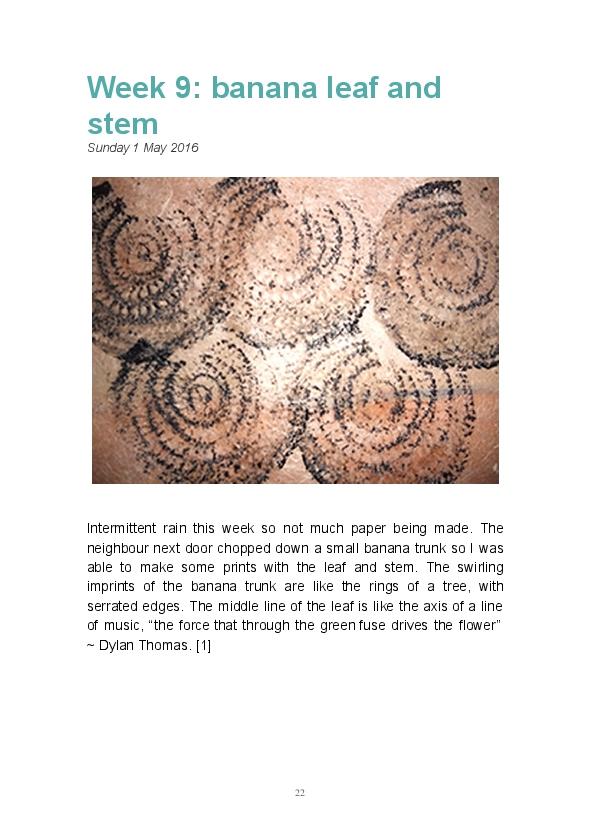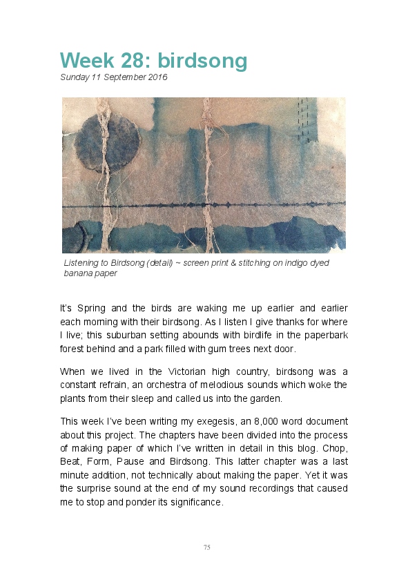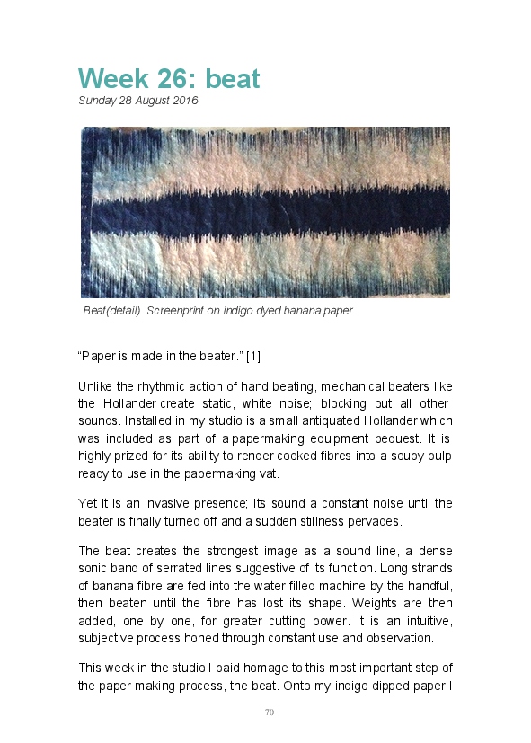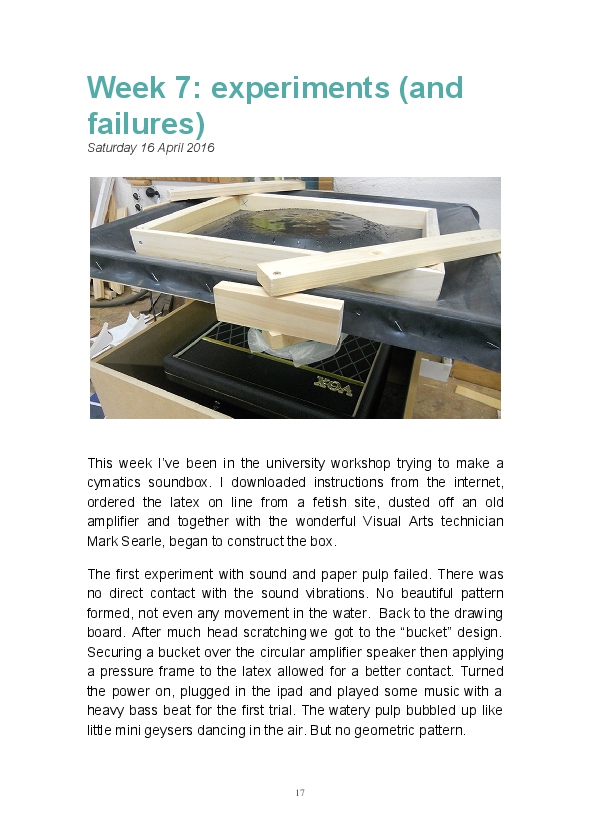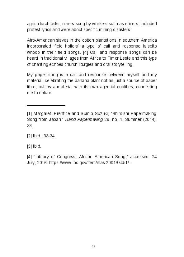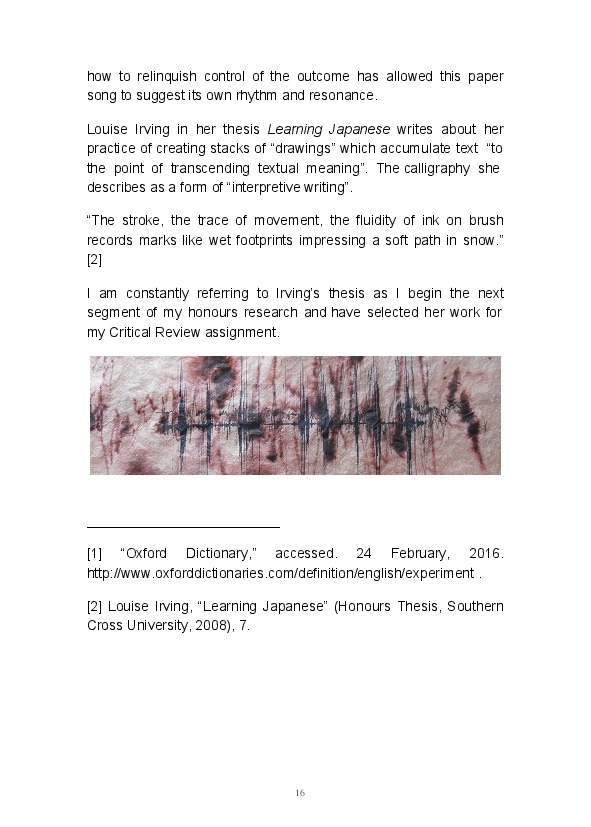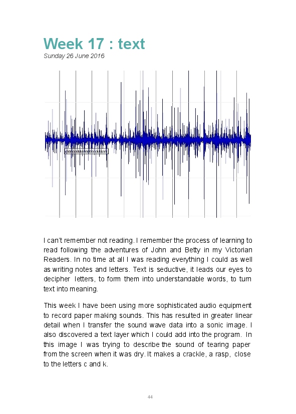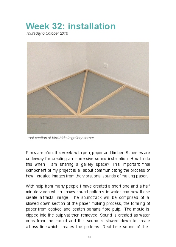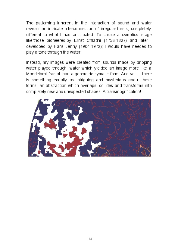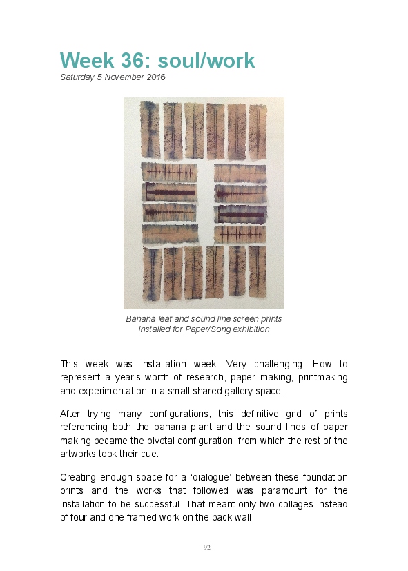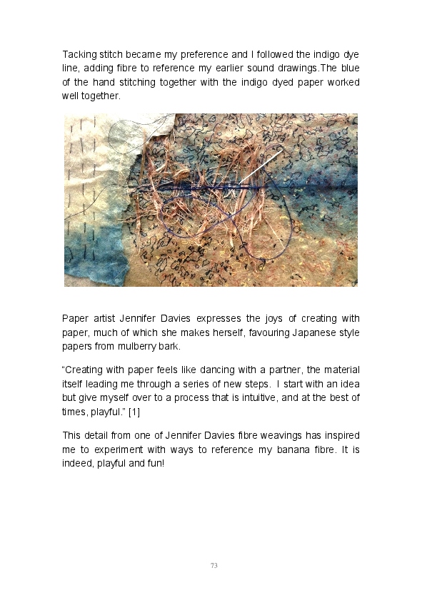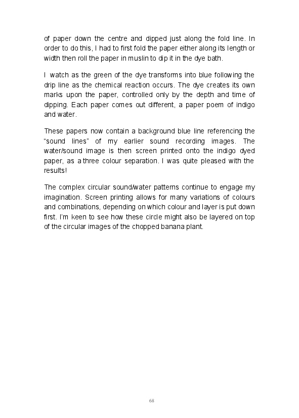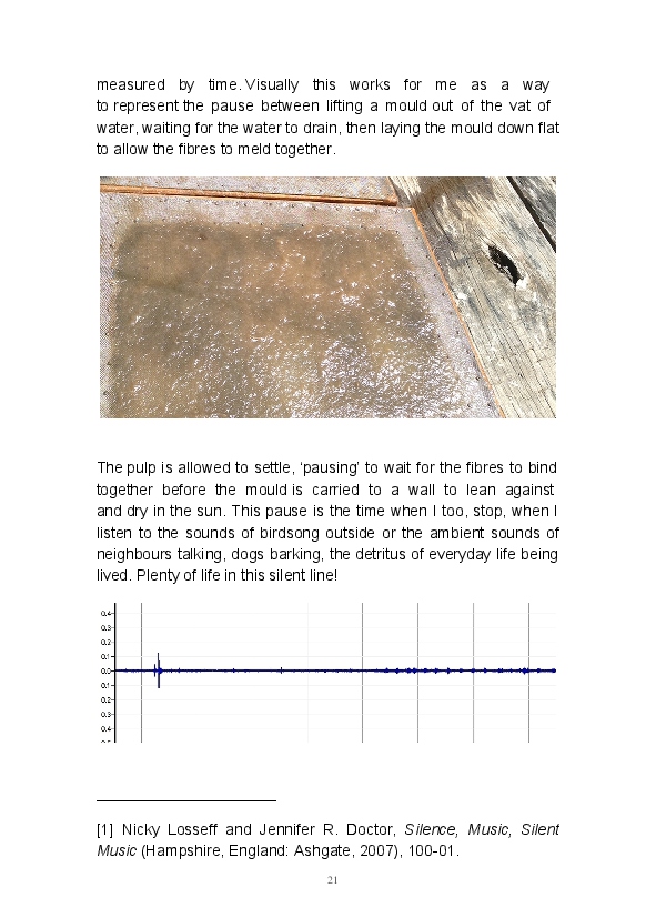 Paper/Song is an exploration of papermaking as a circular meditation on the nature of matter, its connection to nature and to the papermaker. Sounds were recorded during the papermaking process, translated into visual patterns and recontextualised into sonic narratives. Experiments were conducted with sound in water to create a paper song of resonant patterns. This handmade paper and a soundscape referencing its creation were exhibited as part of a Bachelor of Visual Arts (Honours) at Southern Cross University, Lismore, Australia.
