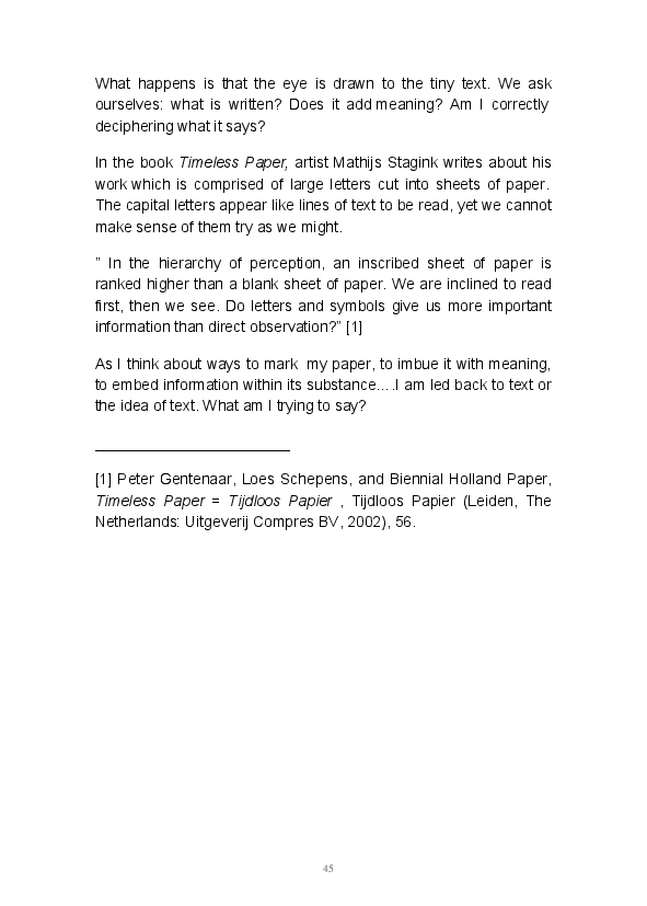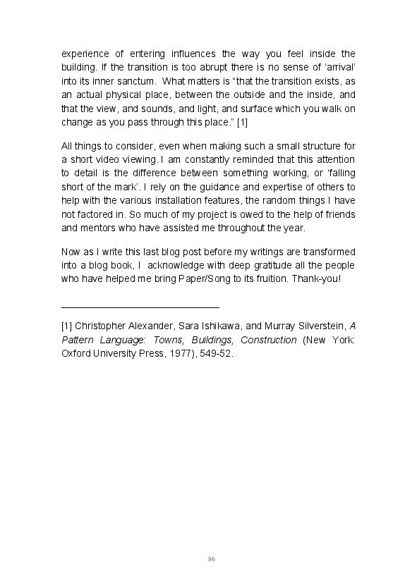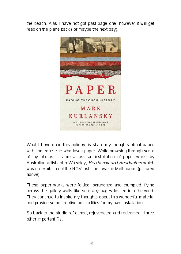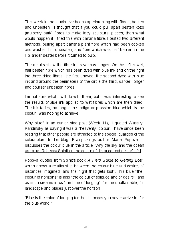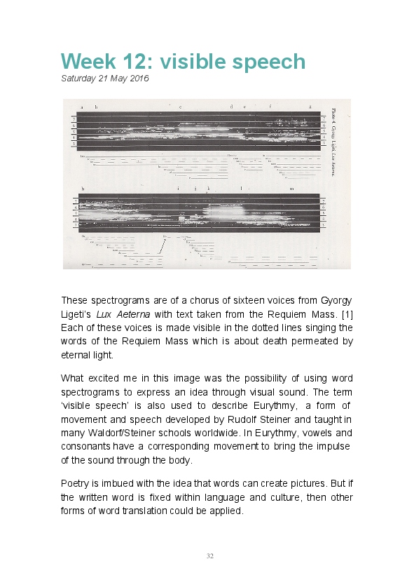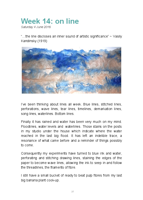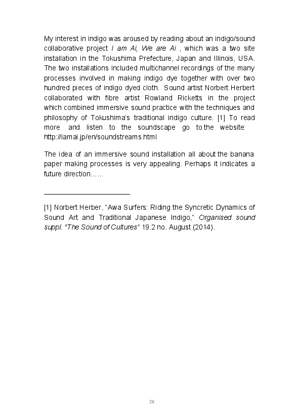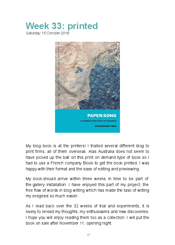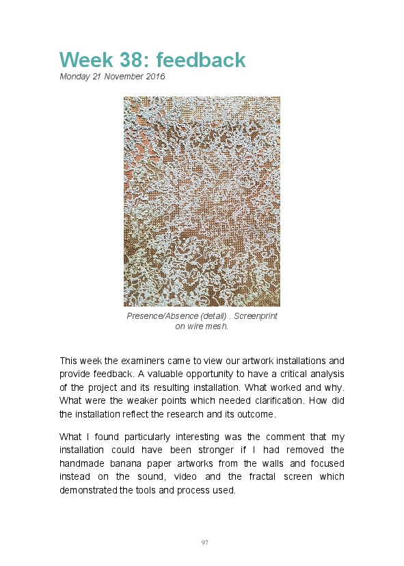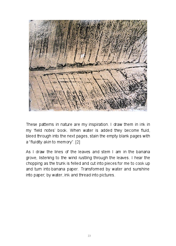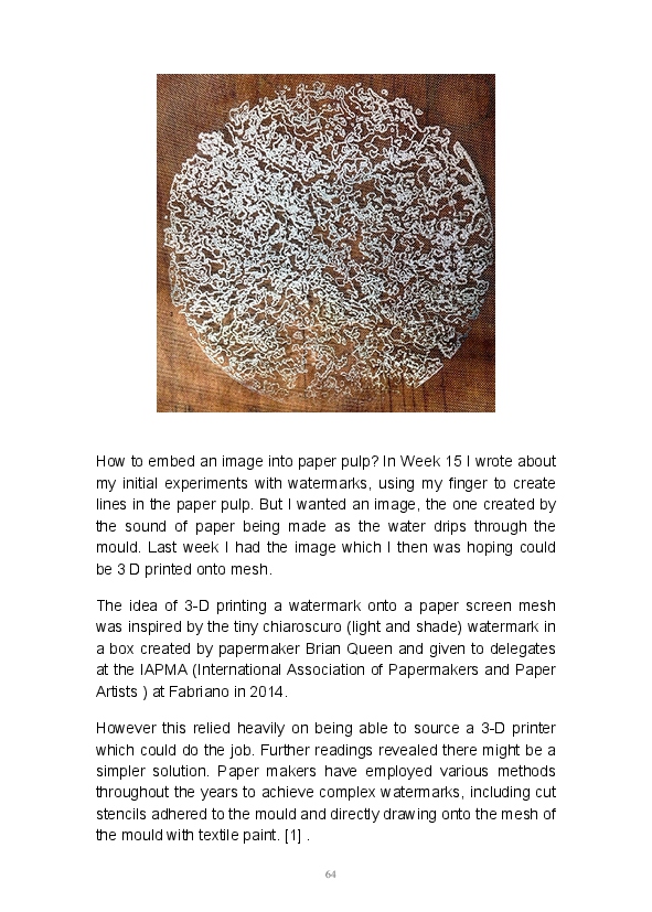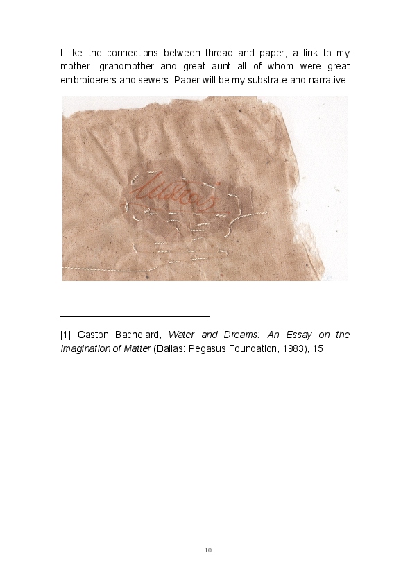 Paper/Song is an exploration of papermaking as a circular meditation on the nature of matter, its connection to nature and to the papermaker. Sounds were recorded during the papermaking process, translated into visual patterns and recontextualised into sonic narratives. Experiments were conducted with sound in water to create a paper song of resonant patterns. This handmade paper and a soundscape referencing its creation were exhibited as part of a Bachelor of Visual Arts (Honours) at Southern Cross University, Lismore, Australia.